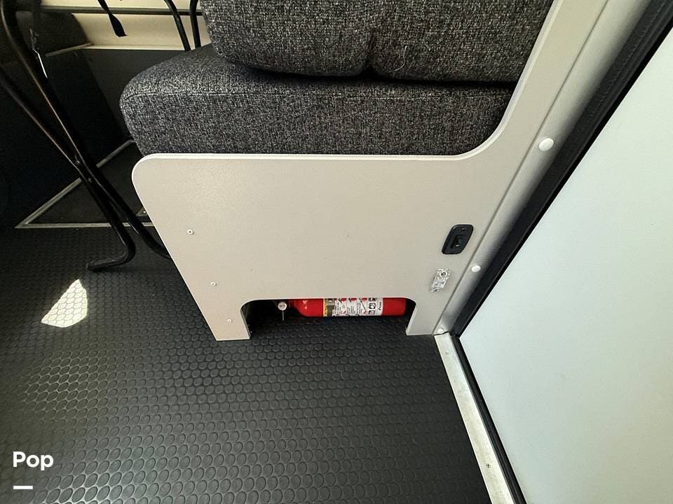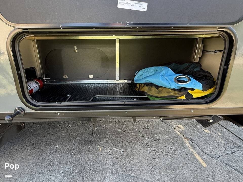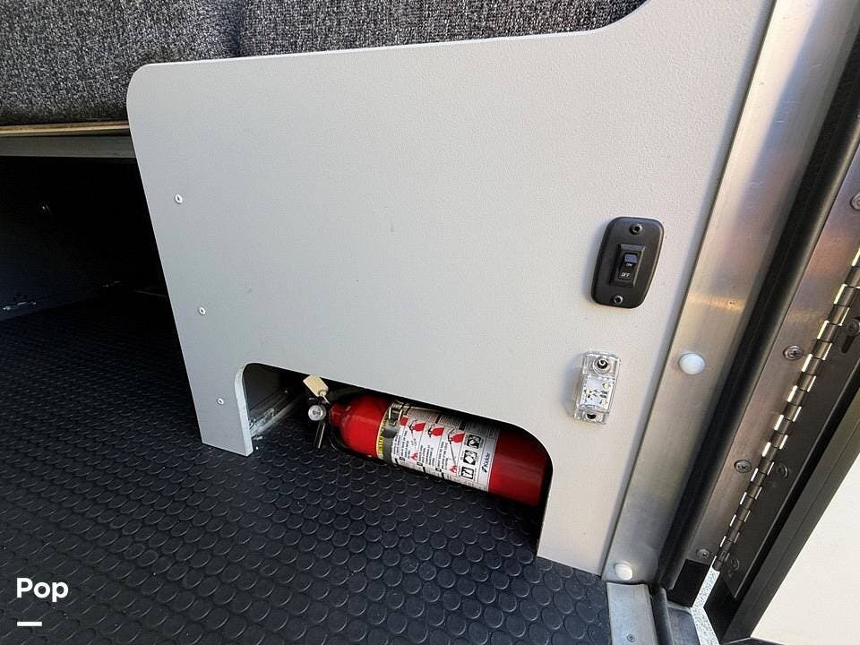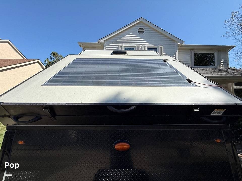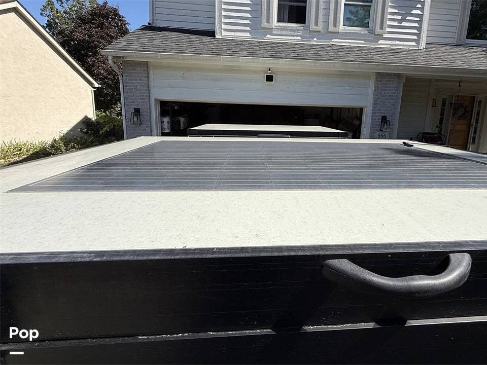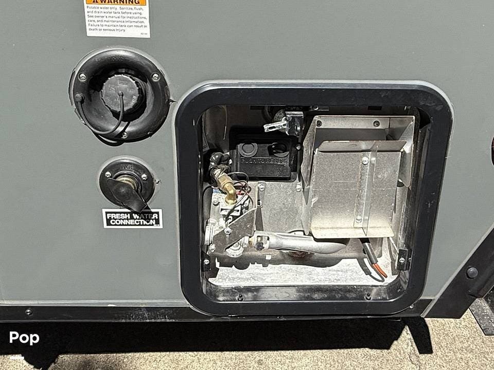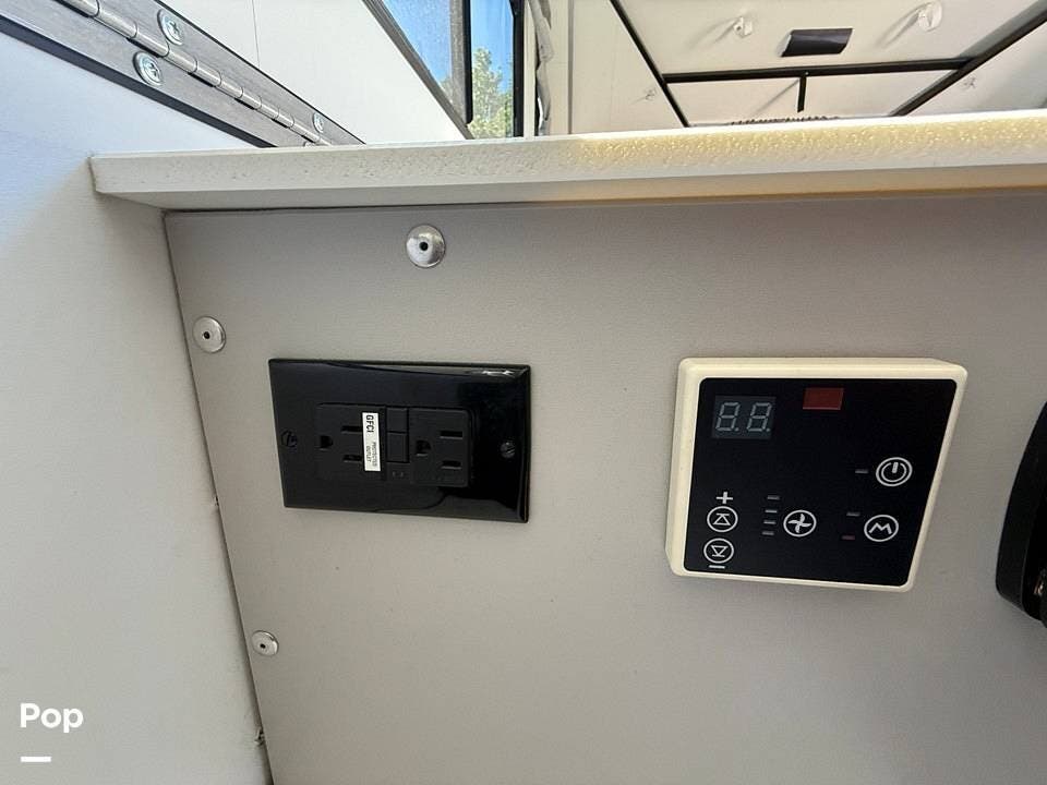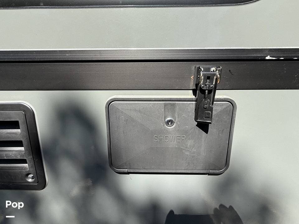Year-round comfort is ensured with a heat pump A/C unit and a 16,000 BTU furnace. The interior features durable slate gray fiberglass, Azdel composite walls, upgraded upholstery, commercial-grade flooring, and aluminum-framed cabinetry with SIMONA BOATBOARD panels.