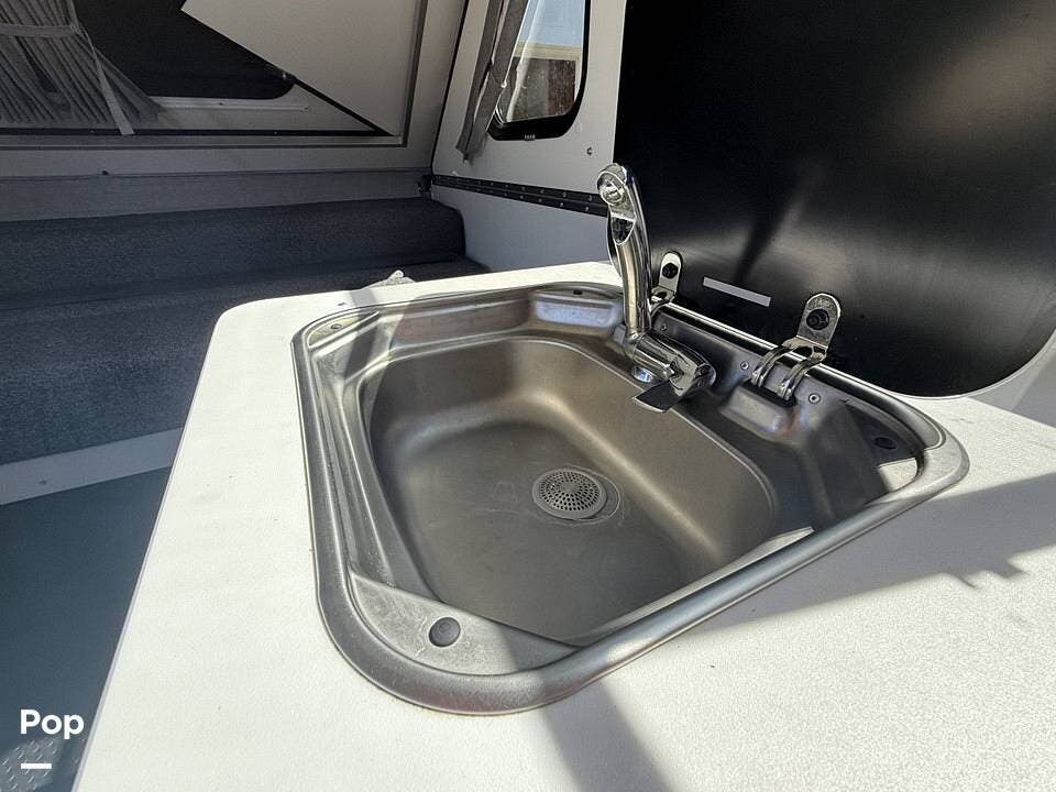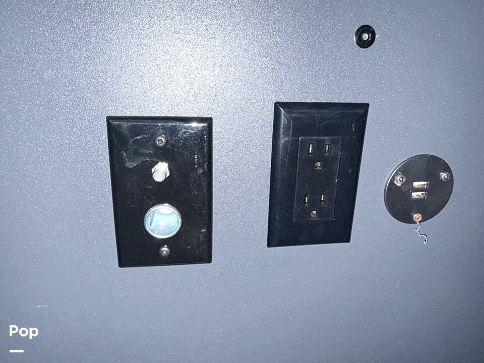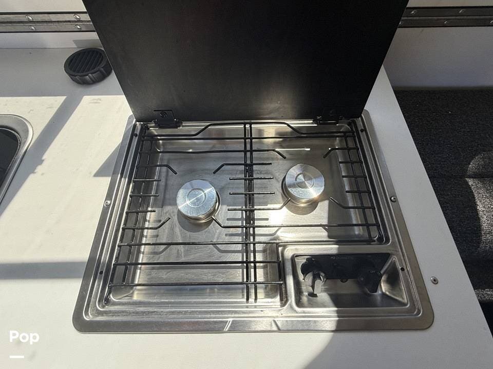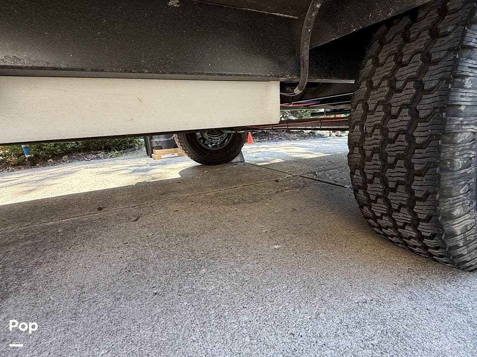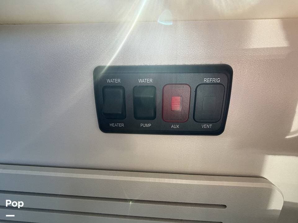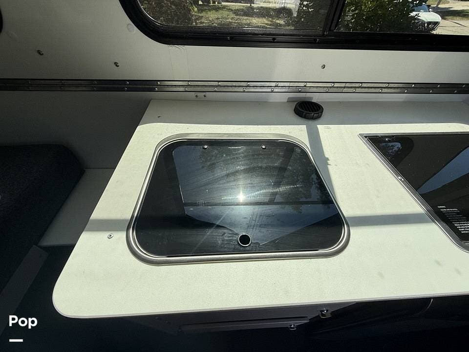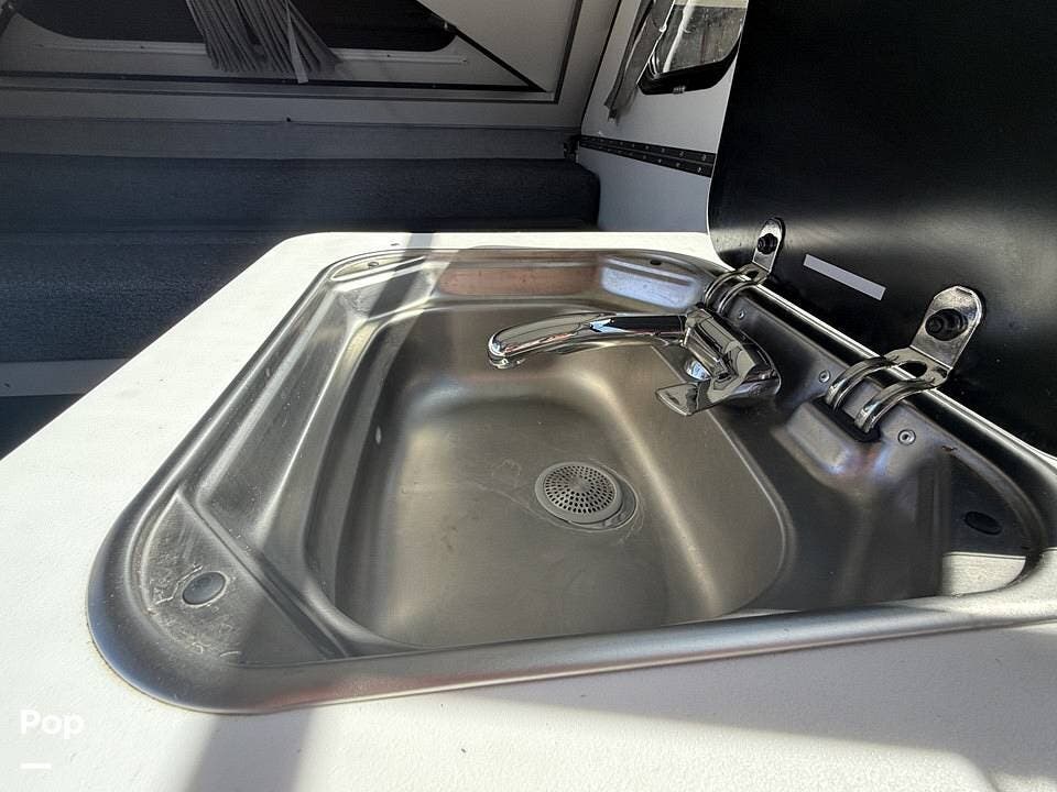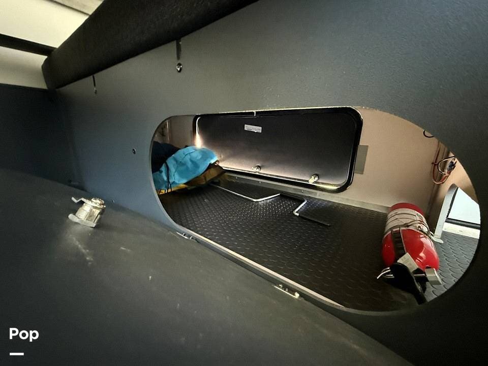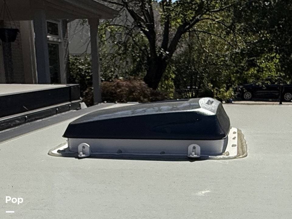 Year-round comfort is ensured with a heat pump A/C unit and a 16,000 BTU furnace. The interior features durable slate gray fiberglass, Azdel composite walls, upgraded upholstery, commercial-grade flooring, and aluminum-framed cabinetry with SIMONA BOATBOARD panels.