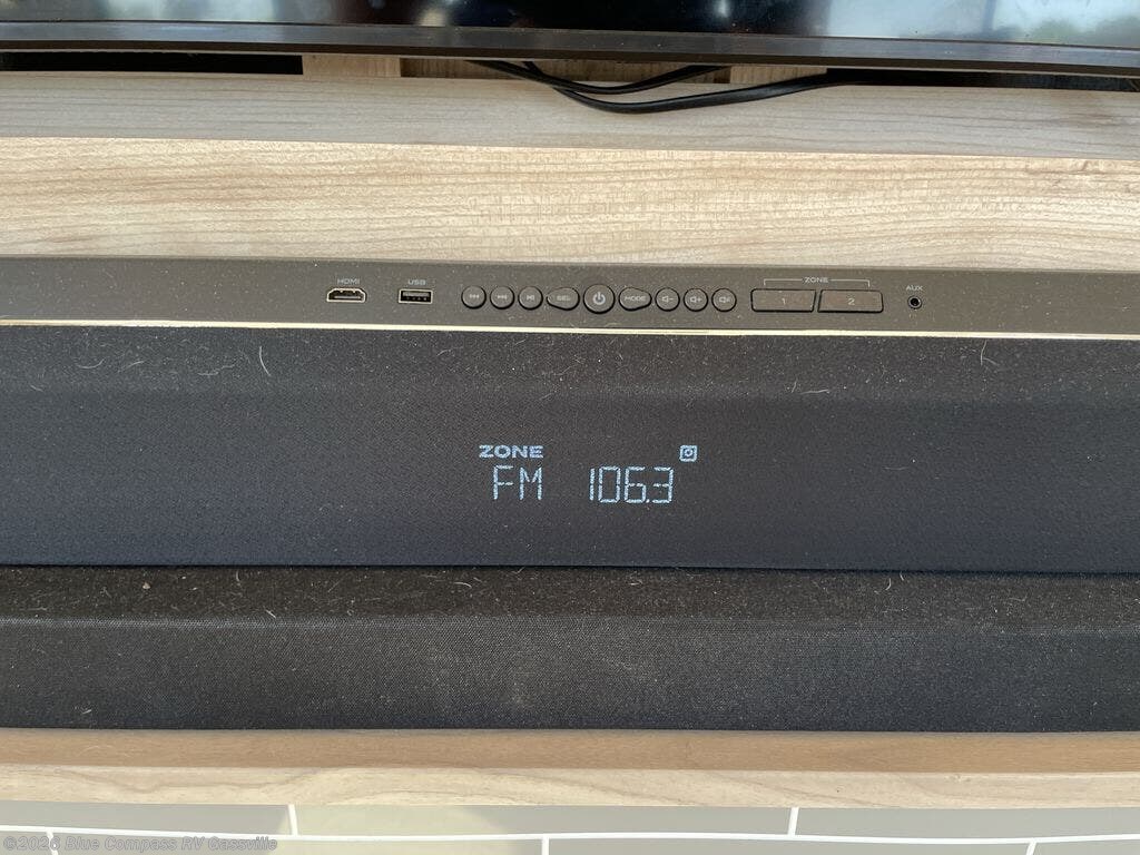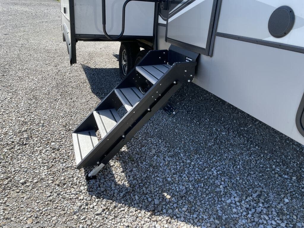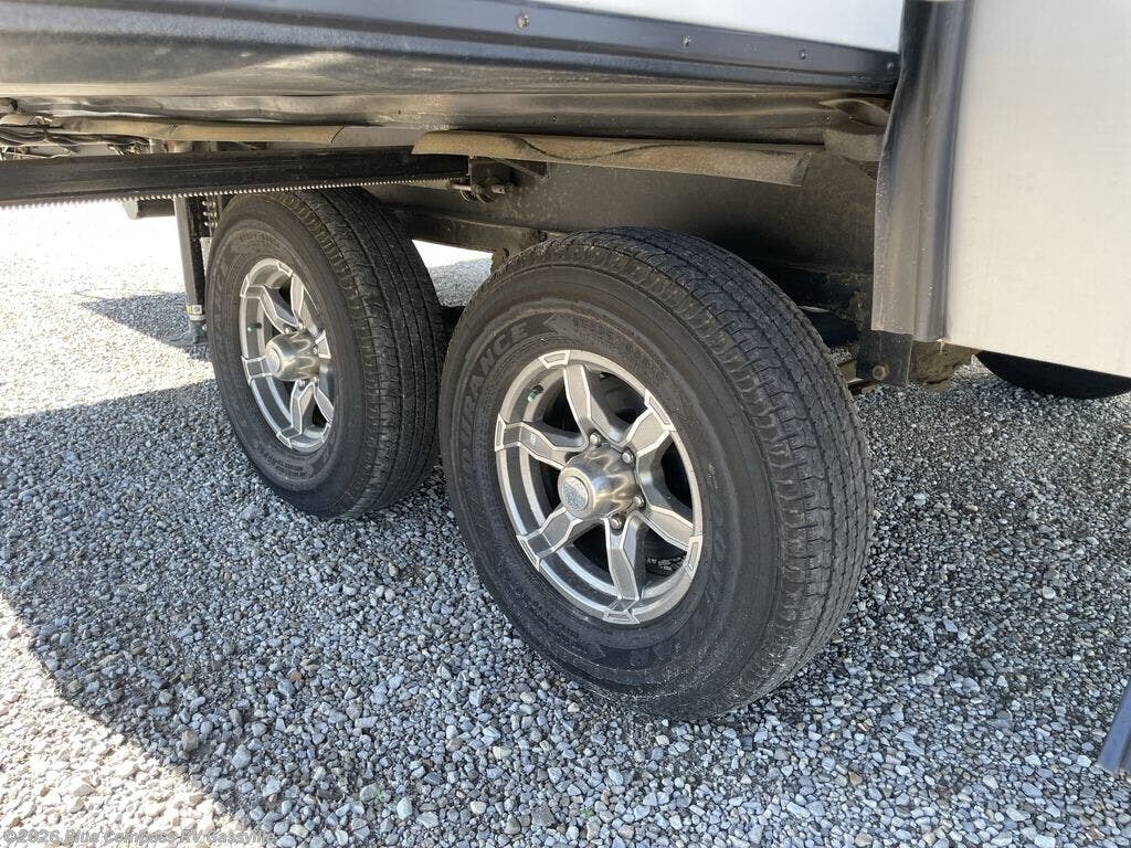 This fifth wheel has everything you will need for a comfortable camping trip! It features a kitchen island with countertop space to prepare meals that can be cooked on the three burner cooktop then enjoyed while seated at the floating dinette table that has two chairs on one side and a movable ottoman with flip up storage on the other side. You can store your dishes in the storage hutch and snacks inside one of two pantries. The front private bedroom has a queen bed and a wardrobe slide to hang your clothes, and an entrance into the dual entry bathroom. The rear living area has dual recliner theater seating across from an entertainment center which has a 50" class HDTV with hidden storage behind it and is also on a swing mount for all to see even at the rear sleeper sofa!