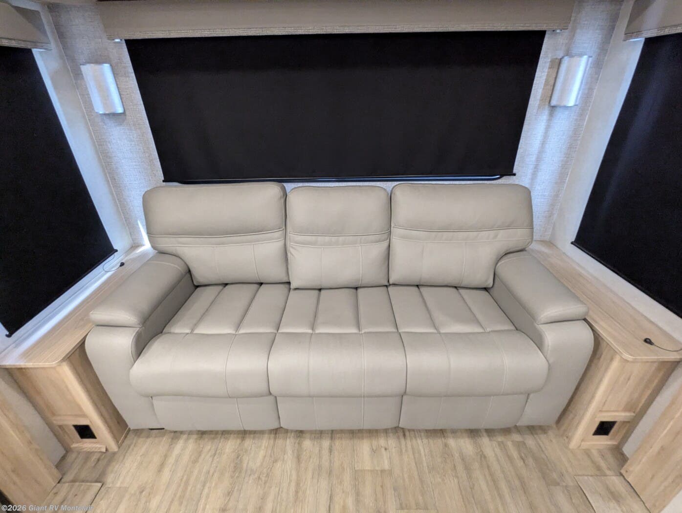 • Rear Living Room with Opposing Slides featuring theater seating, sofa, fireplace, and large entertainment center — creating a wide-open, residential-style lounge