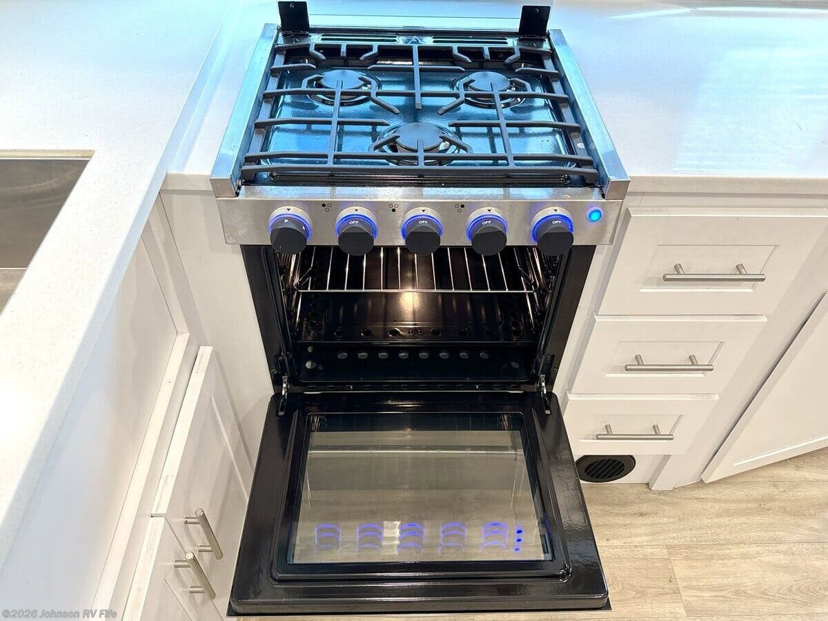 Features Include: Living Spaces, Awning LED Lighting, No Carpeting, Accent Lighting, Sofa Sleeper (vbm), MaxxFan Rain Sensor, Dining, Sink Backsplash, Range with Oven, Systems Center, Queen Bed, Overhead Storage, Nightstands, Medicine Cabinet, Vanity, Linen Storage, Shower, Toilet Mechanicals, Two 30# LP Bottles, 35k Forced Air Heat, PEX Plumbing, Benchmark Chassis, 6000# Dexter Axles, High Gloss Finish, Painted Front Cap, PVC Roofing, Slam Latch Bag Doors
