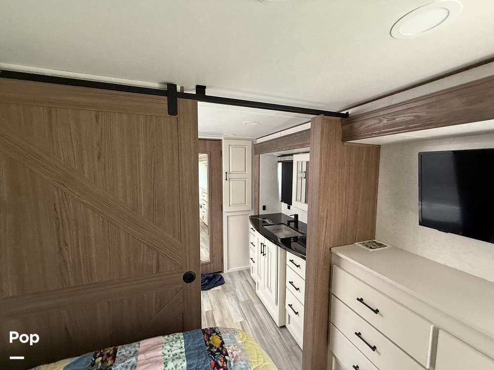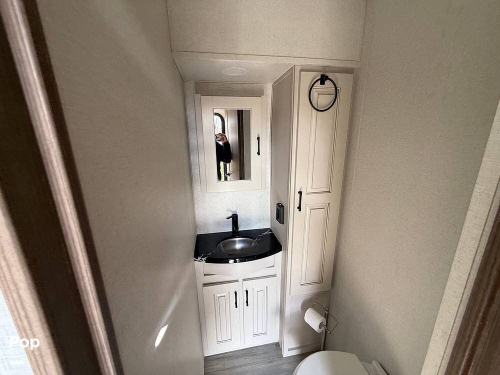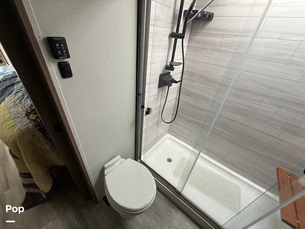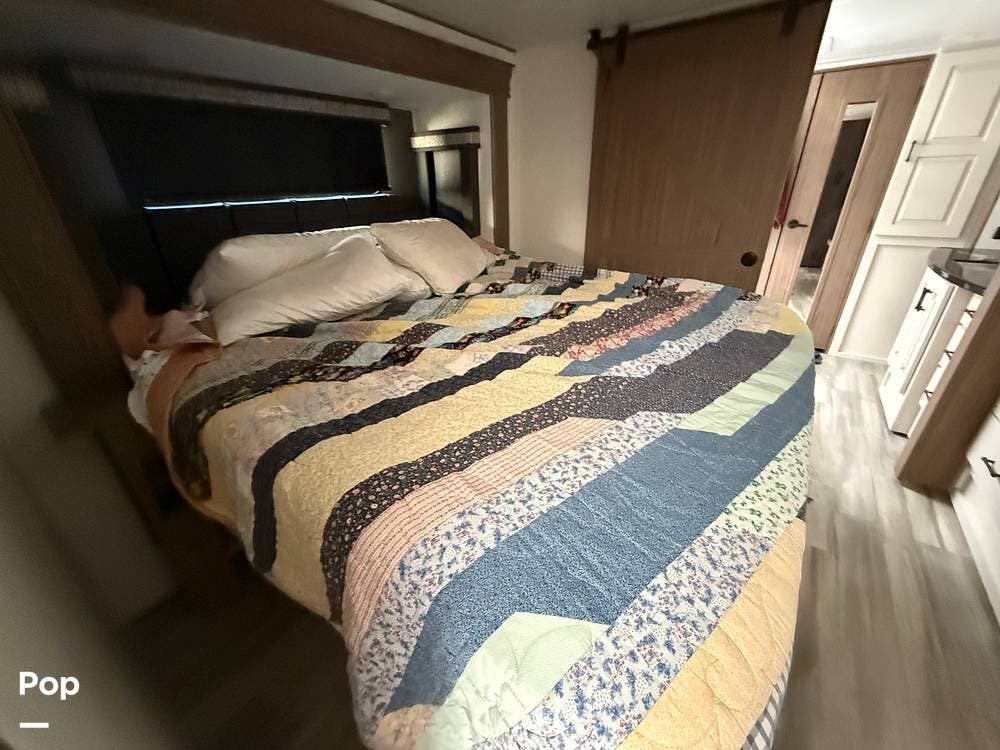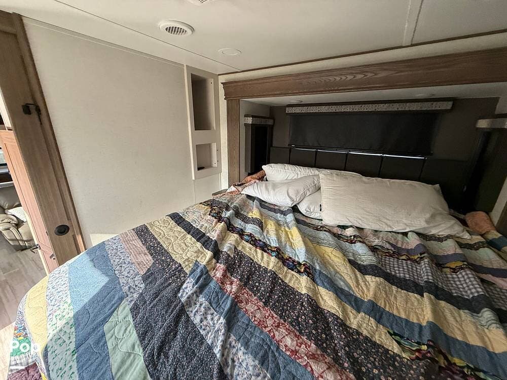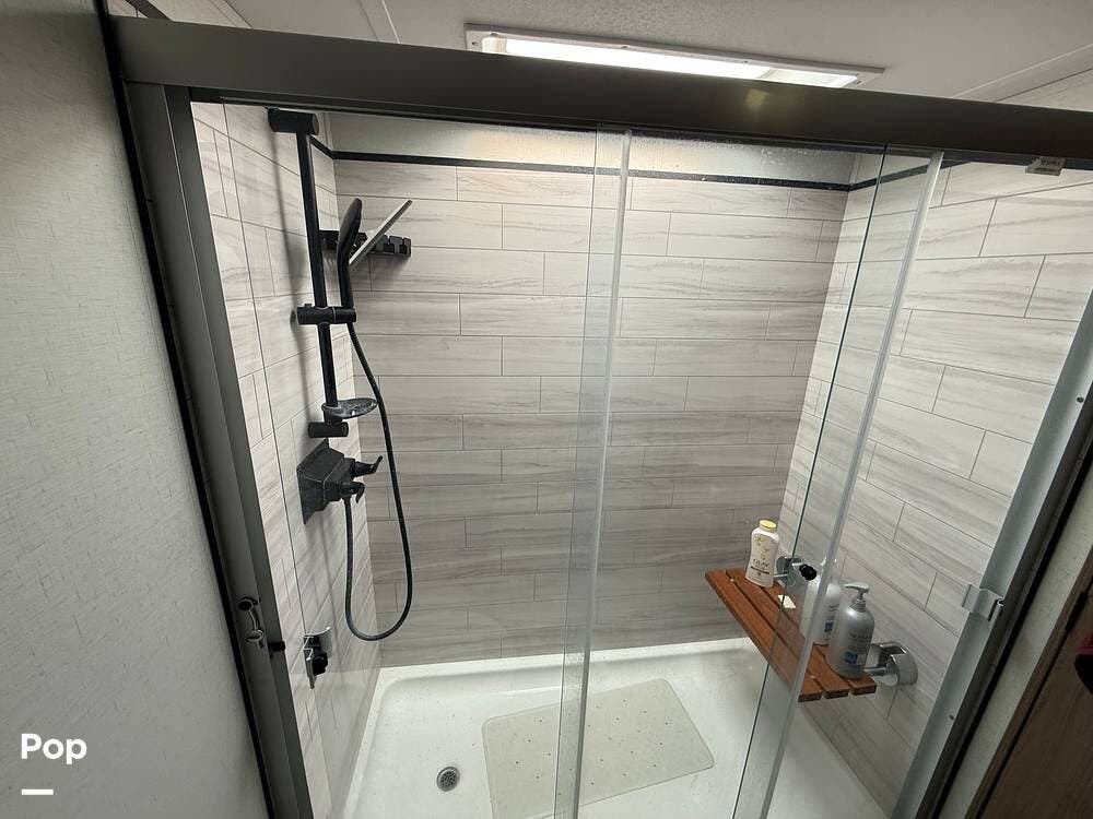 This fifth wheel includes one full bathroom with a shower, skylight, and a convenient half-bath for guests. It also has a 320-watt solar panel for off-grid living and a custom skirt for insulation and stability.