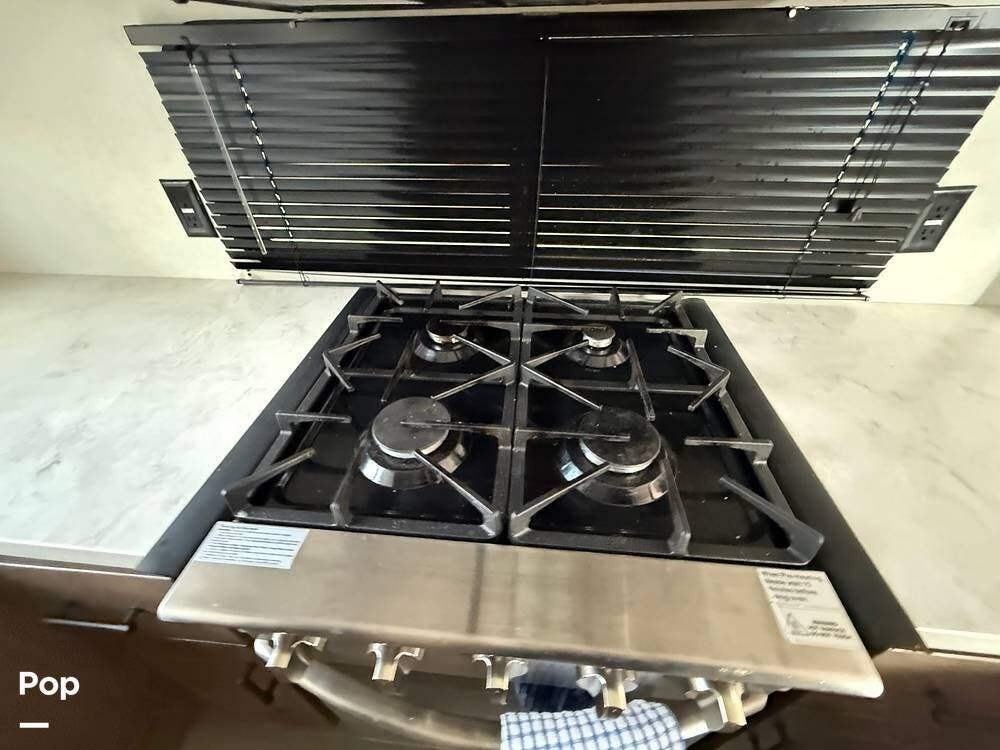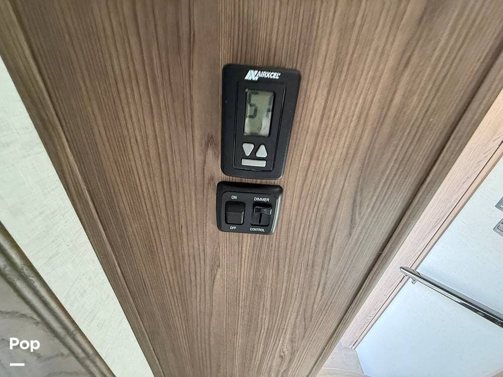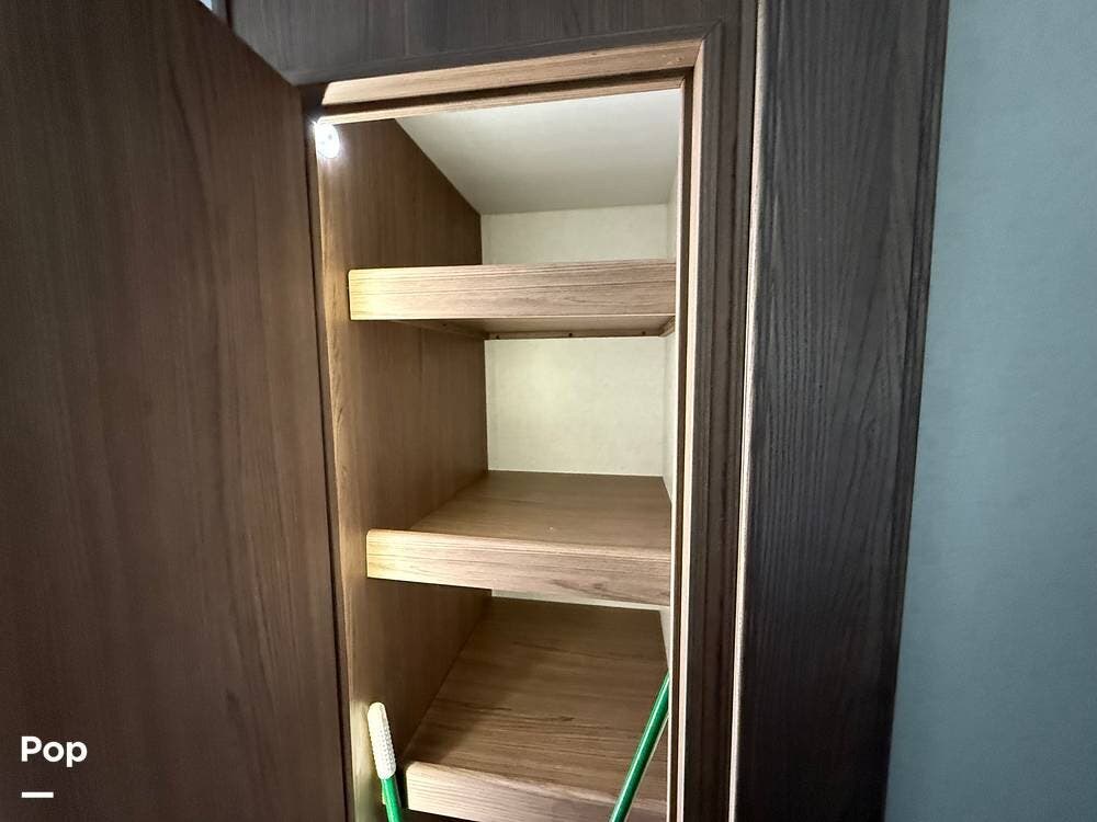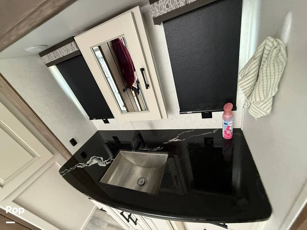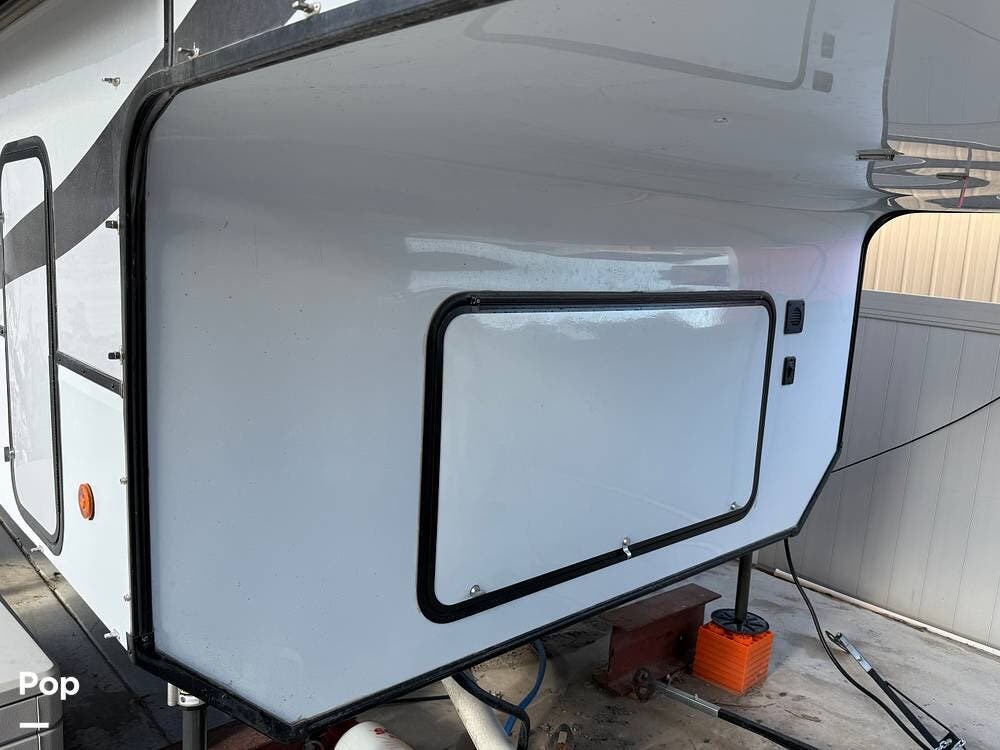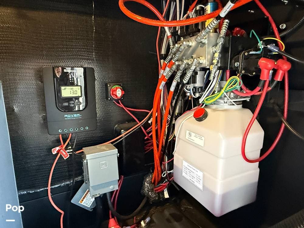 This fifth wheel includes one full bathroom with a shower, skylight, and a convenient half-bath for guests. It also has a 320-watt solar panel for off-grid living and a custom skirt for insulation and stability.