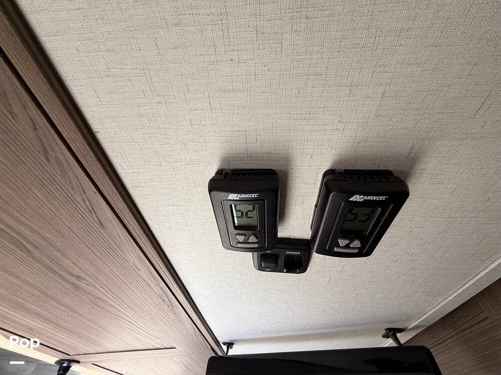 You'll find two patio awnings, exterior storage, and a porch light outside. Multiple air conditioning units ensure comfort in any weather.
