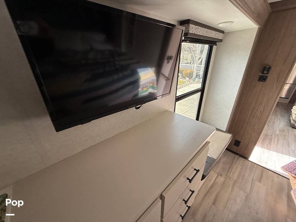 The living area features a stadium-style recliner, an entertainment center with a TV, a stereo system, Bluetooth/aux, and an exterior TV hookup. Day-night shades and tinted windows provide privacy and help control temperature.
