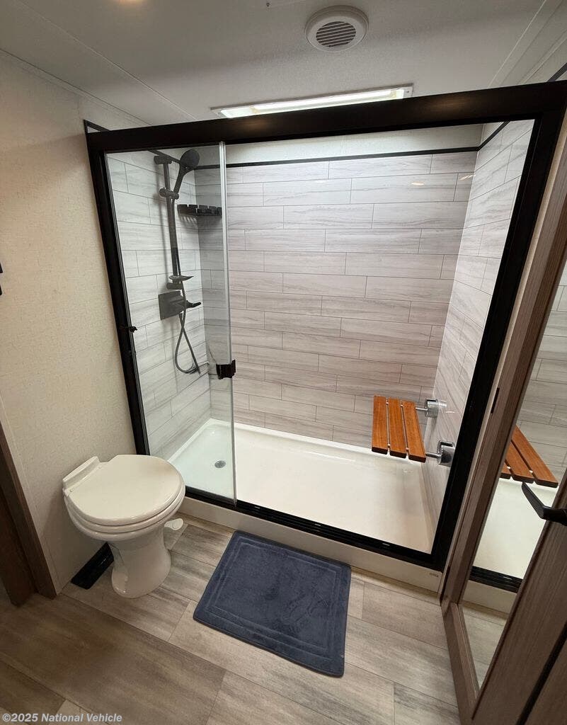 Modern Bathroom: Oversized shower with built-in seat, dual vanity sinks, porcelain toilet, and linen closet ? offering the convenience of home wherever you roam.