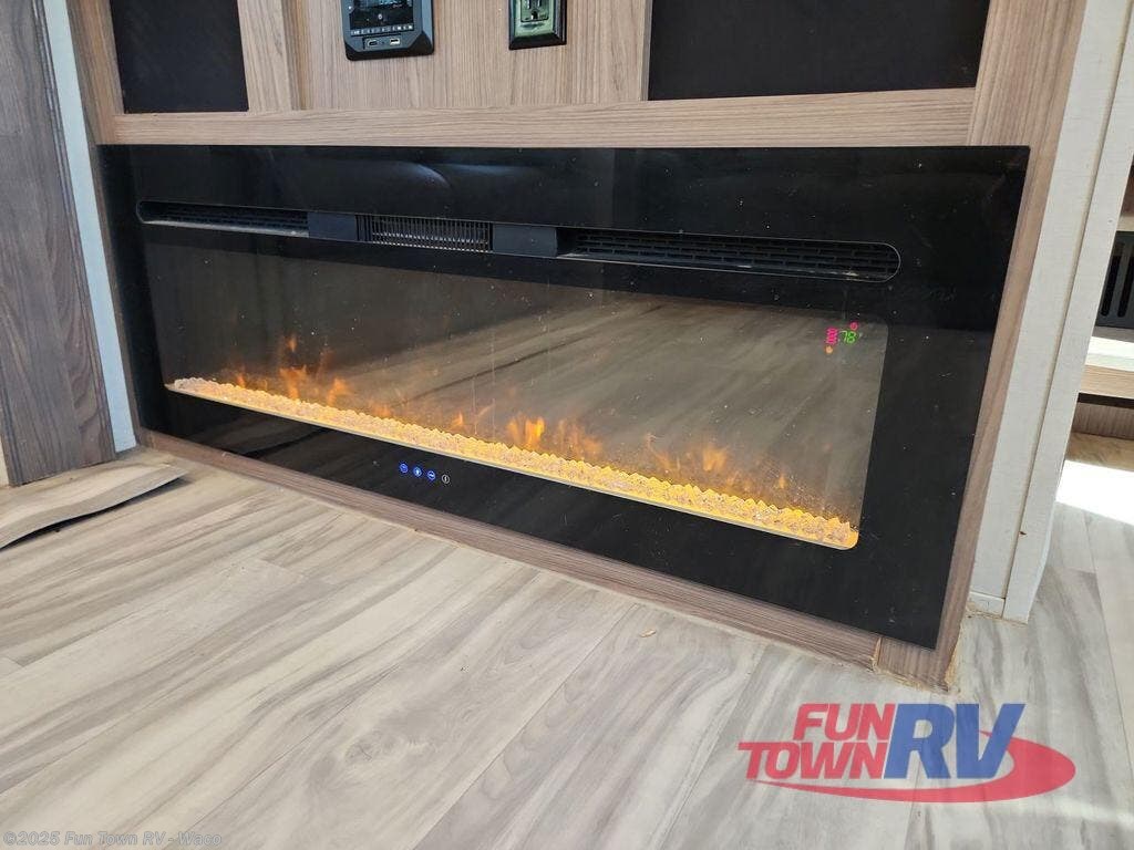 You won't want to camp any other way once you step inside this travel trailer! the chef will enjoy all of the space in the rear kitchen with ample counter space, a 19 cu. ft. 12 volt residential refrigerator, and a pantry for snacks. Everyone will love to meet in the middle living area that includes dual sleeper sofas and a dual recliner loveseat across from the 50" Smart TV and fireplace. The half bathroom is nearby for quick bathroom breaks too. You will feel right at home in the master suite with a king bed slide to lay your head on at night, a flip top dresser with a Smart TV above it to watch your movies in true comfort, and a seat with storage, plus access to the front full bathroom. Inside the bathroom, you will find a 61" x 30" shower to freshen up in and a walk-in closet with a hamper, shelves, and an area prepped to add an optional washer and dryer for clean clothes throughout your entire trip!