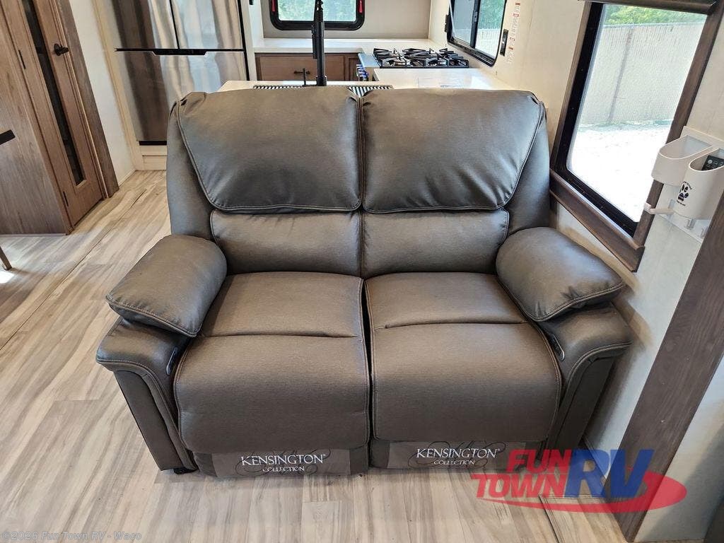 You won't want to camp any other way once you step inside this travel trailer! the chef will enjoy all of the space in the rear kitchen with ample counter space, a 19 cu. ft. 12 volt residential refrigerator, and a pantry for snacks. Everyone will love to meet in the middle living area that includes dual sleeper sofas and a dual recliner loveseat across from the 50" Smart TV and fireplace. The half bathroom is nearby for quick bathroom breaks too. You will feel right at home in the master suite with a king bed slide to lay your head on at night, a flip top dresser with a Smart TV above it to watch your movies in true comfort, and a seat with storage, plus access to the front full bathroom. Inside the bathroom, you will find a 61" x 30" shower to freshen up in and a walk-in closet with a hamper, shelves, and an area prepped to add an optional washer and dryer for clean clothes throughout your entire trip!