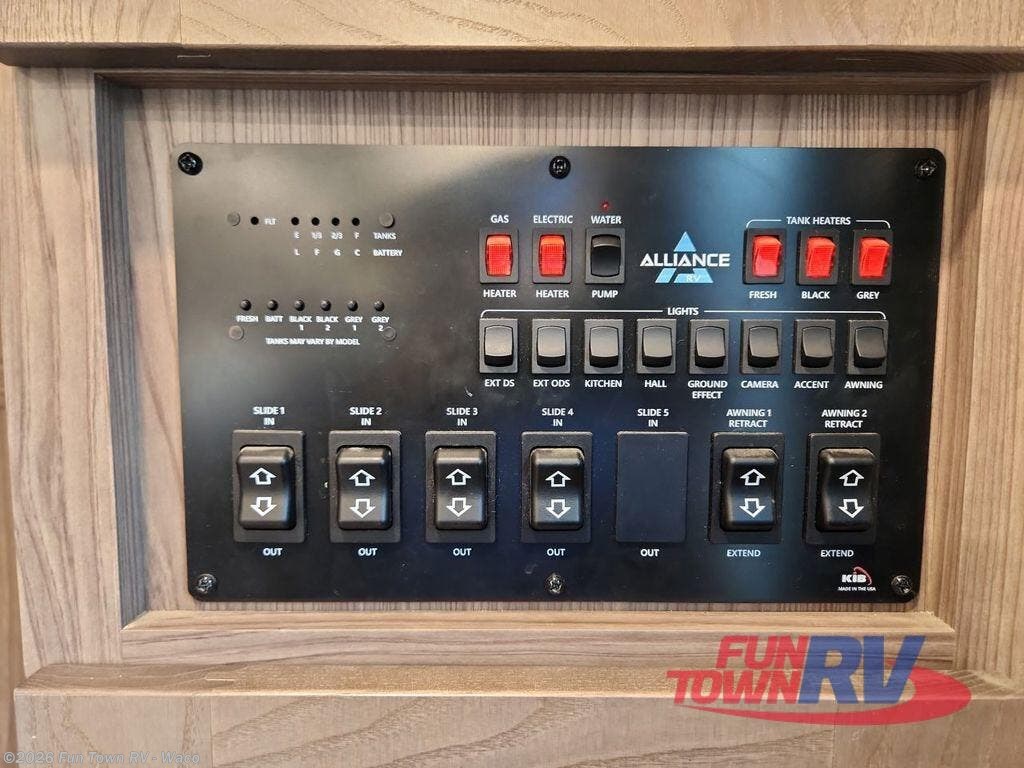 The Paradigm fifth wheels by Alliance RV are functional, high-quality, and luxurious for an unforgettable camping experience. There are three A/C units and a 40K BTU furnace to keep you comfortable year around, and you'll appreciate additional convenient amenities, like the all-in-one enclosed/heated utility center and the color coded and numbered wiring. A Roto-Flex pin box comes standard for hassle-free towing, along with Super-G 4,400 lb. rated tires and Dexter 7,000 lb. axles. You'll love the kitchen with its LG solid surface countertops and Insignia range, plus there is LED motion lighting in the pantry and a Maxx fan with a rain sensor to keep everything fresh when making dinner. Each model also includes an HD Smart TV in the living room and bedroom, plus a Winegard Air 360 antenna to keep you connected to the outside world. And of course there are a variety of options you can choose from to further customize your fifth wheel; dual pane windows, Super Solar Plus, slide out awning toppers, and generator prep or a generator to name a few!
