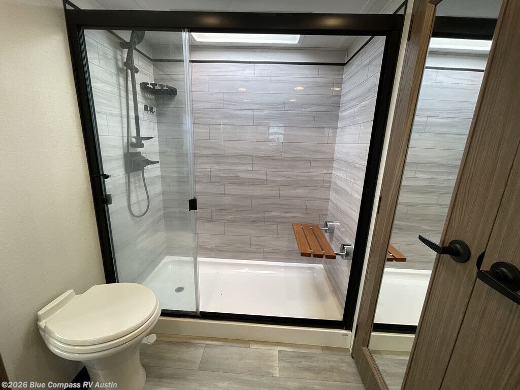 You won't want to camp any other way once you step inside this travel trailer! the chef will enjoy all of the space in the rear kitchen with ample counter space, a 19 cu. ft. 12 volt residential refrigerator, and a pantry for snacks. Everyone will love to meet in the middle living area that includes dual sleeper sofas and a dual recliner loveseat across from the 50" Smart TV and fireplace. The half bathroom is nearby for quick bathroom breaks too. You will feel right at home in the master suite with a king bed slide to lay your head on at night, a flip top dresser with a Smart TV above it to watch your movies in true comfort, and a seat with storage, plus access to the front full bathroom. Inside the bathroom, you will find a 61" x 30" shower to freshen up in and a walk-in closet with a hamper, shelves, and an area prepped to add an optional washer and dryer for clean clothes throughout your entire trip!