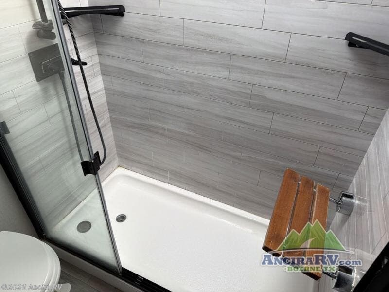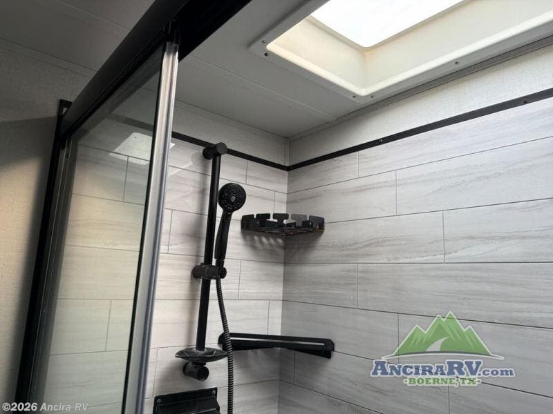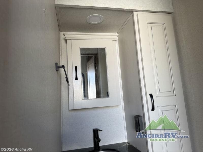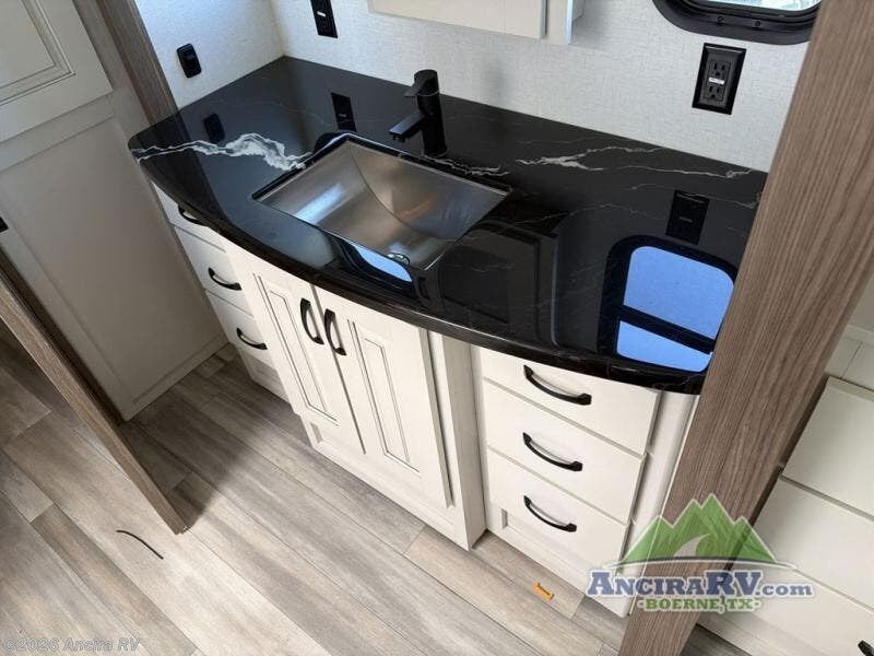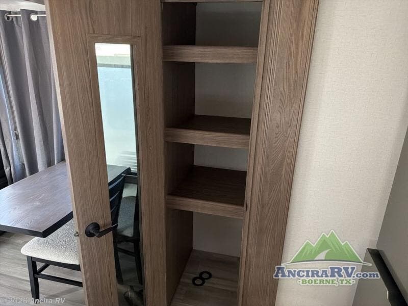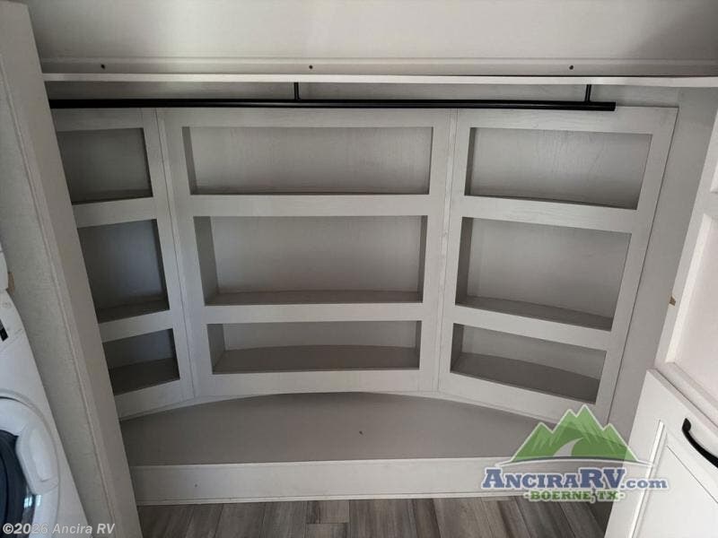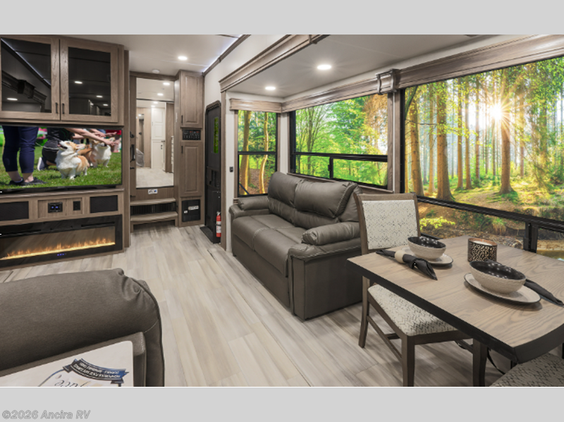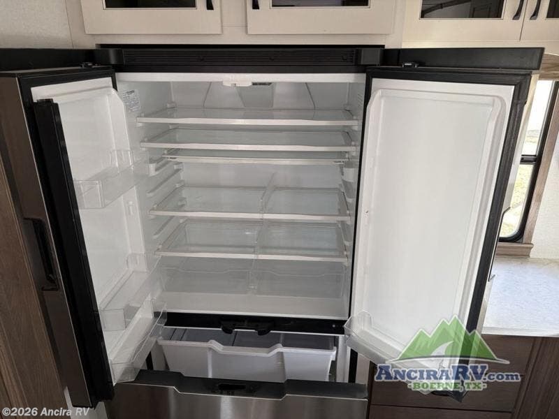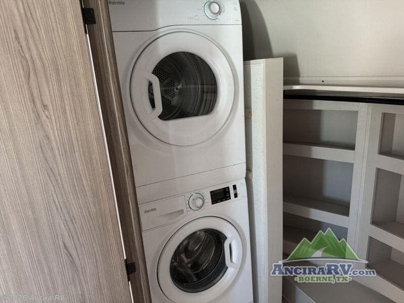 You won't want to camp any other way once you step inside this travel trailer! the chef will enjoy all of the space in the rear kitchen with ample counter space, a 19 cu. ft. 12 volt residential refrigerator, and a pantry for snacks. Everyone will love to meet in the middle living area that includes dual sleeper sofas and a dual recliner loveseat across from the 50" Smart TV and fireplace. The half bathroom is nearby for quick bathroom breaks too. You will feel right at home in the master suite with a king bed slide to lay your head on at night, a flip top dresser with a Smart TV above it to watch your movies in true comfort, and a seat with storage, plus access to the front full bathroom. Inside the bathroom, you will find a 61" x 30" shower to freshen up in and a walk-in closet with a hamper, shelves, and an area prepped to add an optional washer and dryer for clean clothes throughout your entire trip!