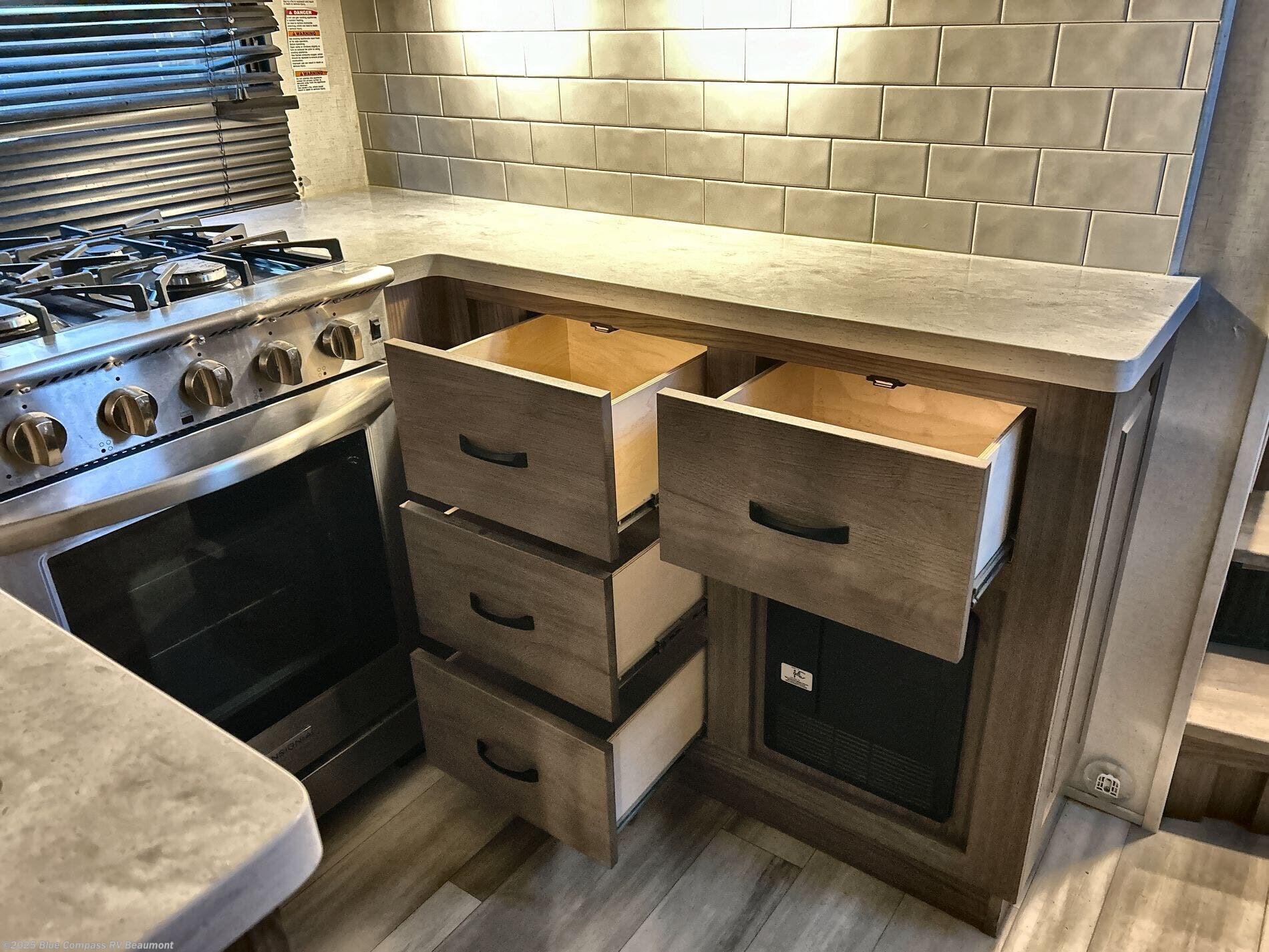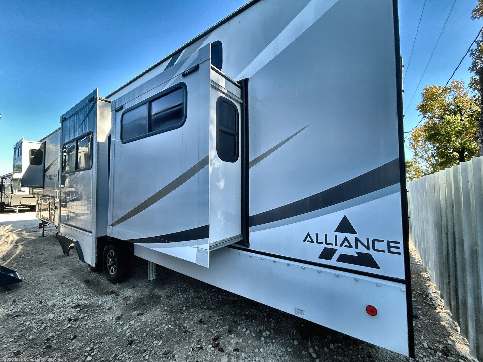 The Paradigm fifth wheels by Alliance RV are functional, high-quality, and luxurious for an unforgettable camping experience. There are three A/C units and a 40K BTU furnace to keep you comfortable year around, and you'll appreciate additional convenient amenities, like the all-in-one enclosed/heated utility center and the color coded and numbered wiring. A Roto-Flex pin box comes standard for hassle-free towing, along with Super-G 4,400 lb. rated tires and Dexter 7,000 lb. axles. You'll love the kitchen with its LG solid surface countertops and Insignia range, plus there is LED motion lighting in the pantry and a Maxx fan with a rain sensor to keep everything fresh when making dinner. Each model also includes an HD Smart TV in the living room and bedroom, plus a Winegard Air 360 antenna to keep you connected to the outside world. And of course there are a variety of options you can choose from to further customize your fifth wheel; dual pane windows, Super Solar Plus, slide out awning toppers, and generator prep or a generator to name a few!