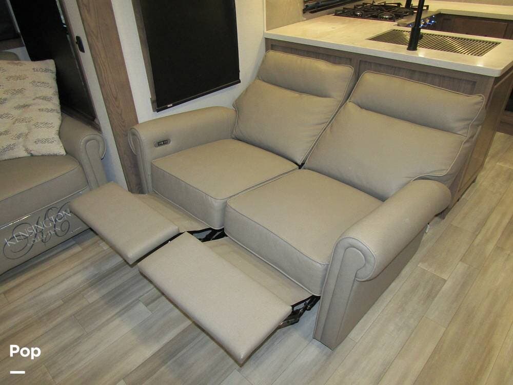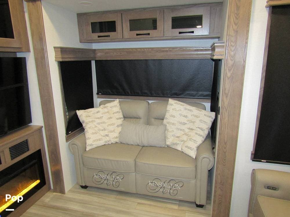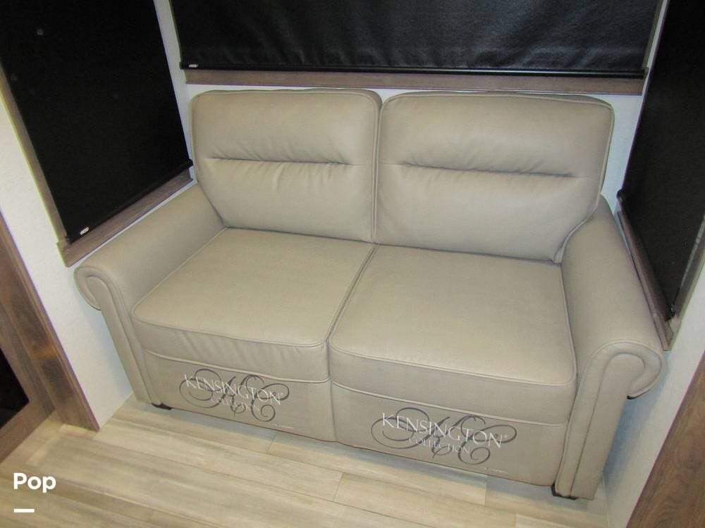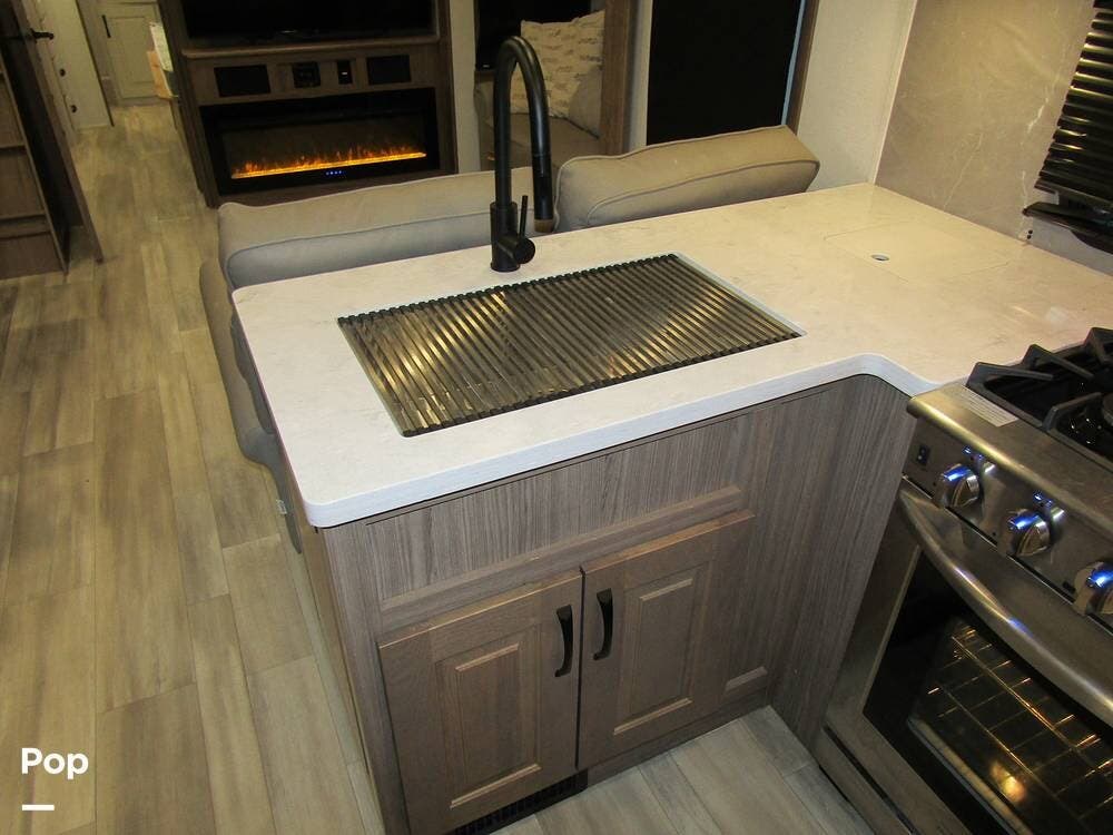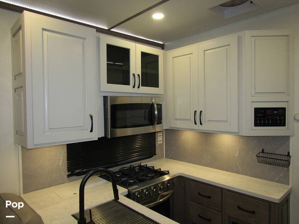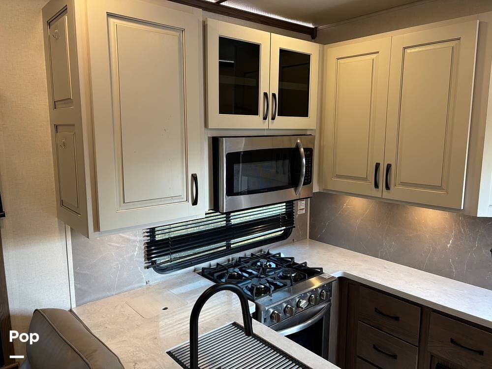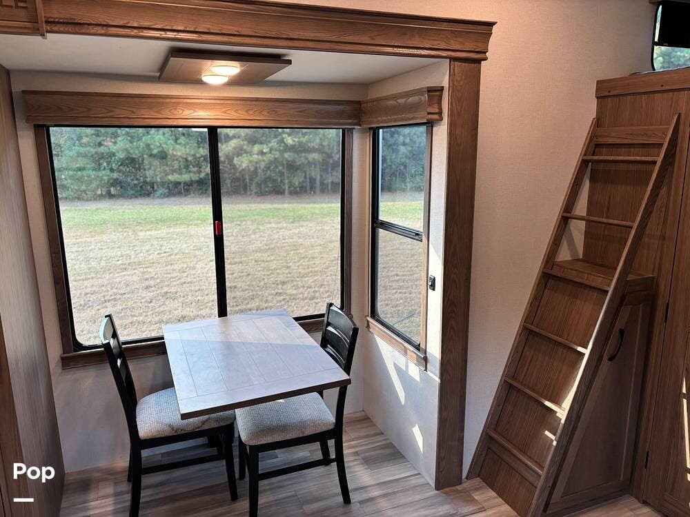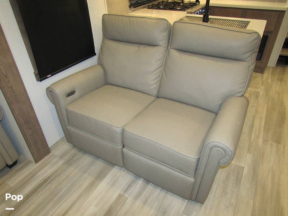 This 5th Wheel features automatic leveling, a complete kitchen with a four-chair dinette table, an entertainment center with a fireplace over a 50" flat panel smart TV, LED interior and exterior lighting, a ceiling fan with modern, stylish overhead lighting, theater seating recliners with cup holders, and a sleeper sofa.
