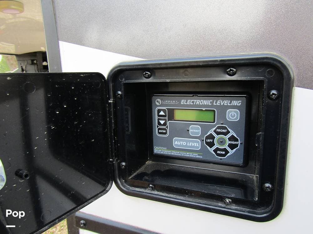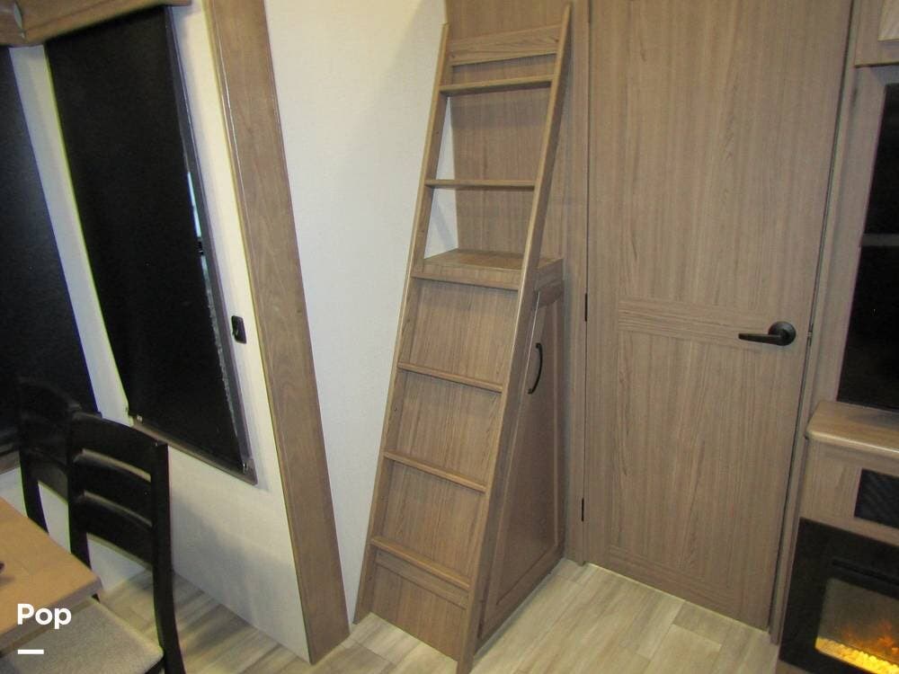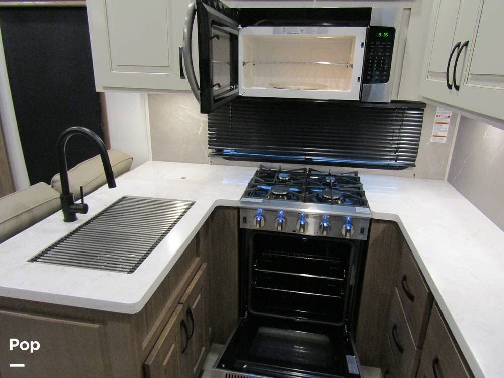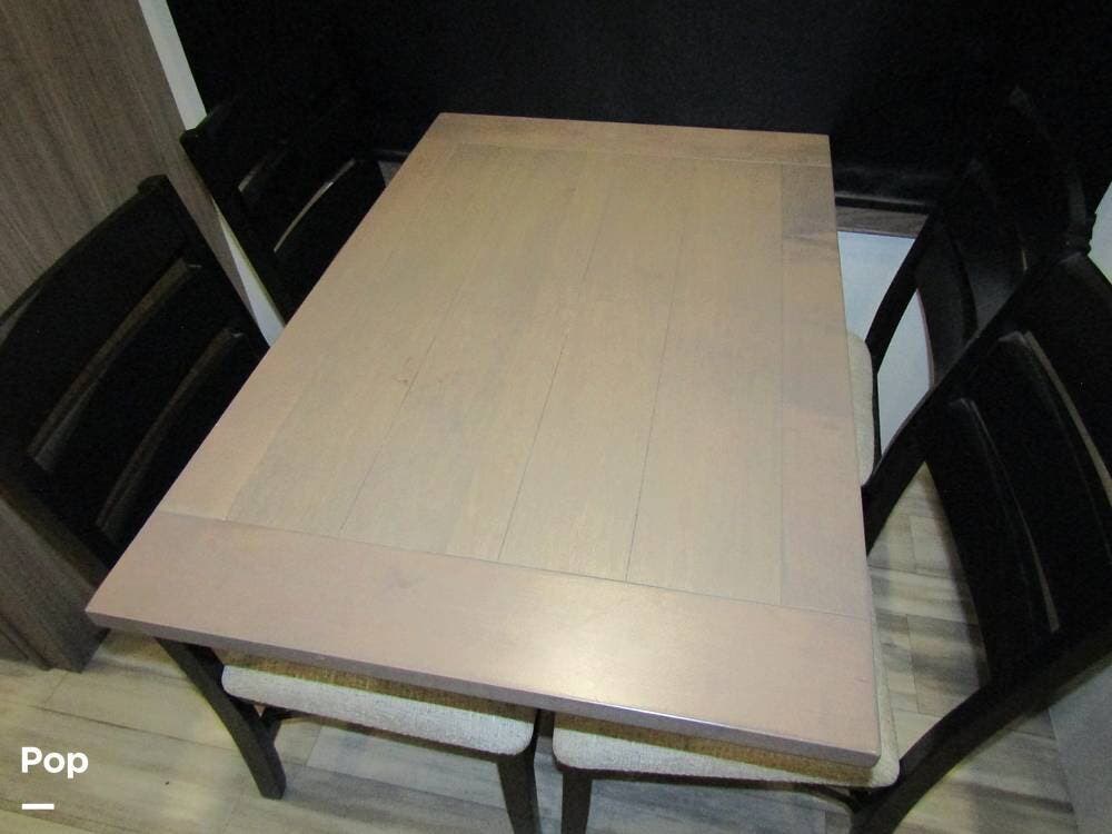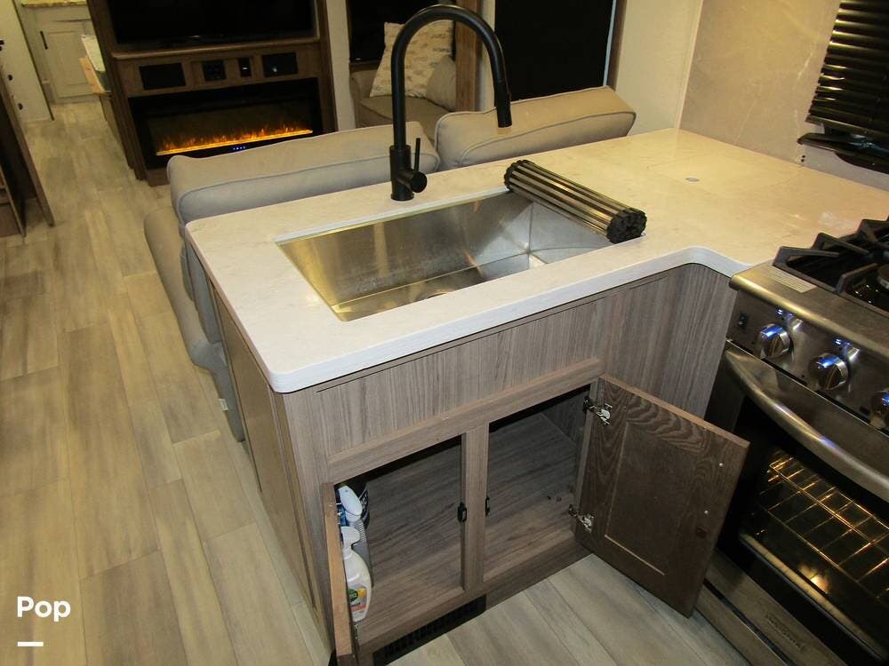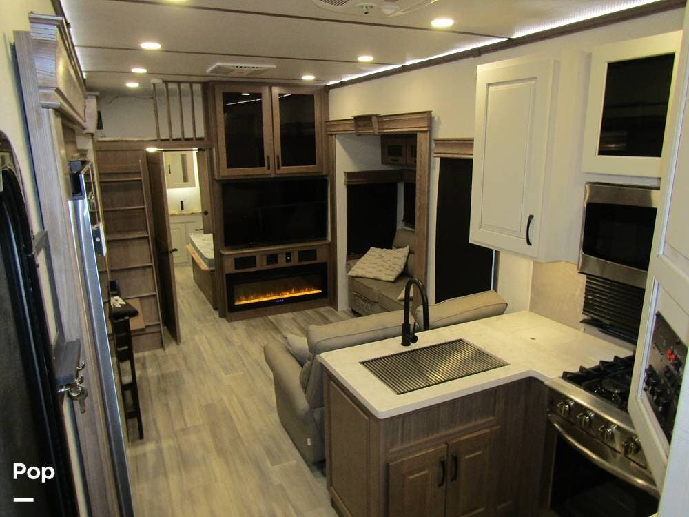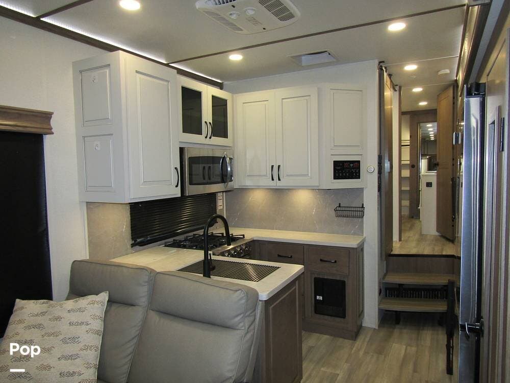 This 5th Wheel features automatic leveling, a complete kitchen with a four-chair dinette table, an entertainment center with a fireplace over a 50" flat panel smart TV, LED interior and exterior lighting, a ceiling fan with modern, stylish overhead lighting, theater seating recliners with cup holders, and a sleeper sofa.