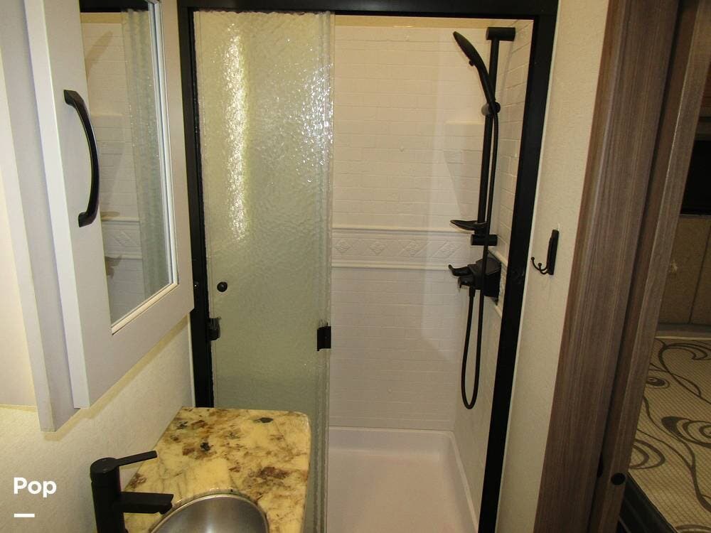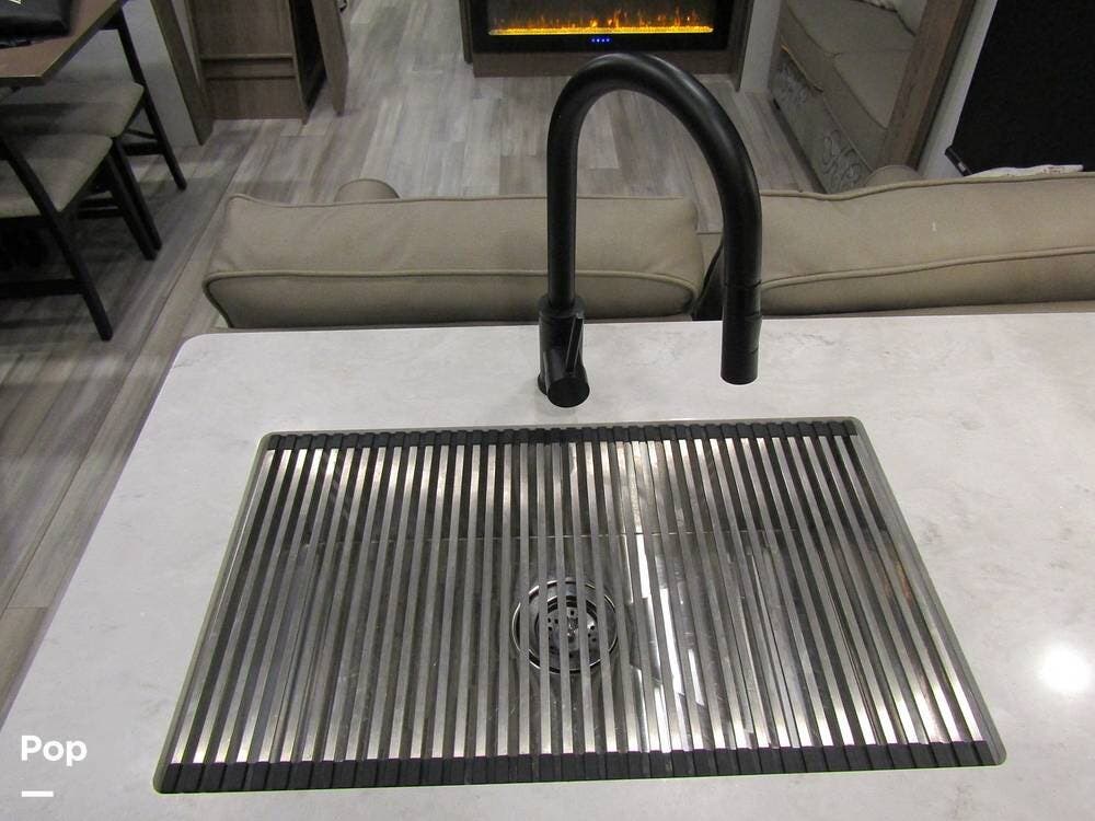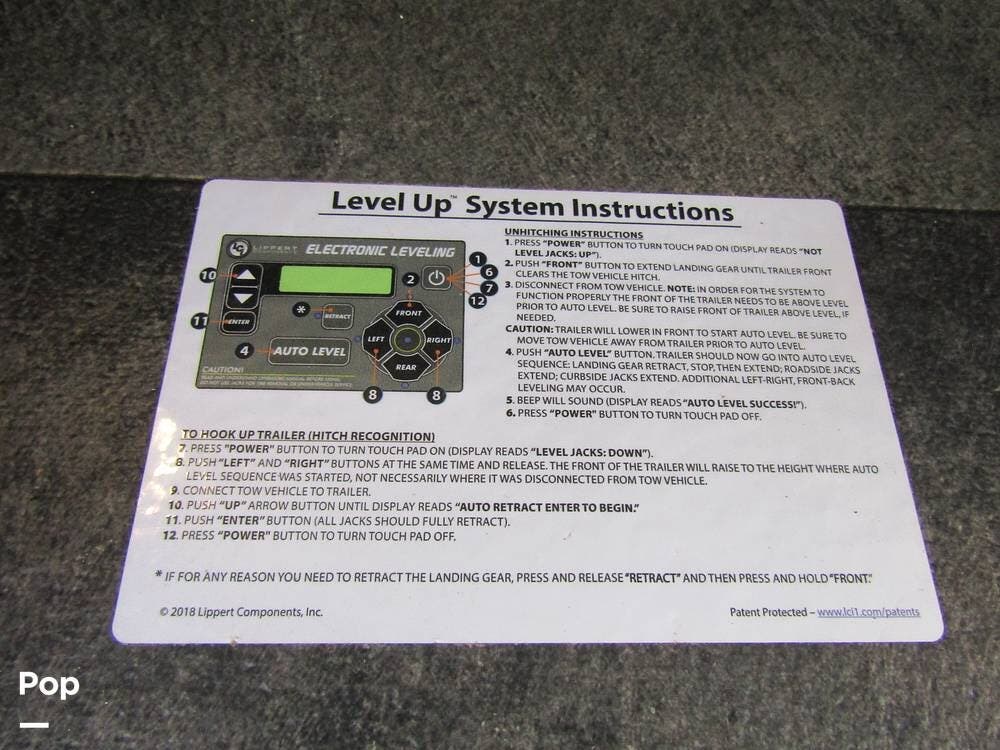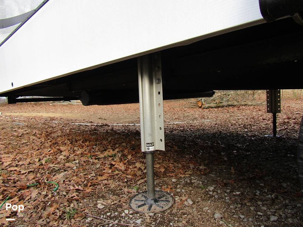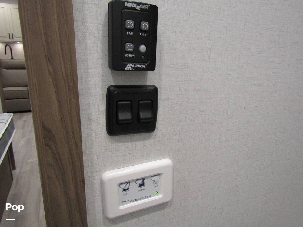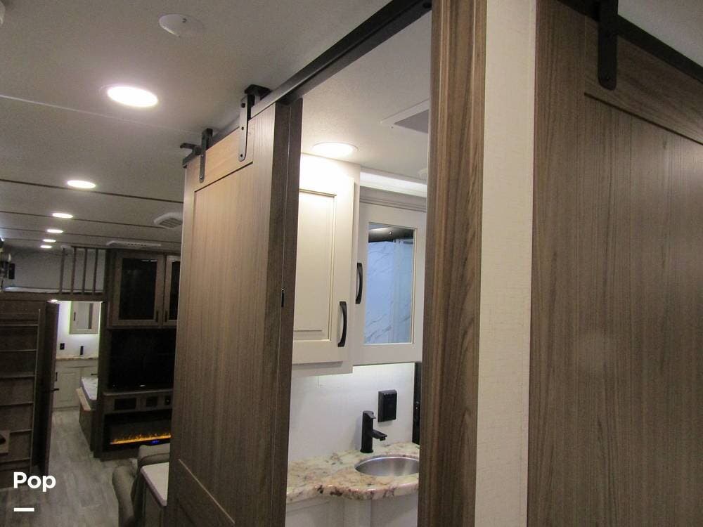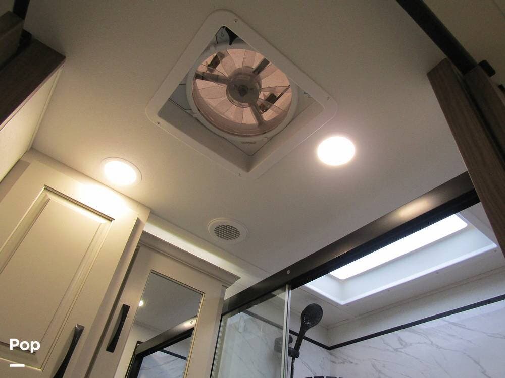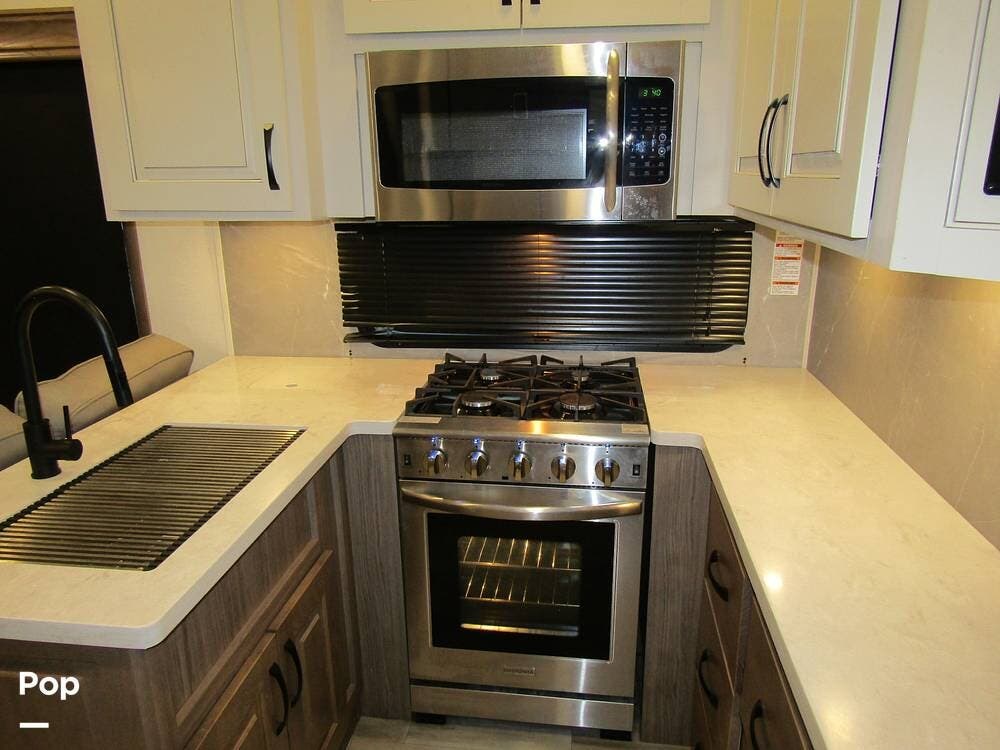 This 5th Wheel features automatic leveling, a complete kitchen with a four-chair dinette table, an entertainment center with a fireplace over a 50" flat panel smart TV, LED interior and exterior lighting, a ceiling fan with modern, stylish overhead lighting, theater seating recliners with cup holders, and a sleeper sofa.