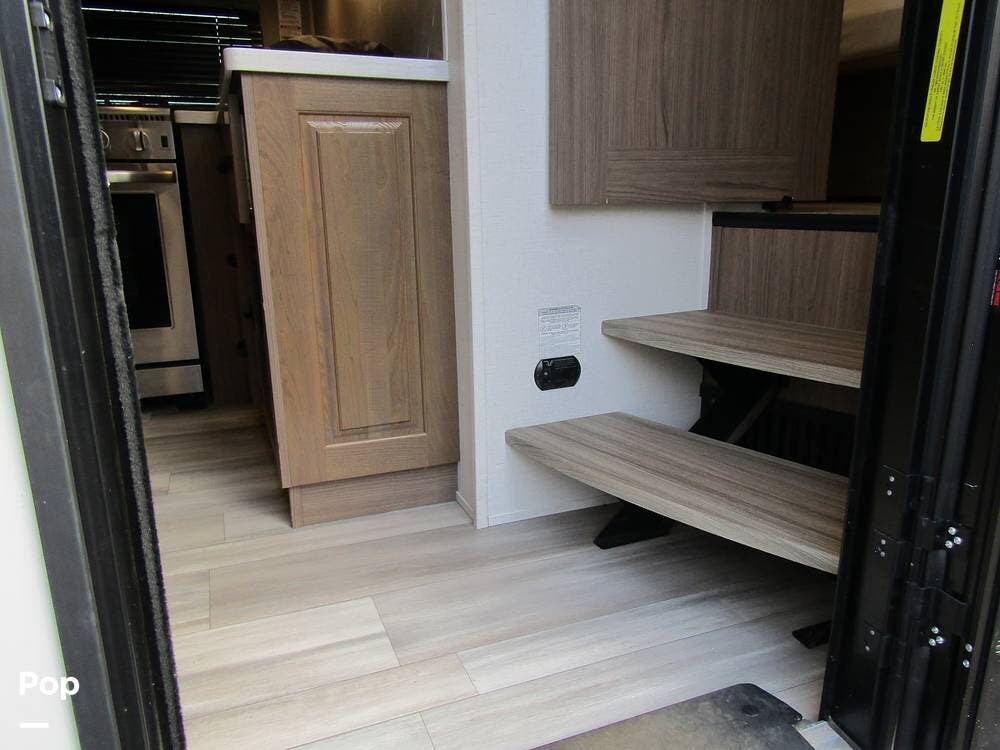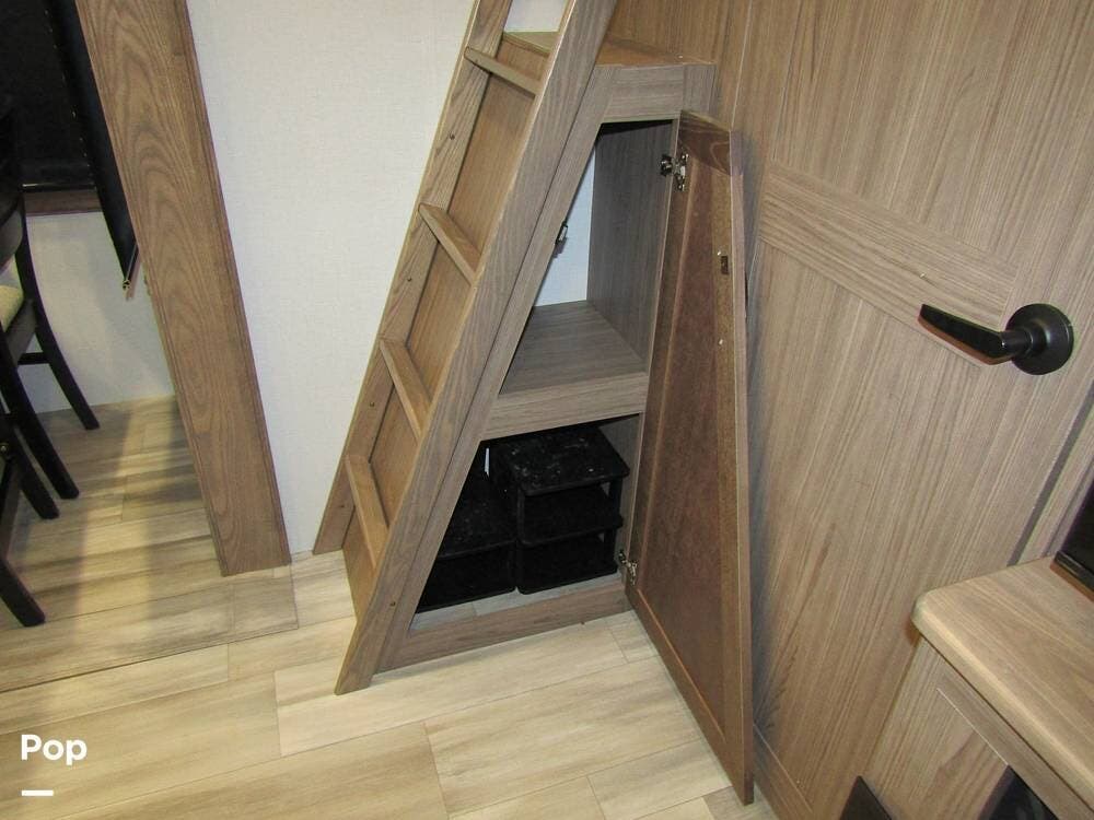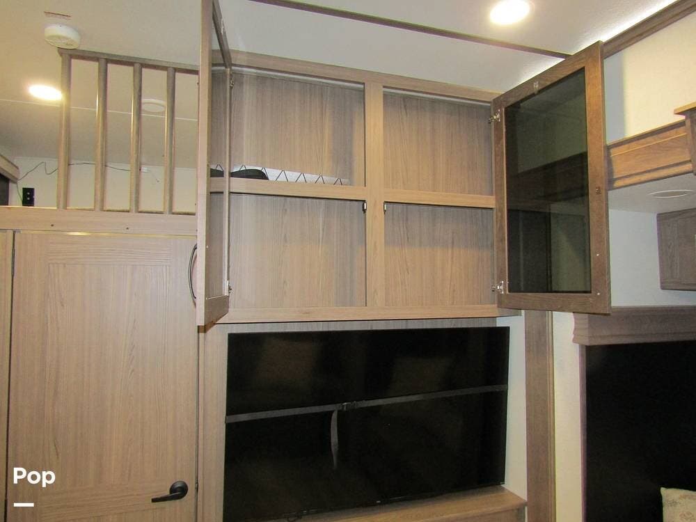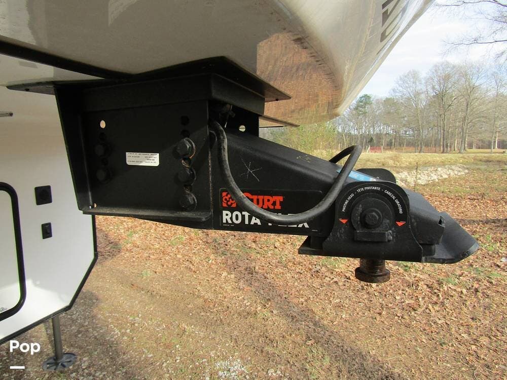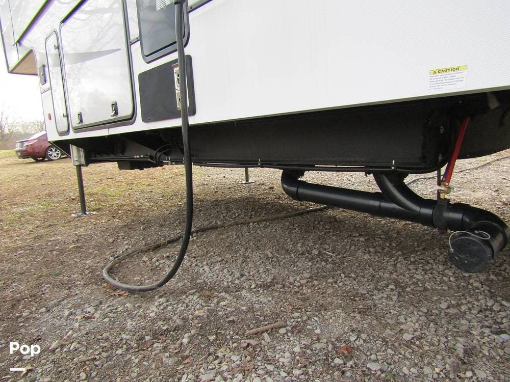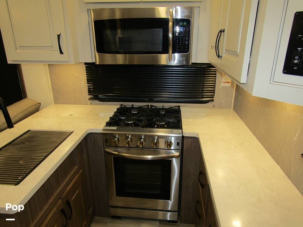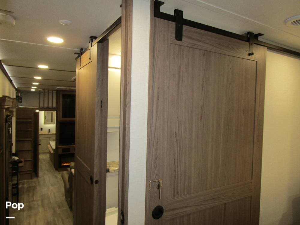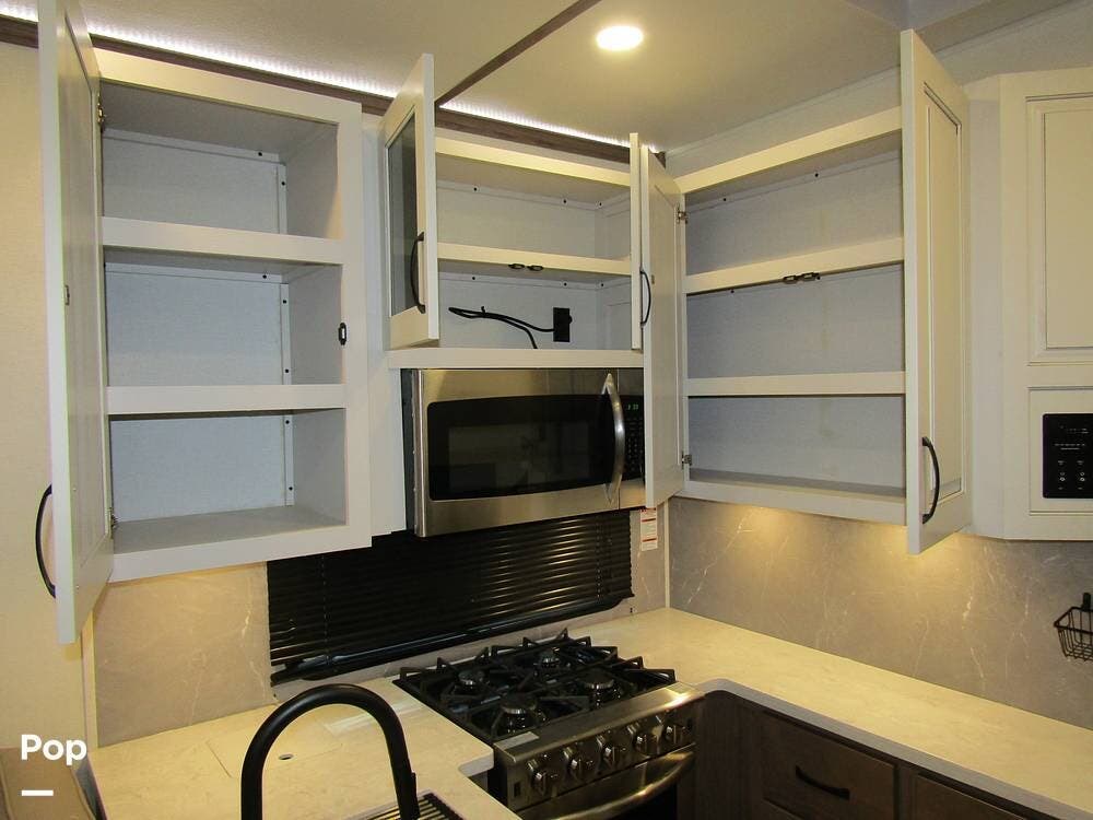 This 5th Wheel features automatic leveling, a complete kitchen with a four-chair dinette table, an entertainment center with a fireplace over a 50" flat panel smart TV, LED interior and exterior lighting, a ceiling fan with modern, stylish overhead lighting, theater seating recliners with cup holders, and a sleeper sofa.