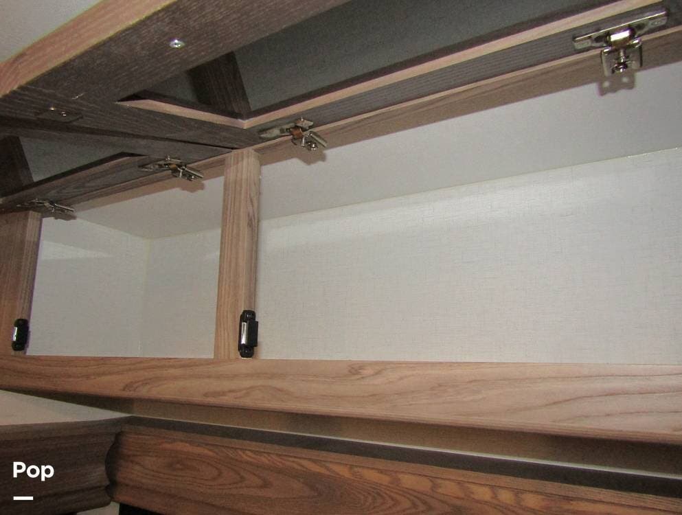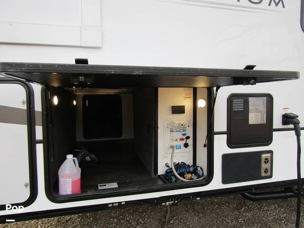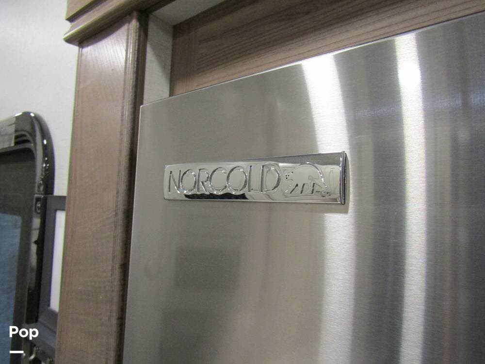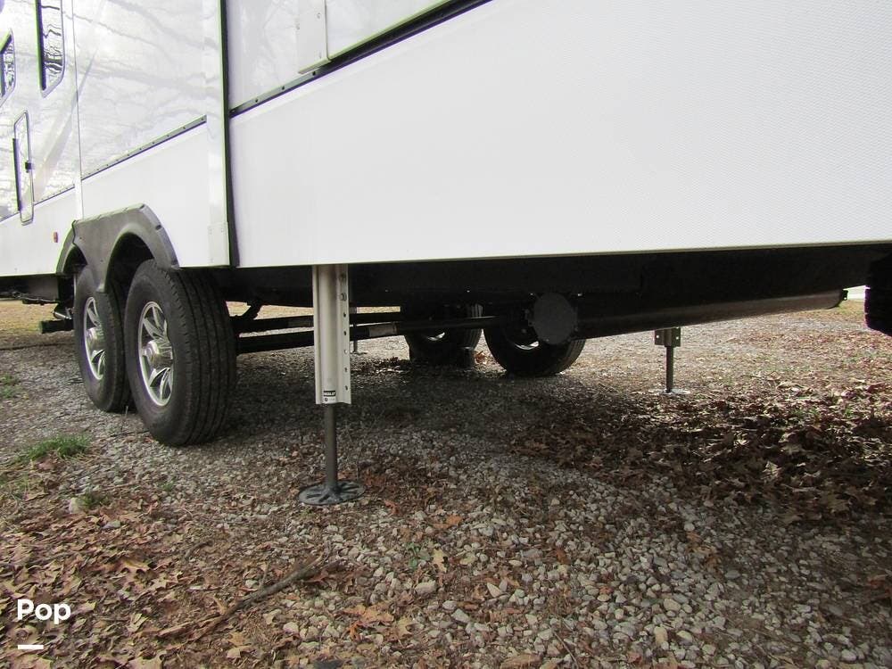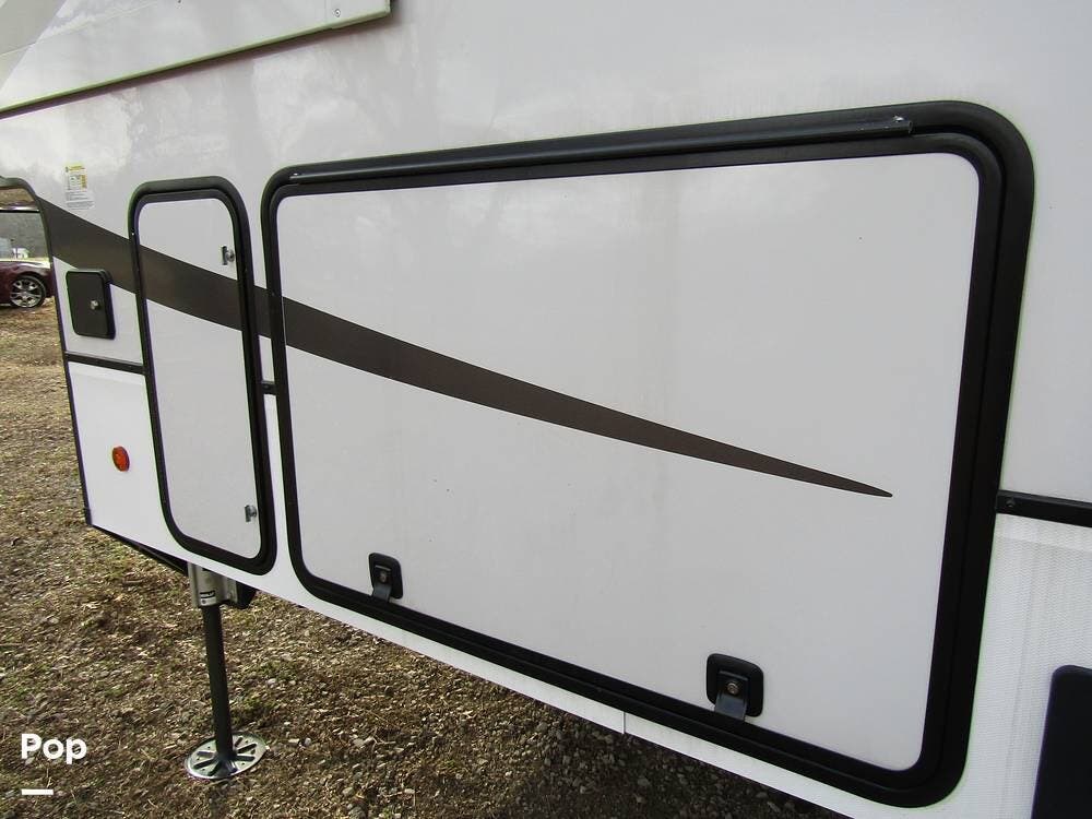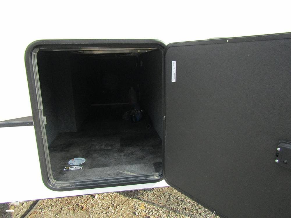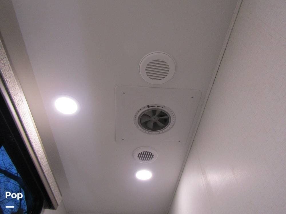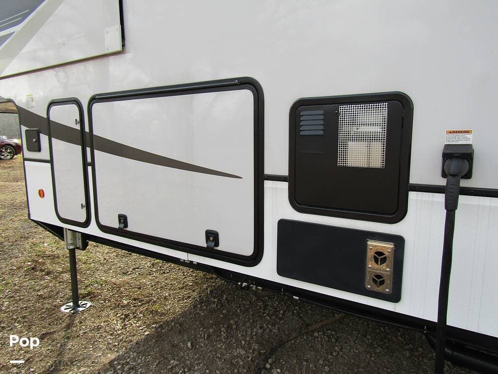 This 5th Wheel features automatic leveling, a complete kitchen with a four-chair dinette table, an entertainment center with a fireplace over a 50" flat panel smart TV, LED interior and exterior lighting, a ceiling fan with modern, stylish overhead lighting, theater seating recliners with cup holders, and a sleeper sofa.