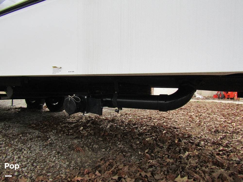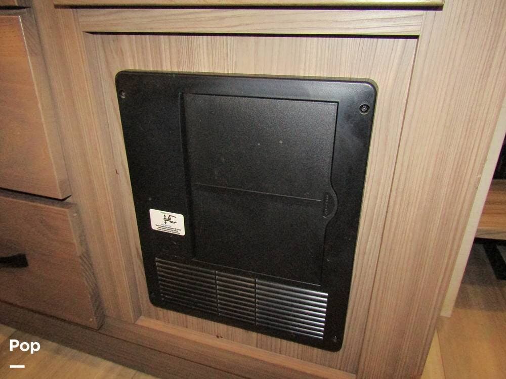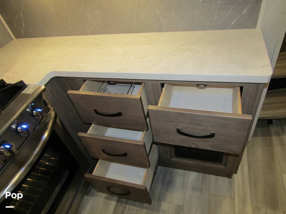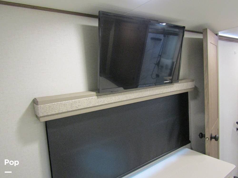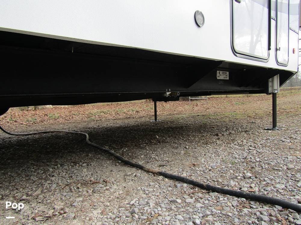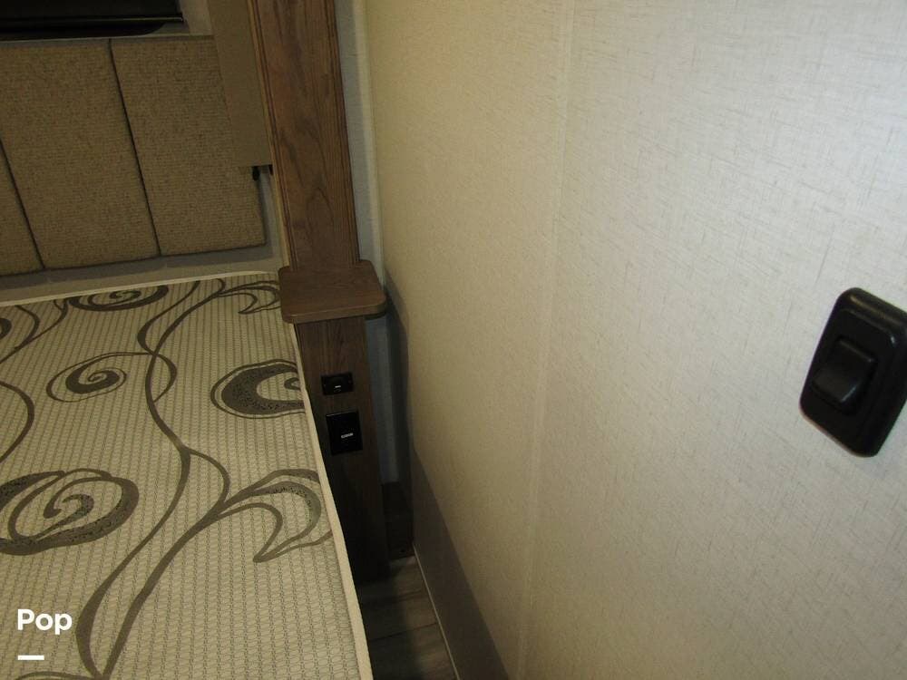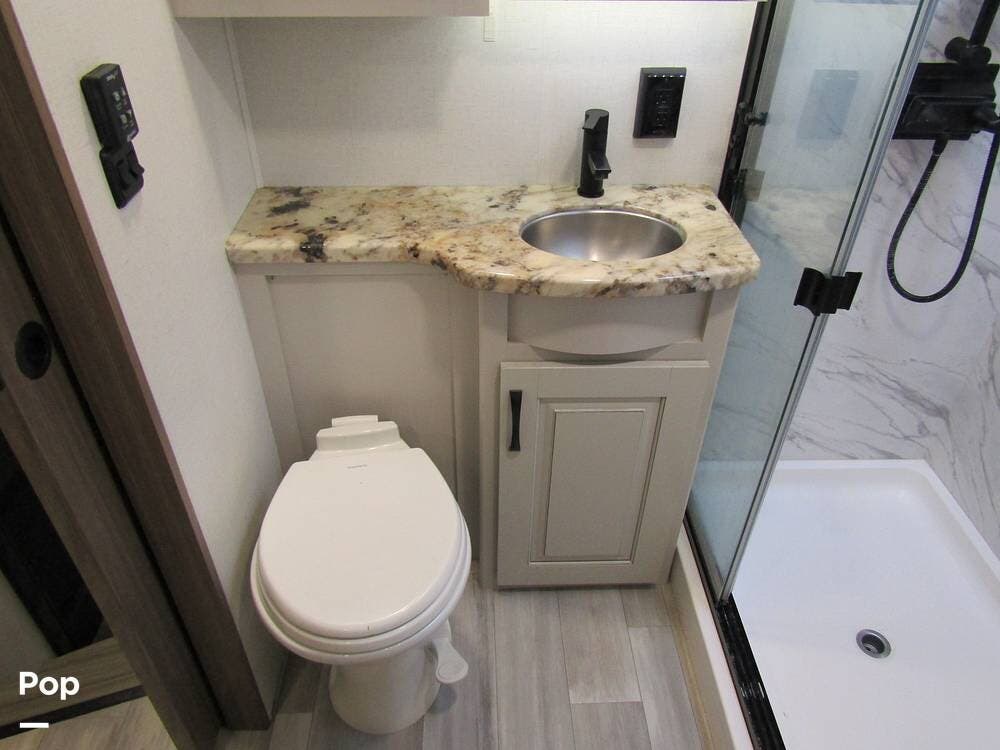 This 5th Wheel features automatic leveling, a complete kitchen with a four-chair dinette table, an entertainment center with a fireplace over a 50" flat panel smart TV, LED interior and exterior lighting, a ceiling fan with modern, stylish overhead lighting, theater seating recliners with cup holders, and a sleeper sofa.