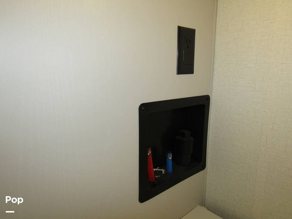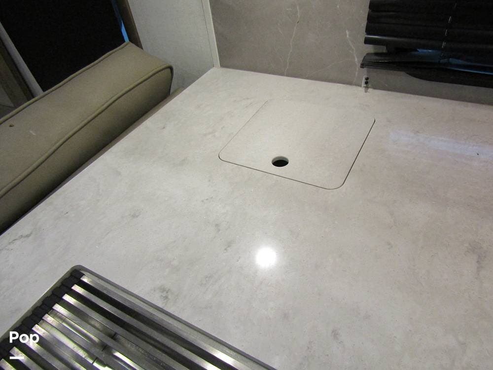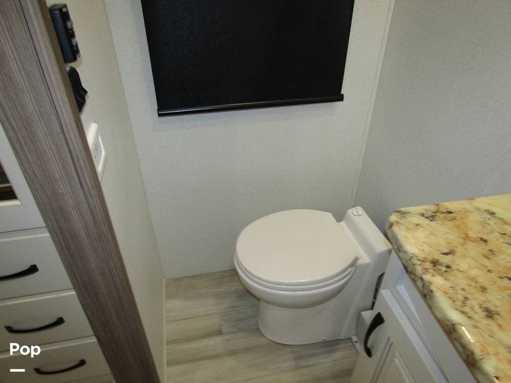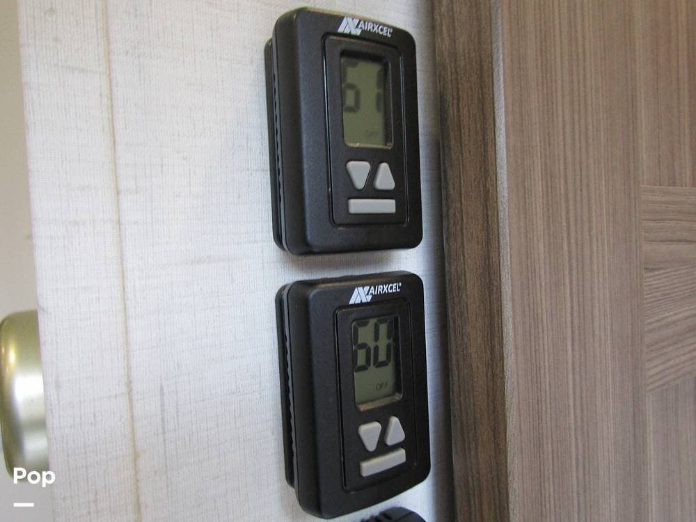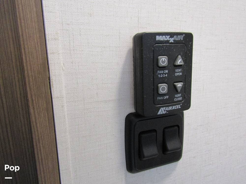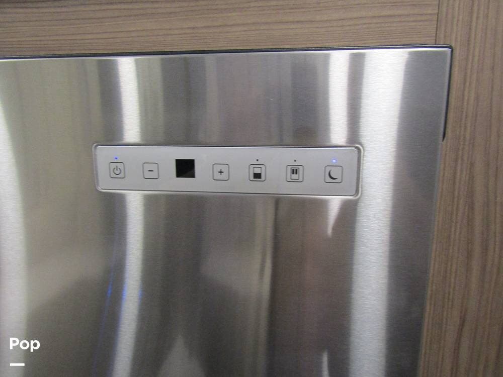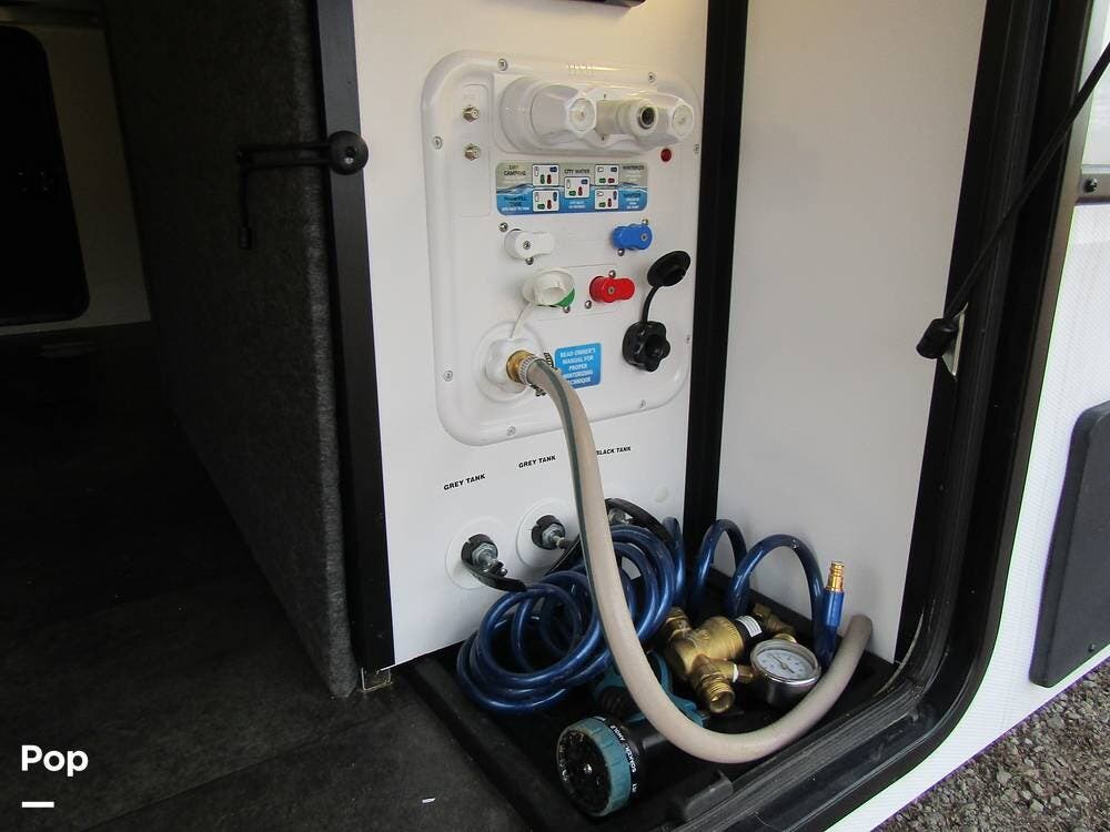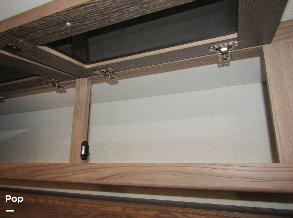 This 5th Wheel features automatic leveling, a complete kitchen with a four-chair dinette table, an entertainment center with a fireplace over a 50" flat panel smart TV, LED interior and exterior lighting, a ceiling fan with modern, stylish overhead lighting, theater seating recliners with cup holders, and a sleeper sofa.