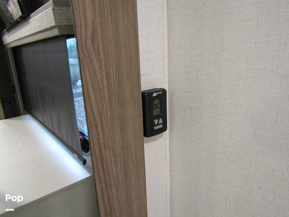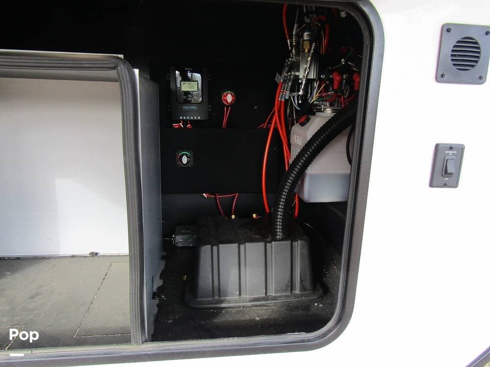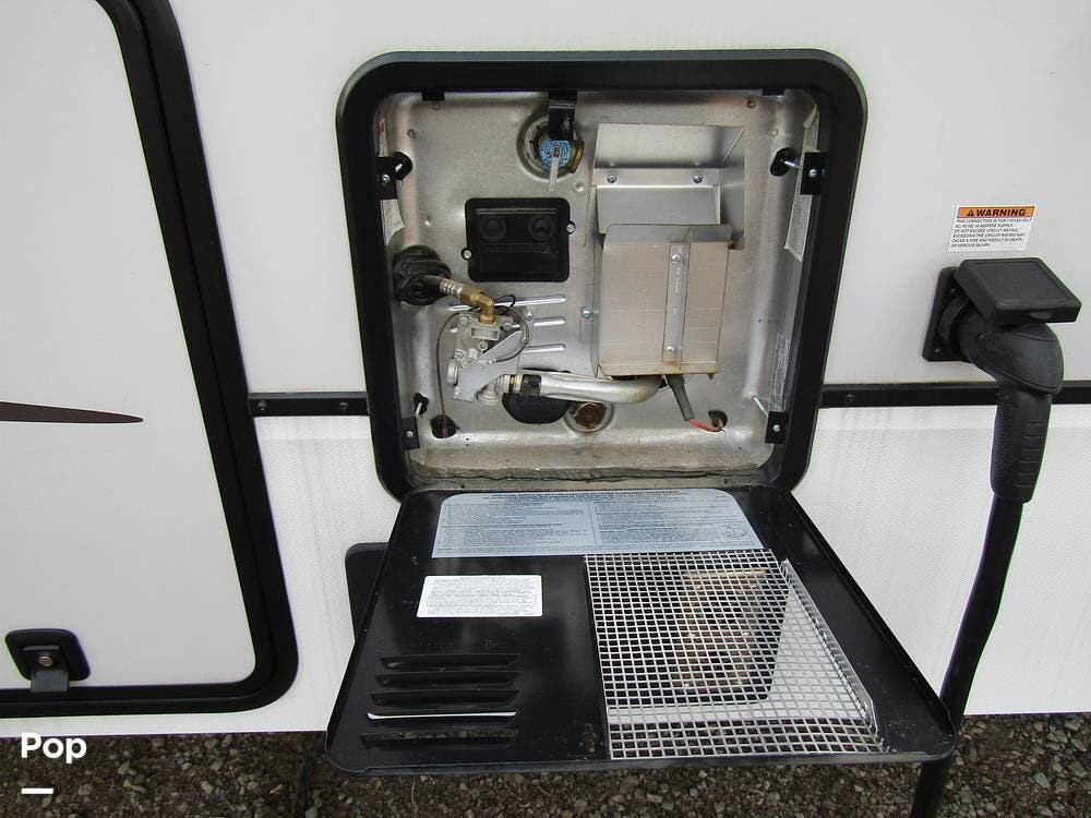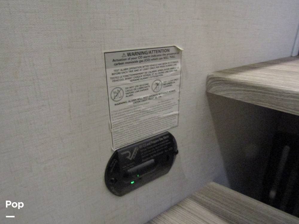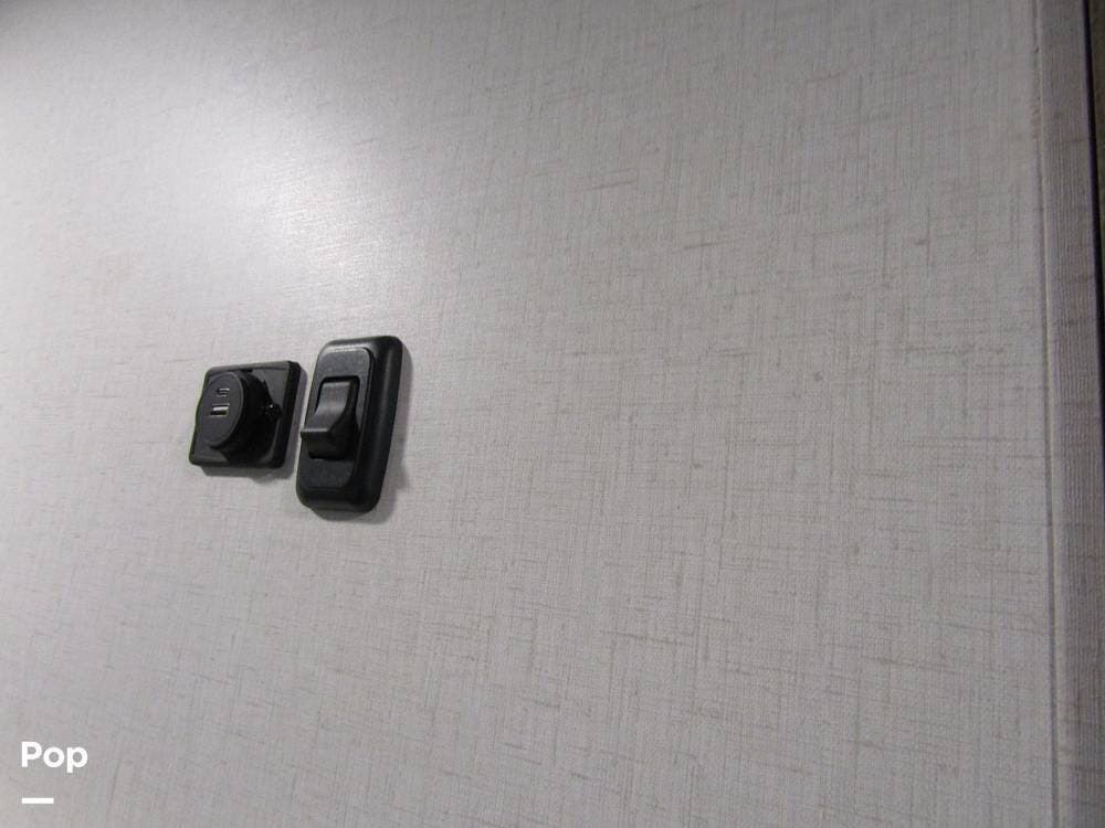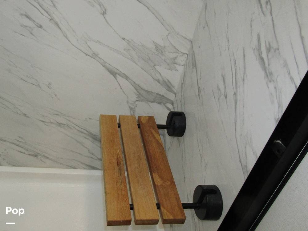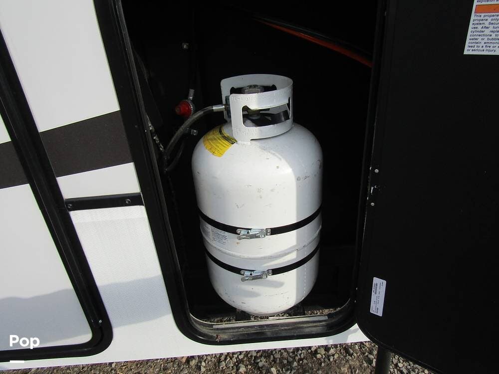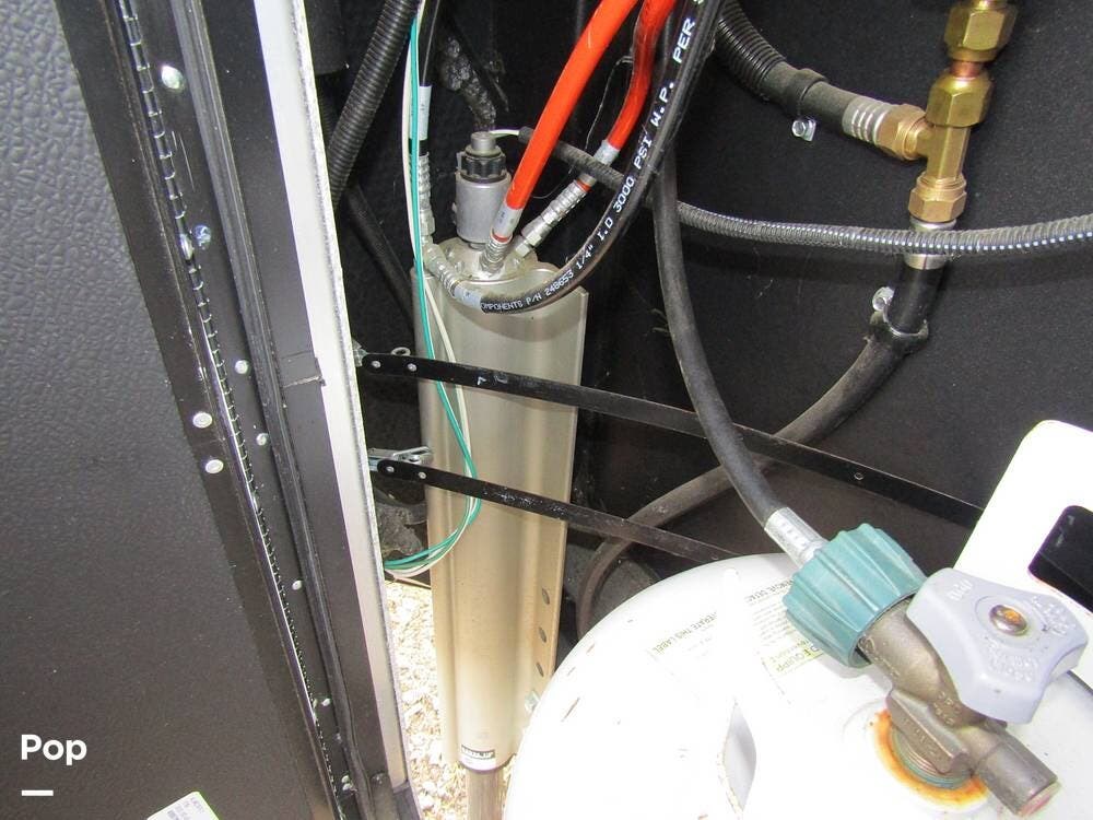 This 5th Wheel features automatic leveling, a complete kitchen with a four-chair dinette table, an entertainment center with a fireplace over a 50" flat panel smart TV, LED interior and exterior lighting, a ceiling fan with modern, stylish overhead lighting, theater seating recliners with cup holders, and a sleeper sofa.