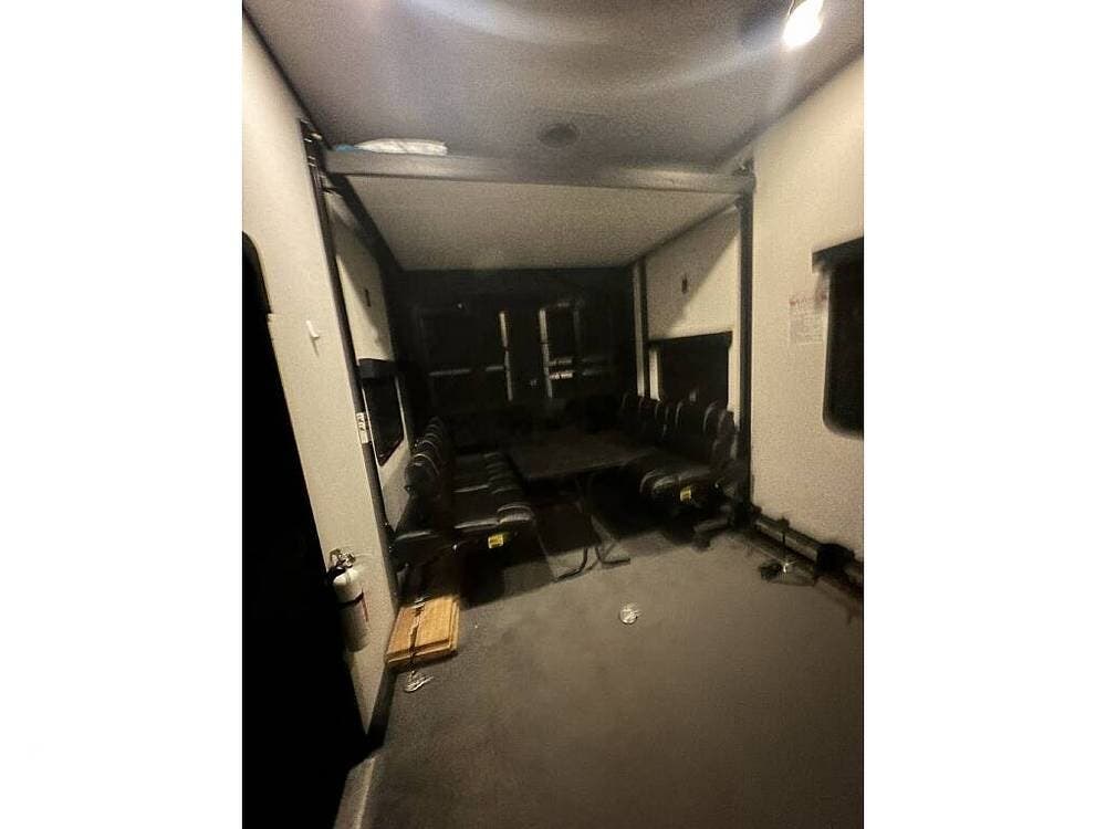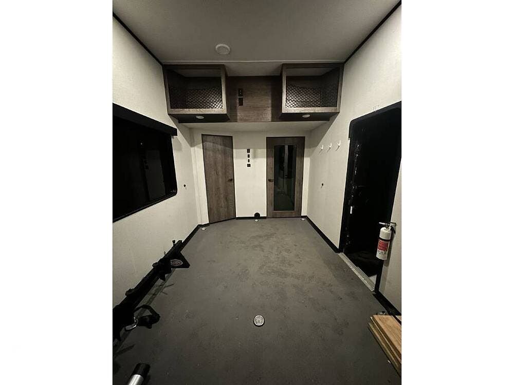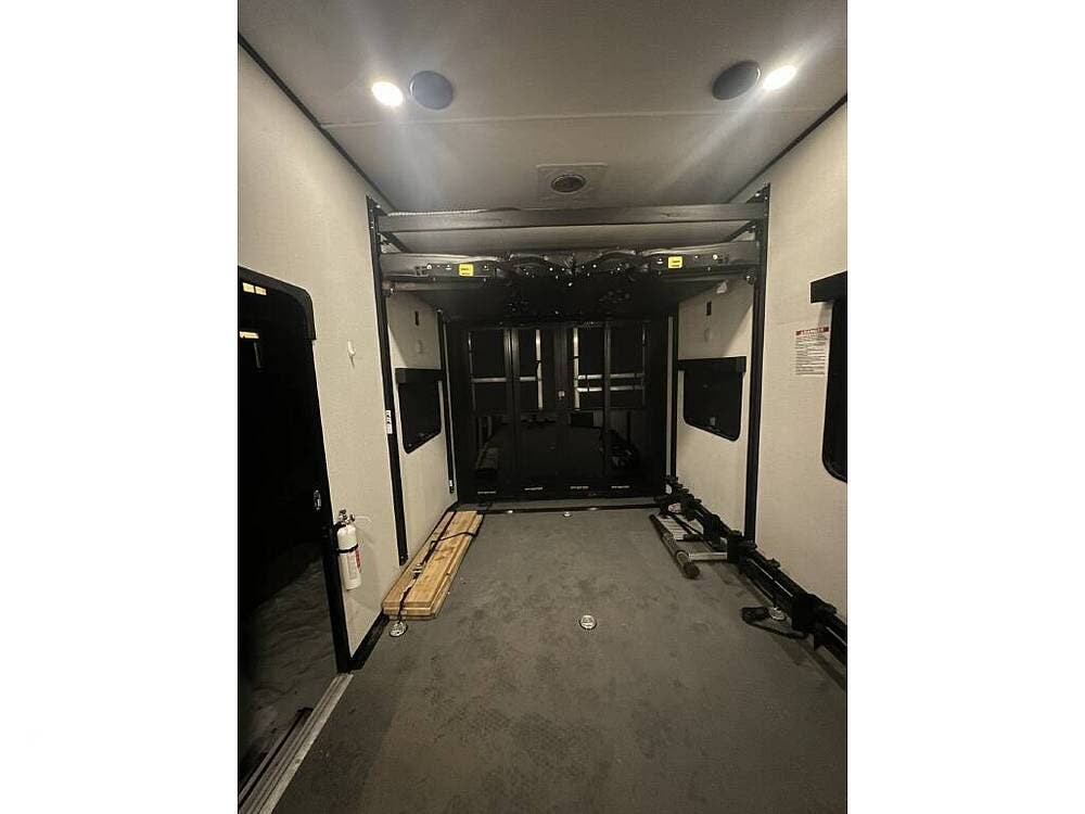 This toy hauler features a spacious floor plan with a massive 15-foot garage, providing ample room for ATVs, motorcycles, kayaks, or other gear, while also offering additional living and sleeping space.