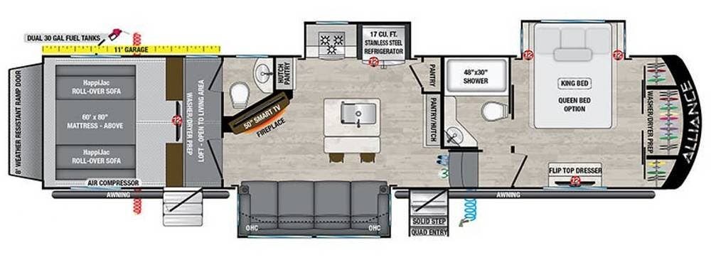 The 2023 Valor 36V11 is ideally suited for extended living, whether on or off the grid, with all the power and space you'll need. Room for the whole family AND your ATVs, motorcycles, dirt bikes, golf carts, or snowmobiles.