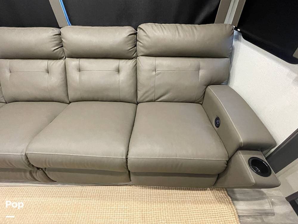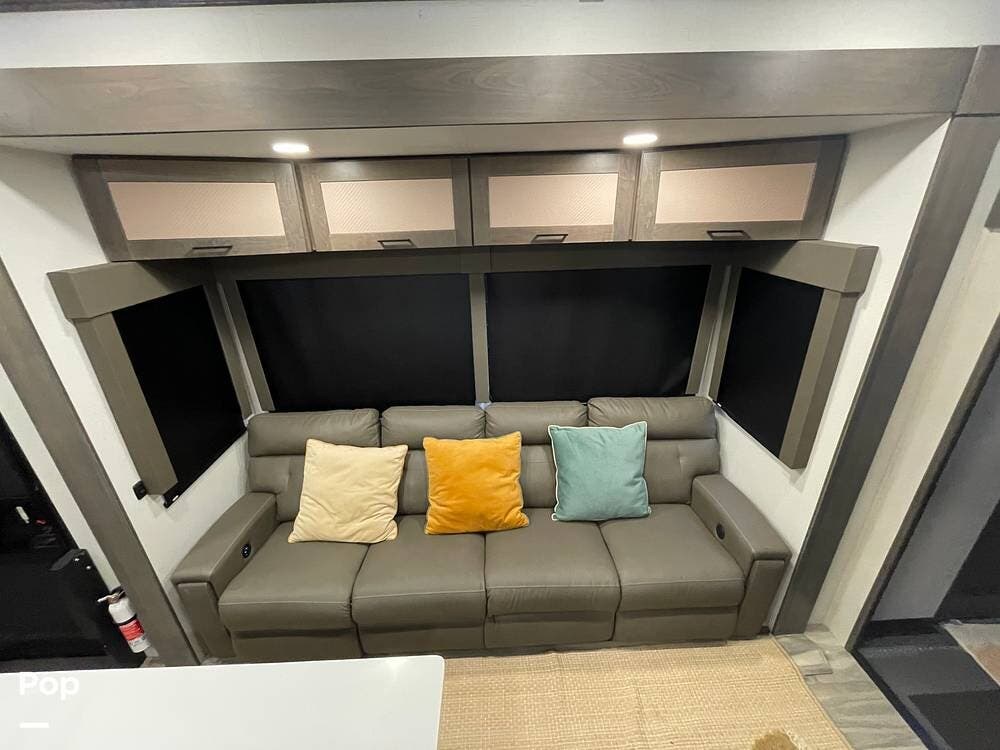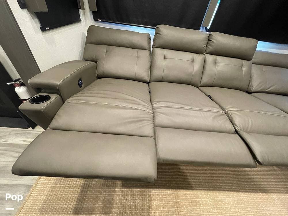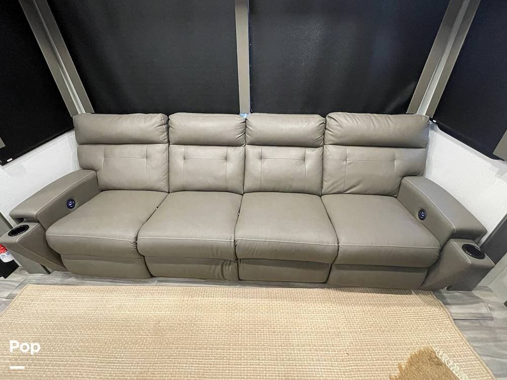 The living area features a large sofa with both ends reclining with the touch of a button, with the two center portions reclining manually. Behind the sofa are large windows with blinds, and cabinet storage is located above the sofa.