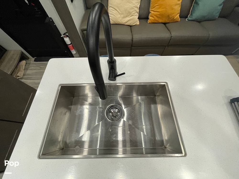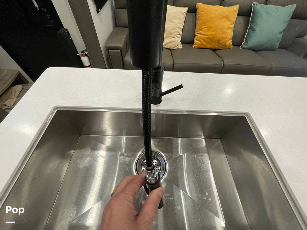 The kitchen, with an island configuration, features a large kitchen sink equipped with a pull-out sprayer faucet, as well as under-sink cupboards and drawer storage.