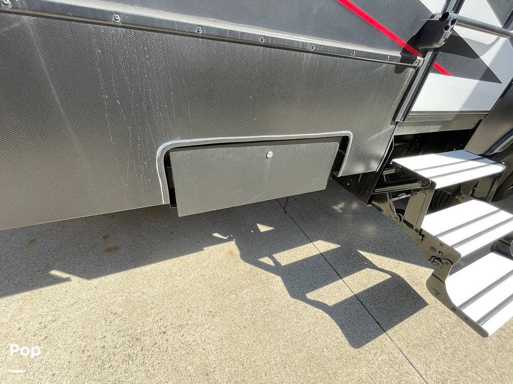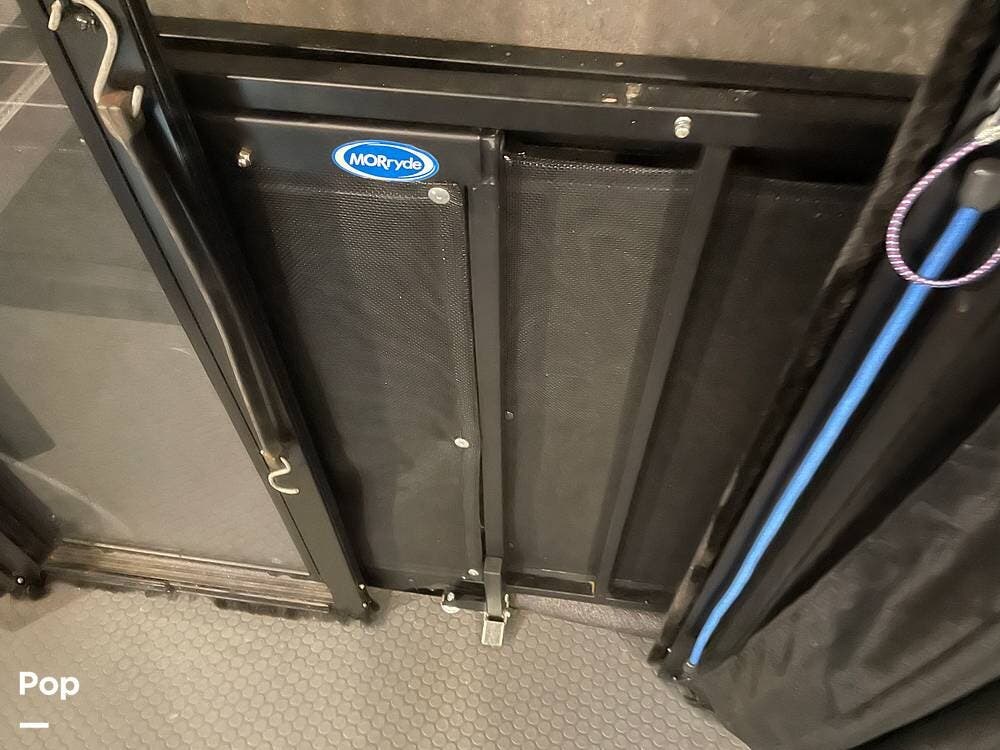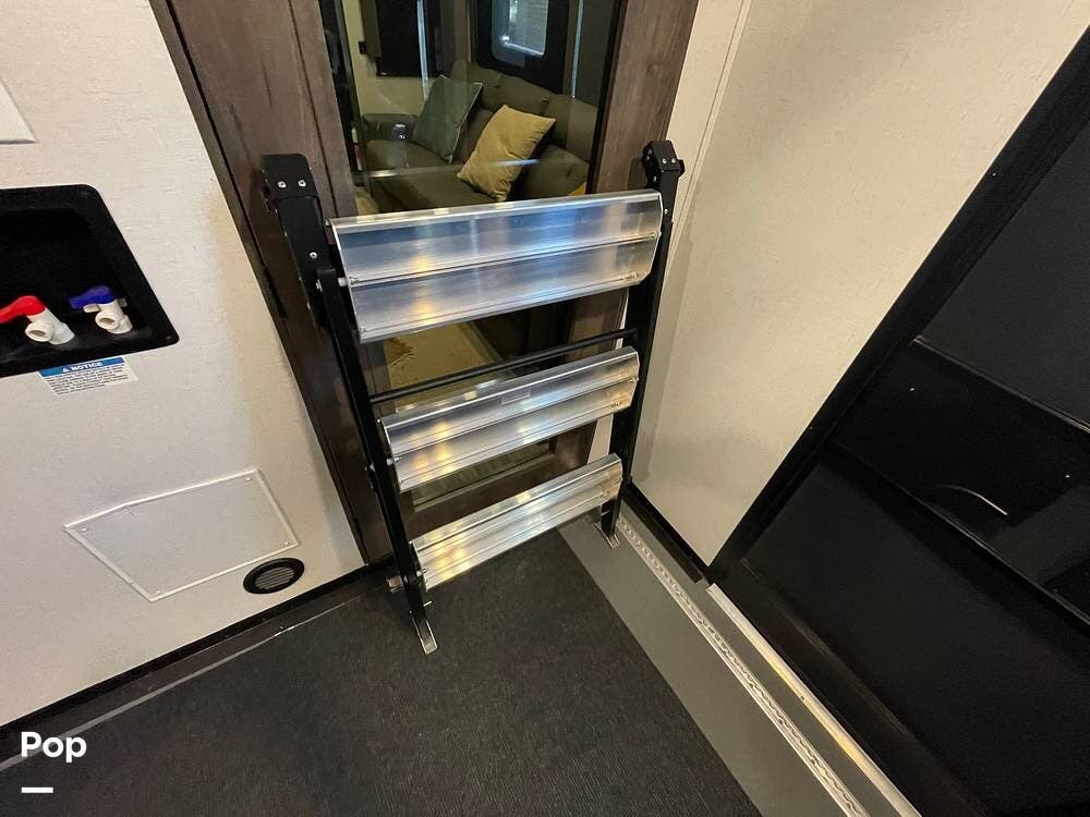 The toy hauler features two side-entry doors. There is a pull-out manual set of stairs leading into the garage, and the entry into the living area has solid steps that pull out to provide a safe and solid entry point.