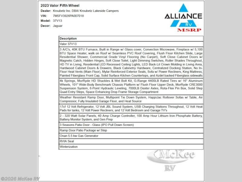 Request More Info on this 2023 Alliance RV Valor 37V13 Offered for sale by McKee RV