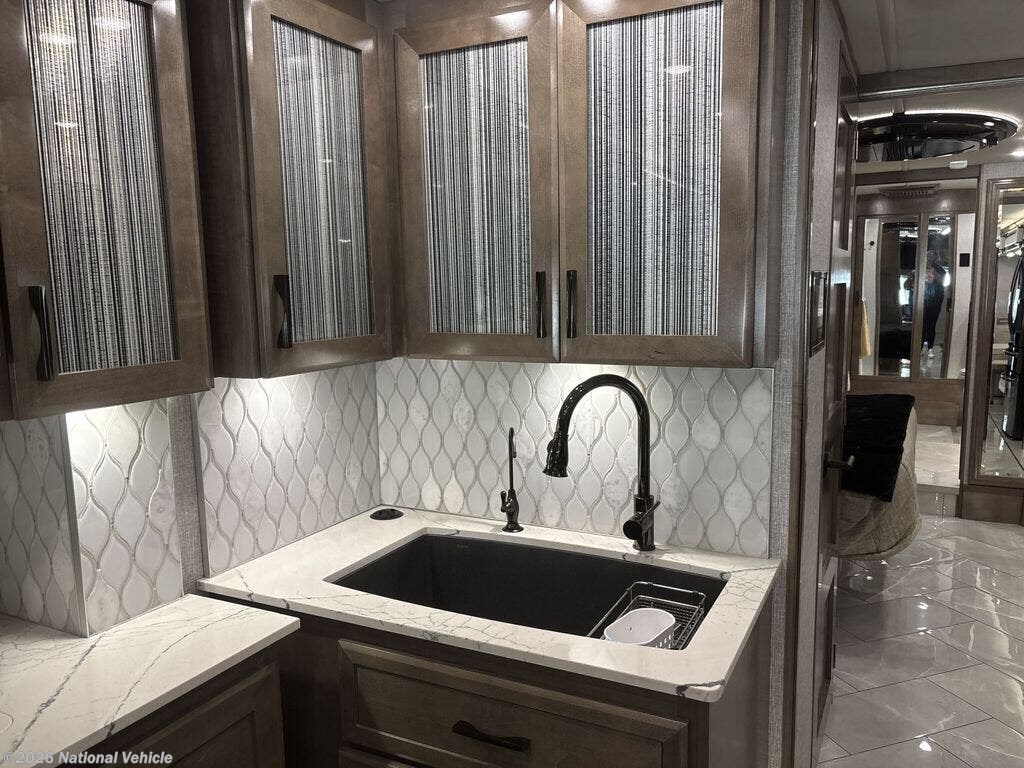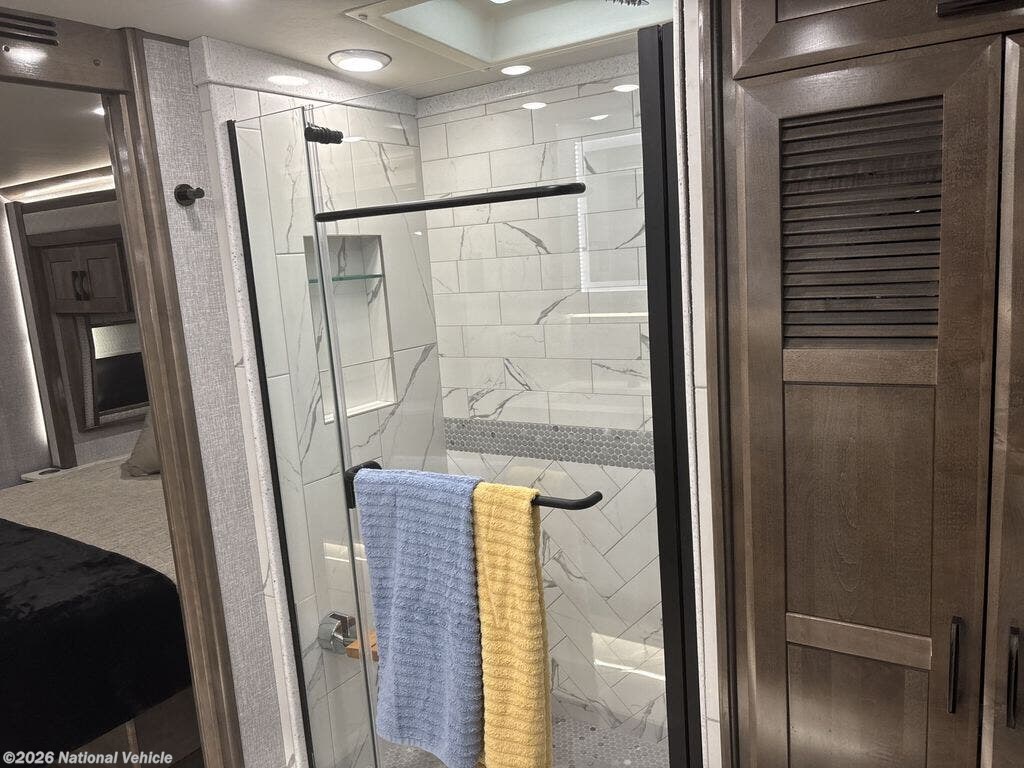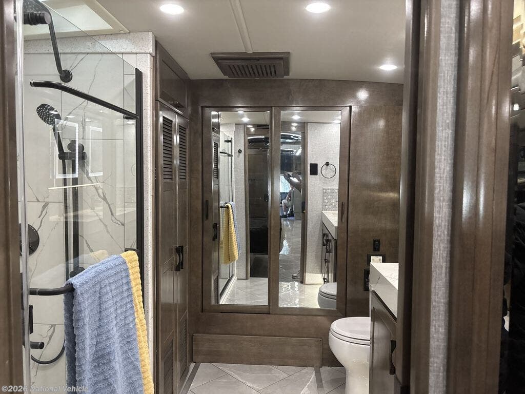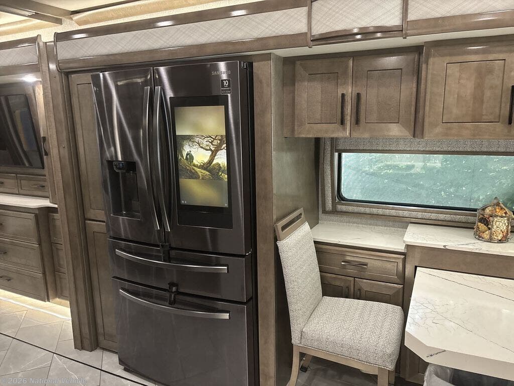 The motorhome has a large residential refrigerator, a dishwasher, a convection microwave, and a stacked washer and dryer. It also includes a central vacuum system, a large shower with dual vanities, and a hidden safe in the bedroom.