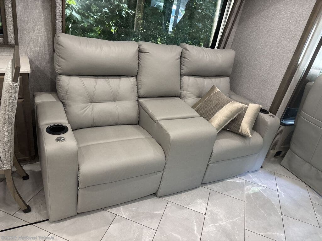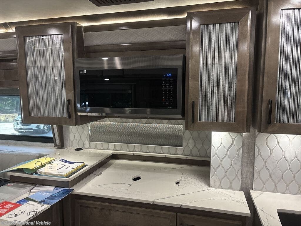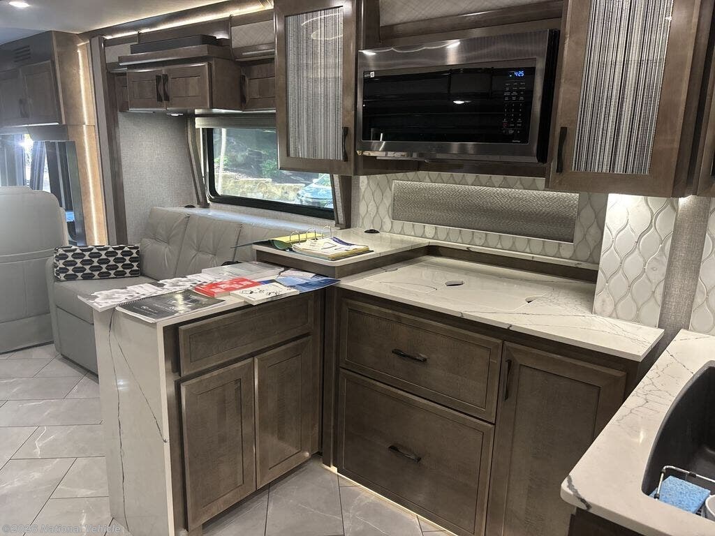 Luxurious, top-of-the-line diesel motorhome known for its spacious interior, high-end features, and powerful performance. It boasts a custom Freightliner chassis with advanced features like Freightliner's on guard technology and an independent front suspension. Inside, the 45K offers a full wall slide, a luxurious living area, a state-of-the-art kitchen, and a comfortable master suite.