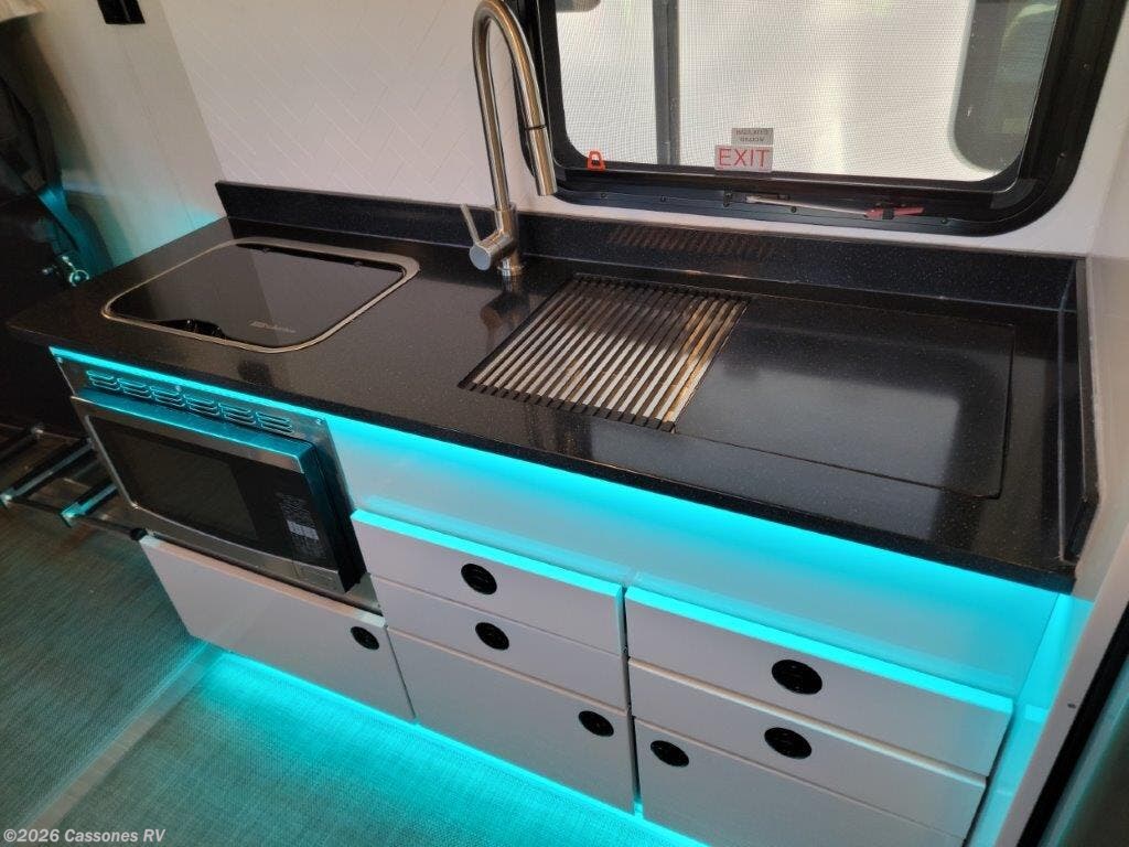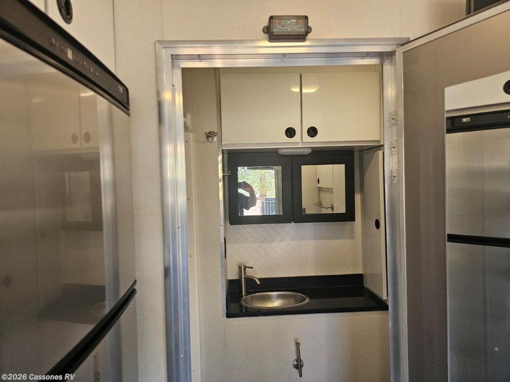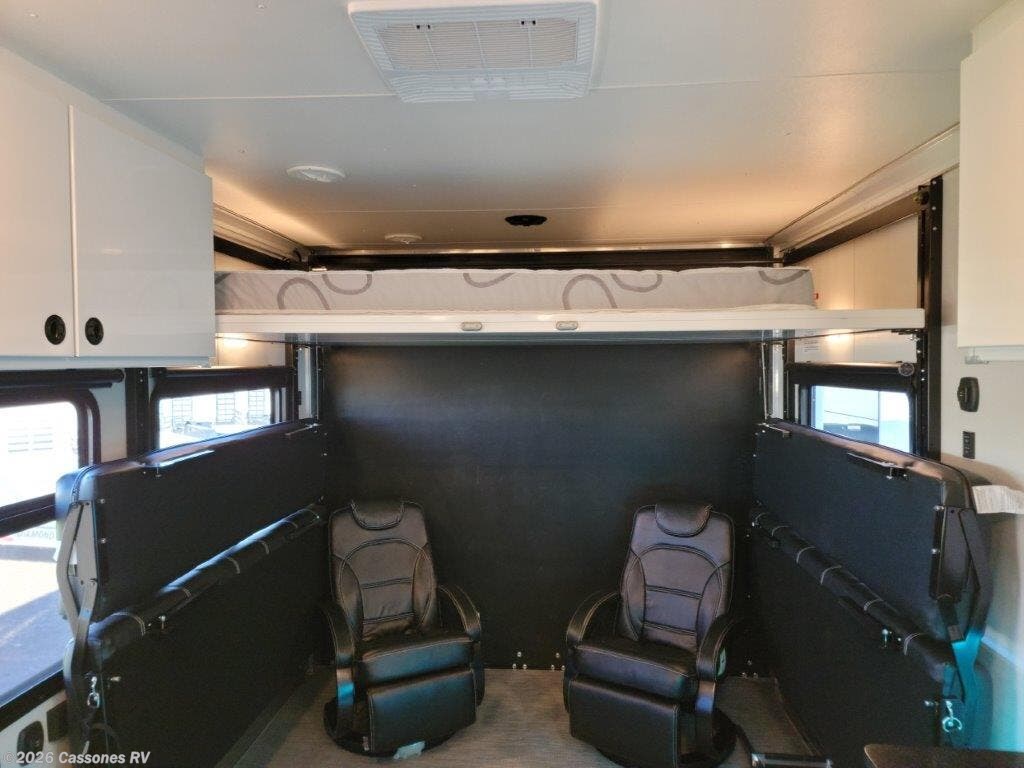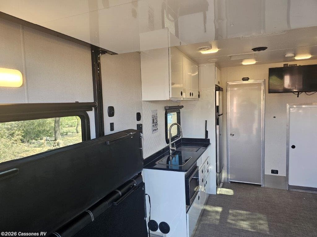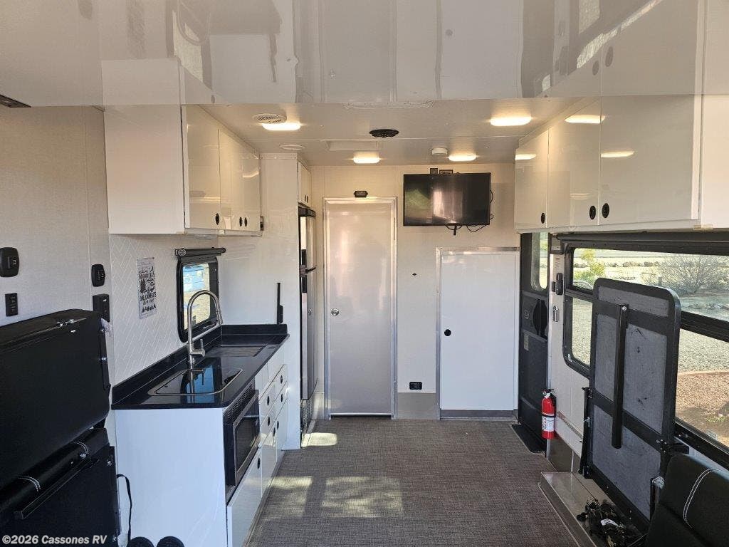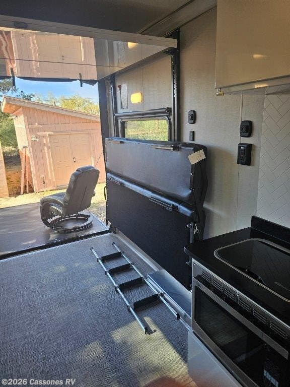 The interior features white cabinetry with black hardware, black countertops, and black seating for a clean, modern look. The layout includes a dinette with folding chairs, drop-down queen bed with ladder, and a wide-open cargo area that quickly converts from garage to living space.