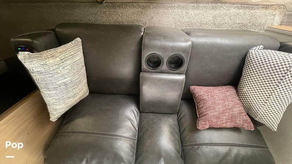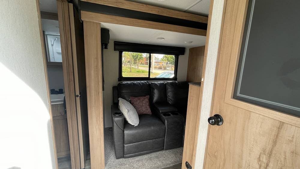 The Alpha Wolf 22SW-L provides a cozy sanctuary for travelers with privacy doors, shades, a queen bed, and theater seating with cup holders.
