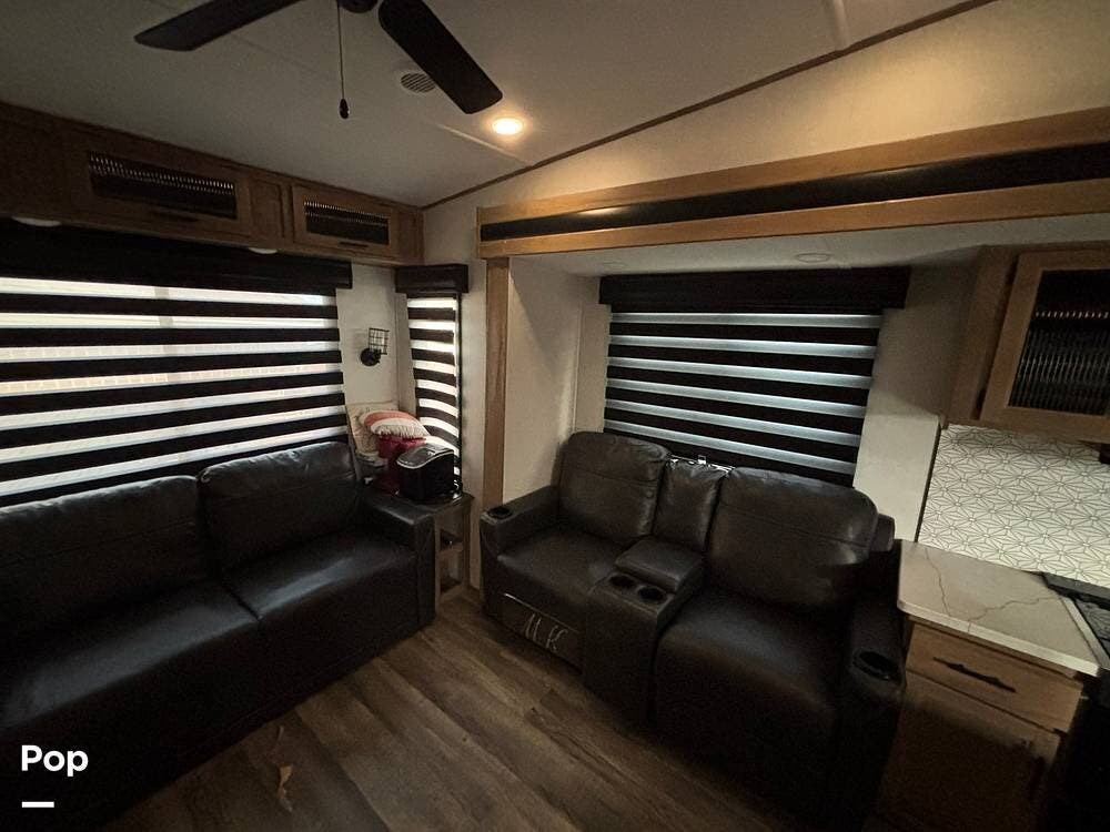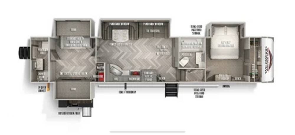 The interior is built for comfort and style with 6'4" tall slide-outs, oversized panoramic windows, and an ample family-oriented living space.
