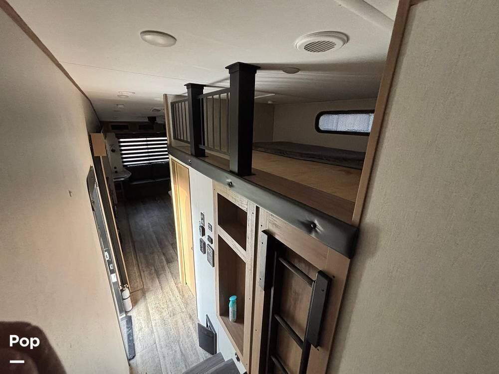 The mid-bunk room provides additional sleeping arrangements with a loft bunk and a tri-fold sofa.