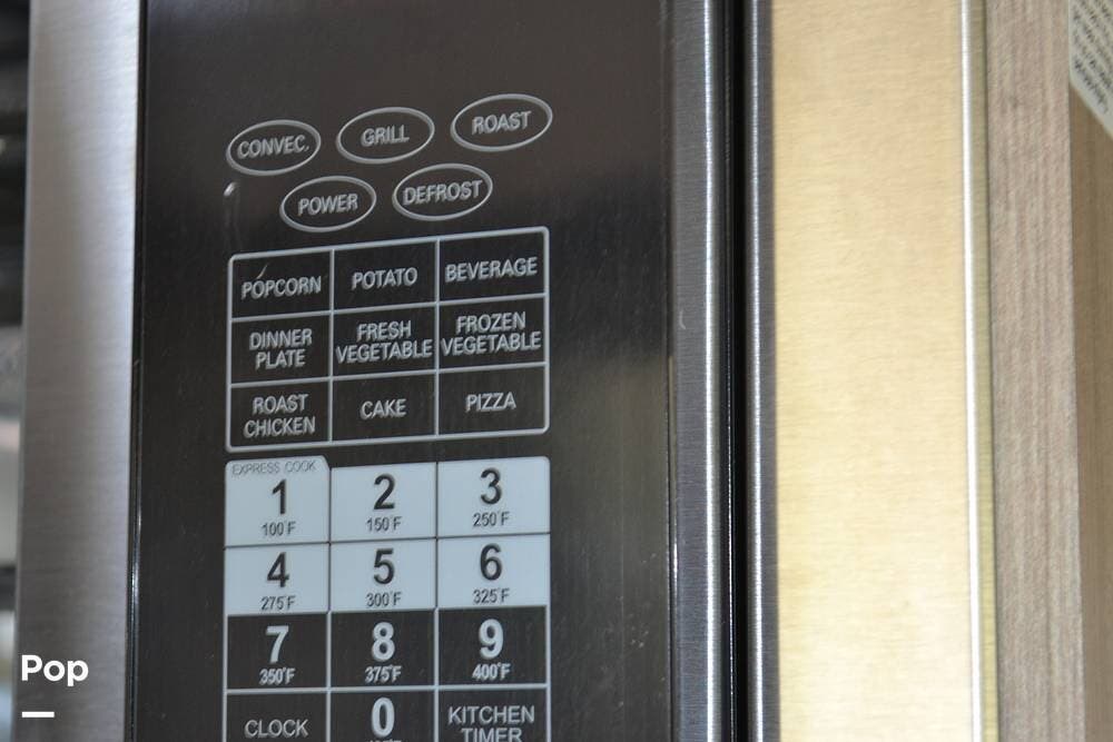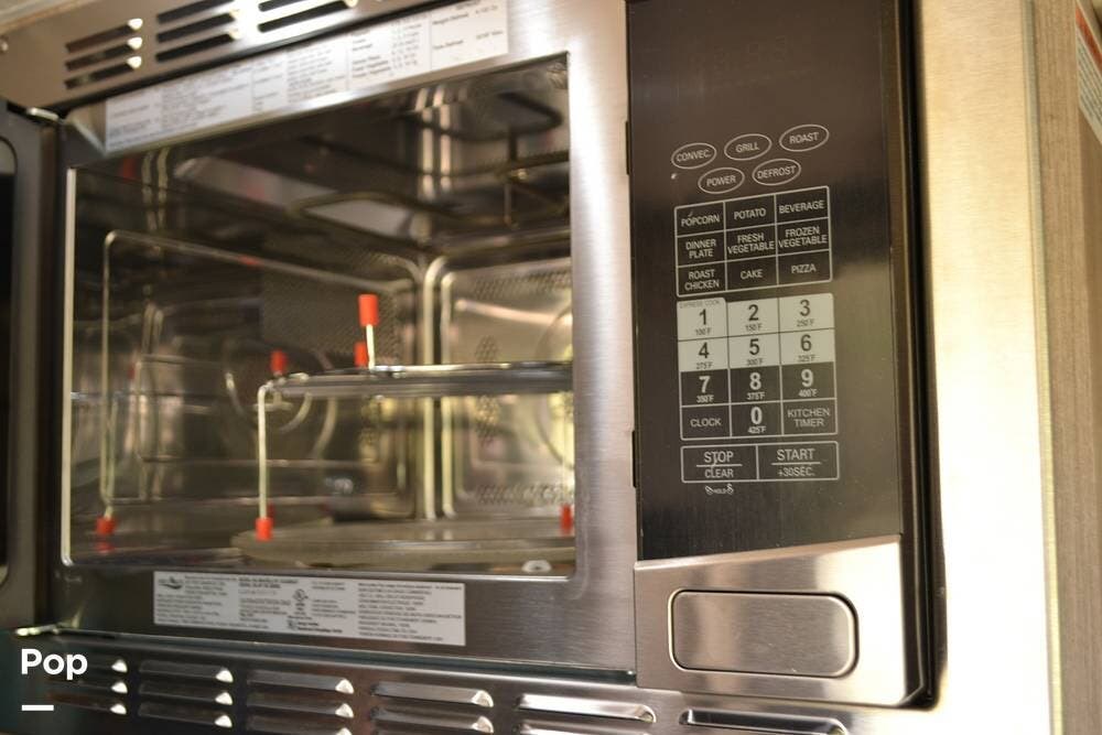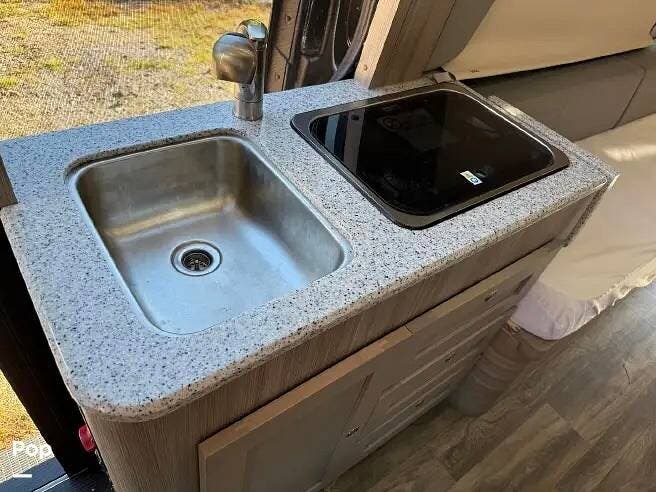 The kitchen has solid-surface countertops and a Stainless-steel sink. A two-burner cooktop, a convection microwave oven, and a 3-way refrigerator.
