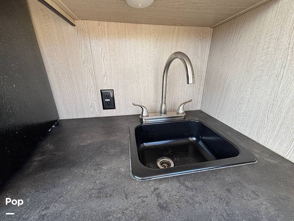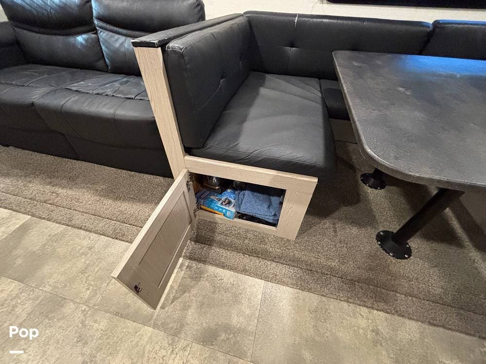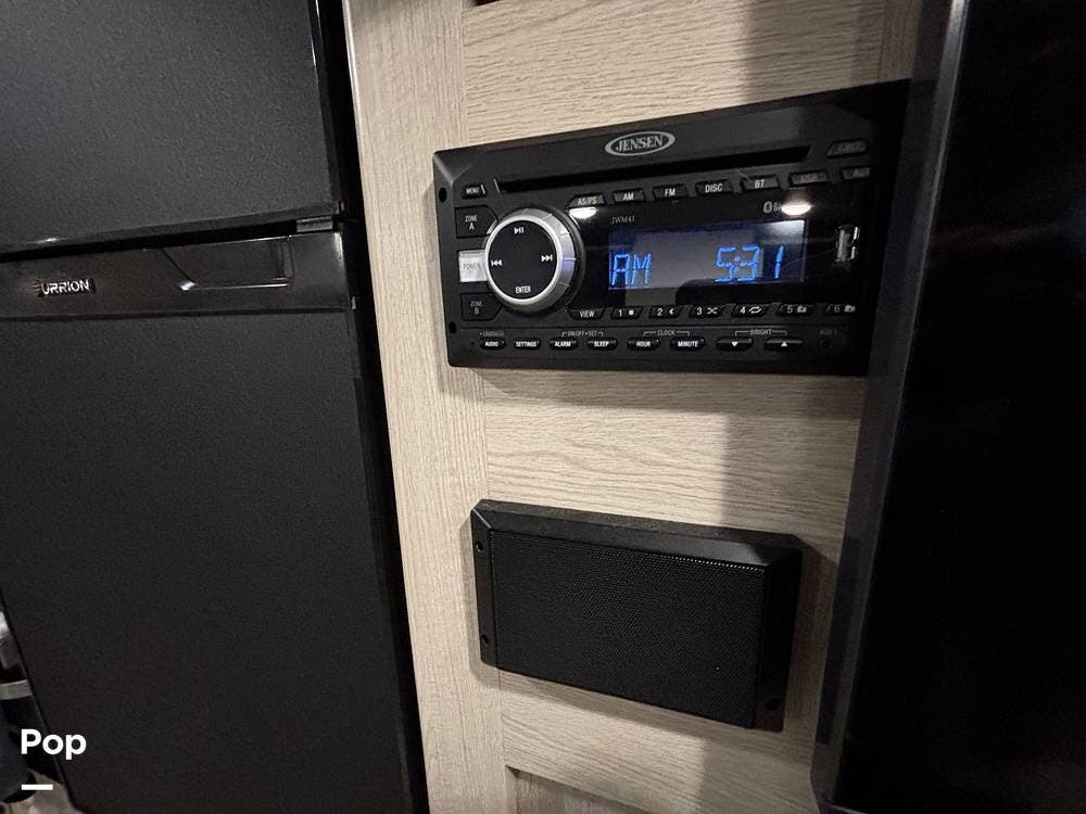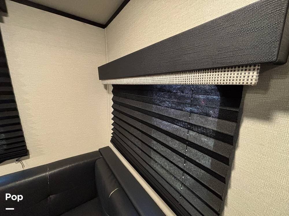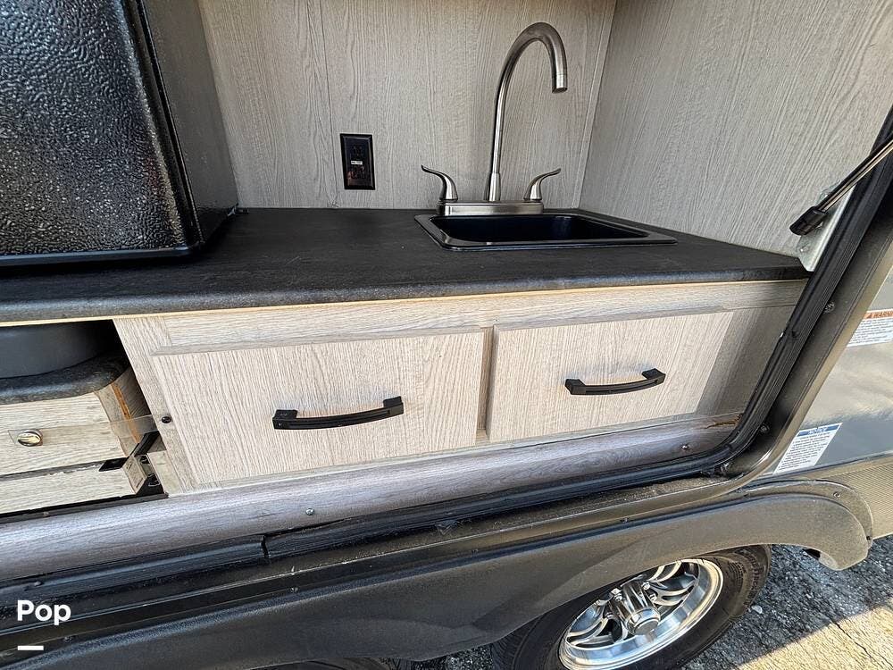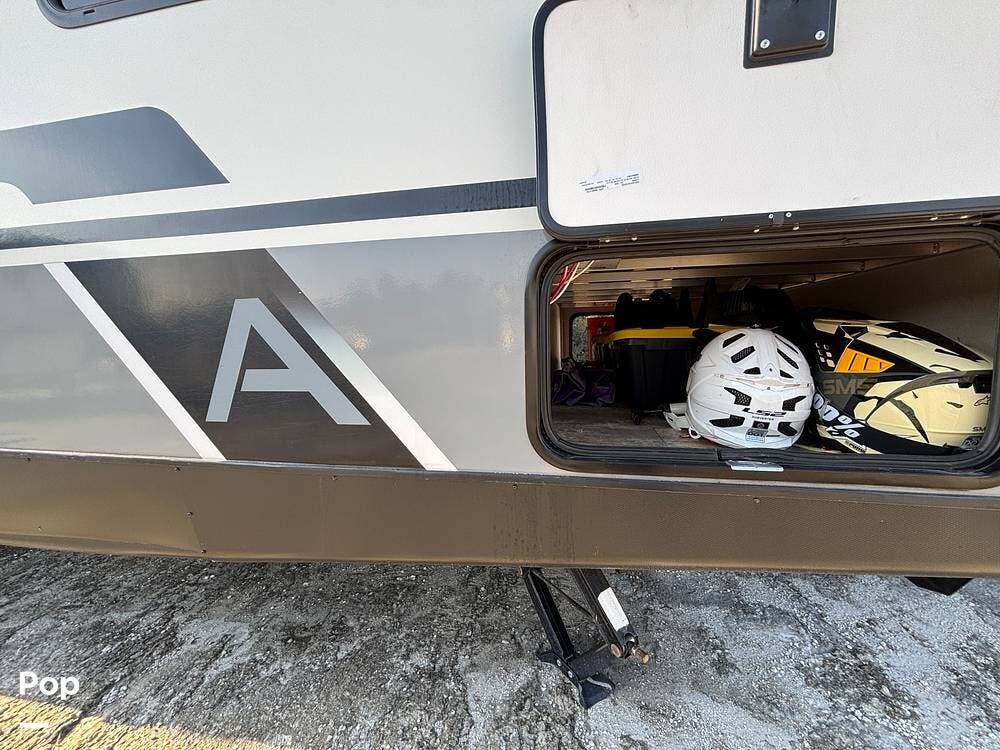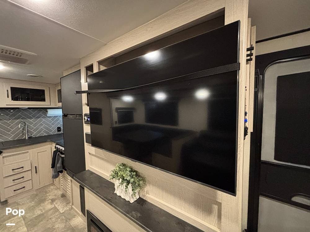 With an open layout, enjoy amenities such as a fireplace with a large television, a stereo with exterior speakers, an outdoor kitchen with a grill and a mini fridge, a solar panel, and pass-through storage.