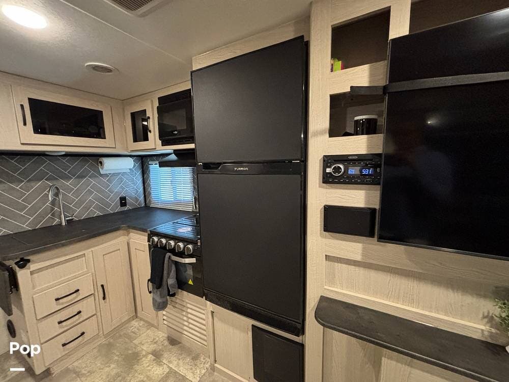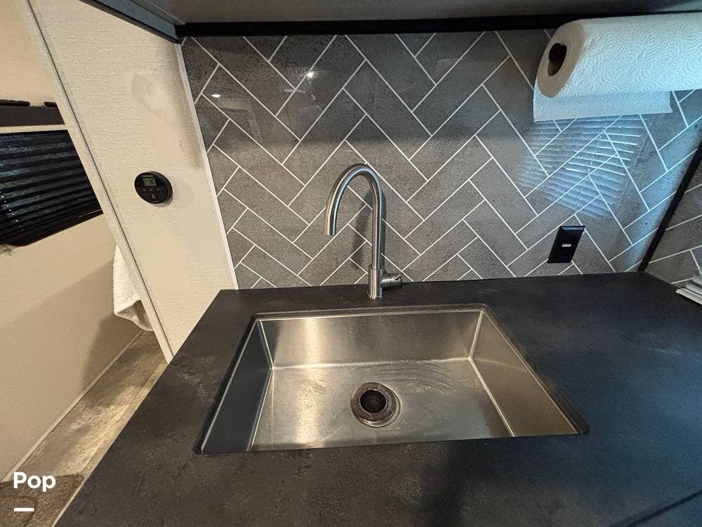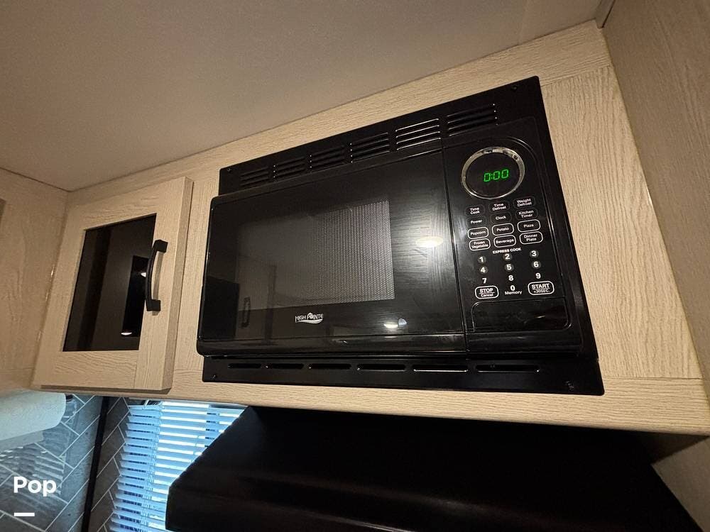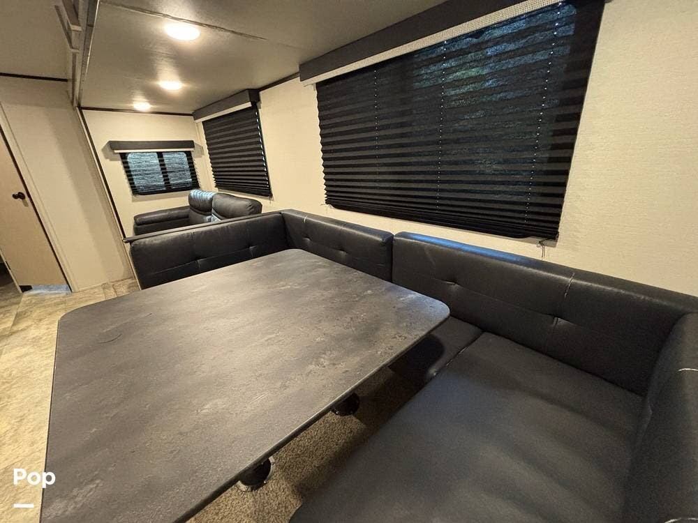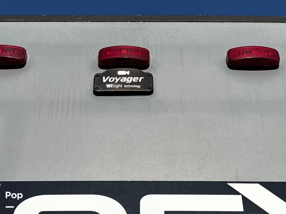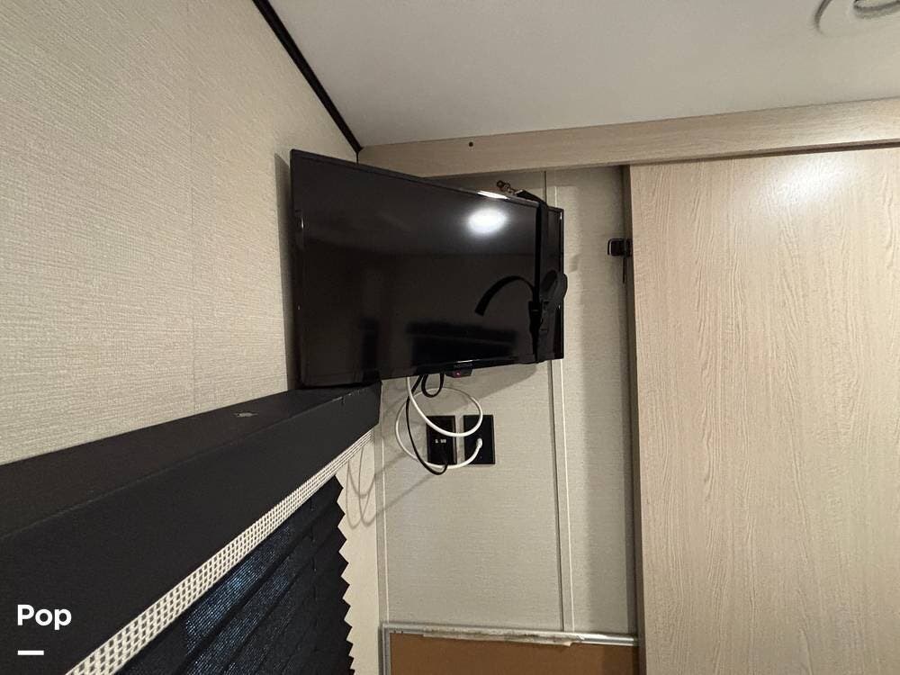 With an open layout, enjoy amenities such as a fireplace with a large television, a stereo with exterior speakers, an outdoor kitchen with a grill and a mini fridge, a solar panel, and pass-through storage.