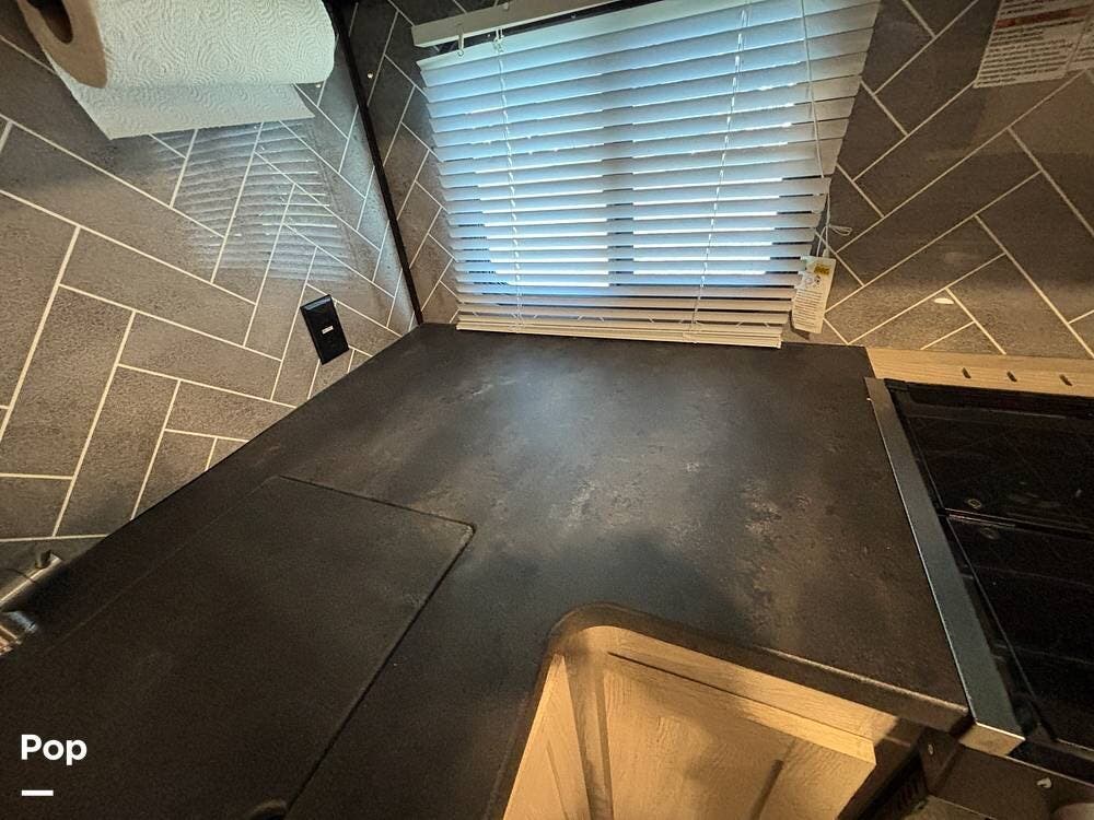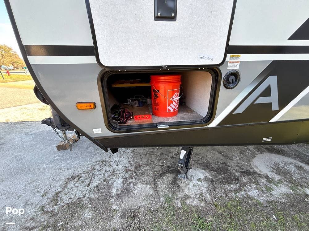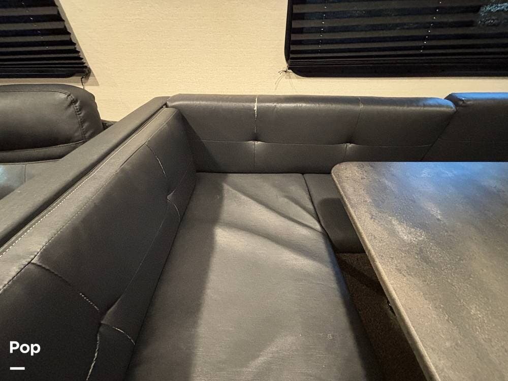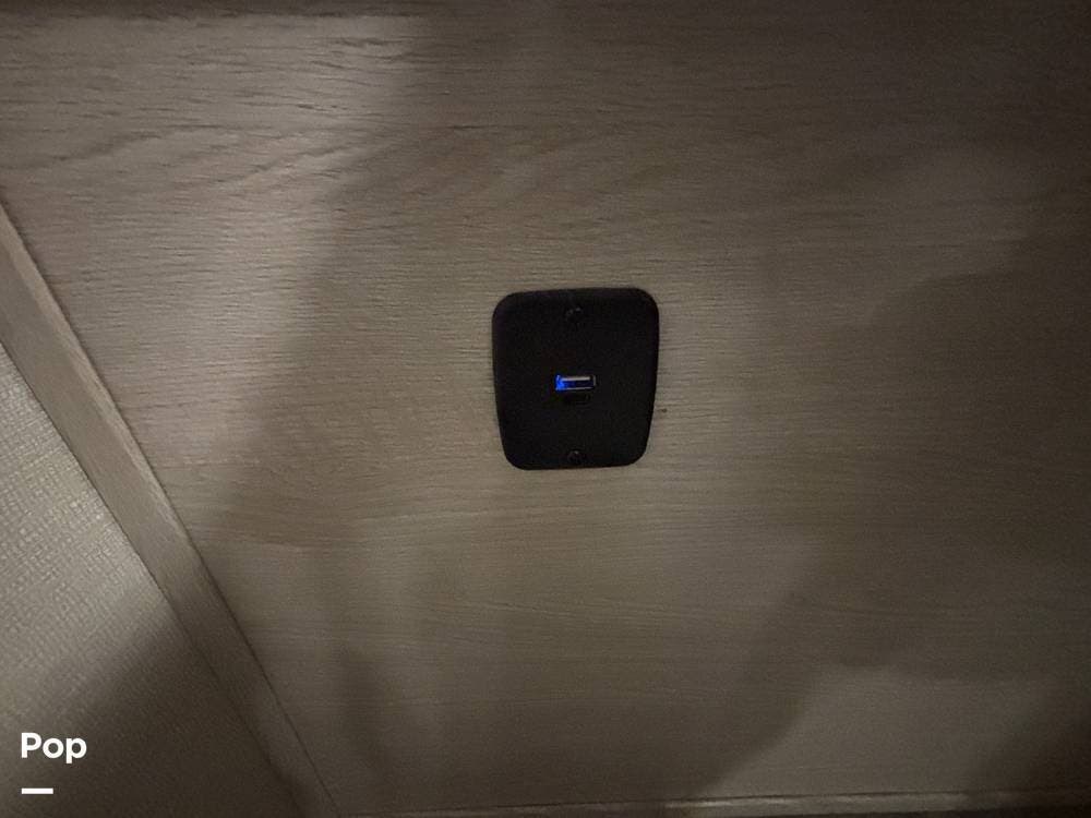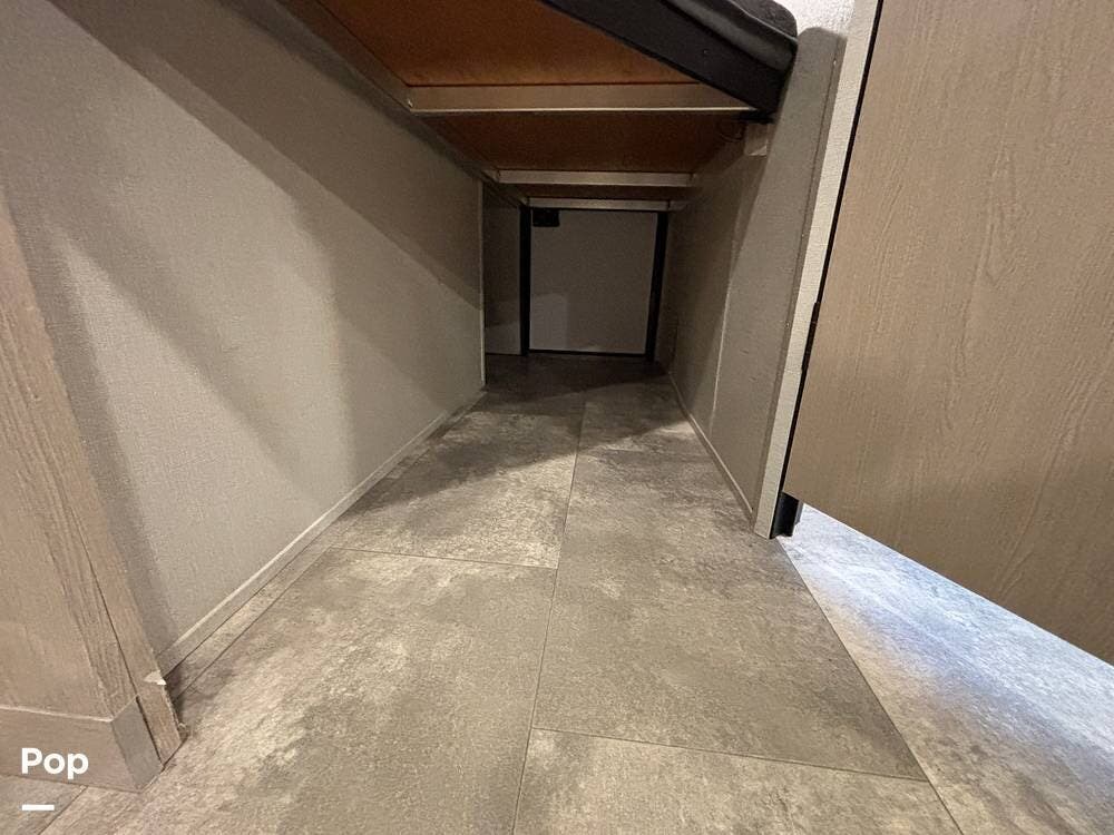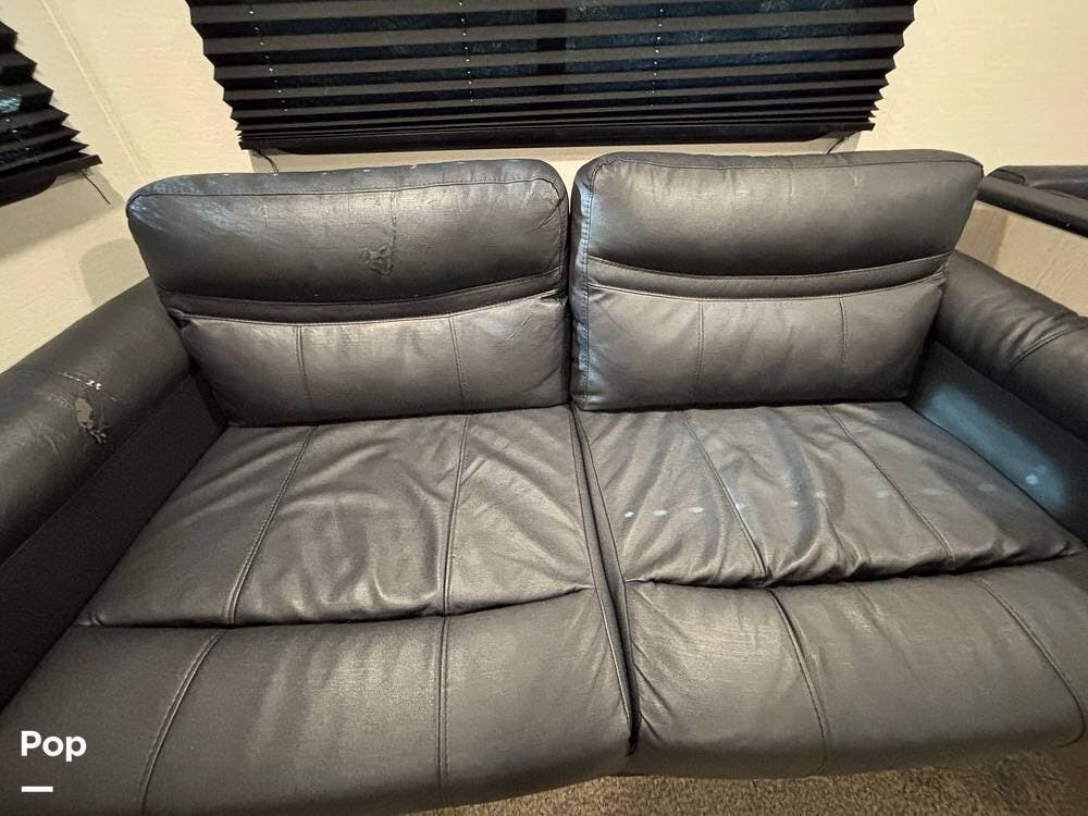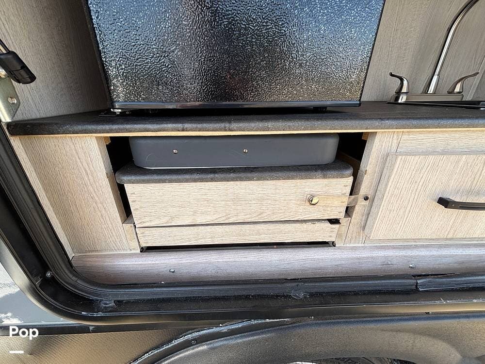 With an open layout, enjoy amenities such as a fireplace with a large television, a stereo with exterior speakers, an outdoor kitchen with a grill and a mini fridge, a solar panel, and pass-through storage.