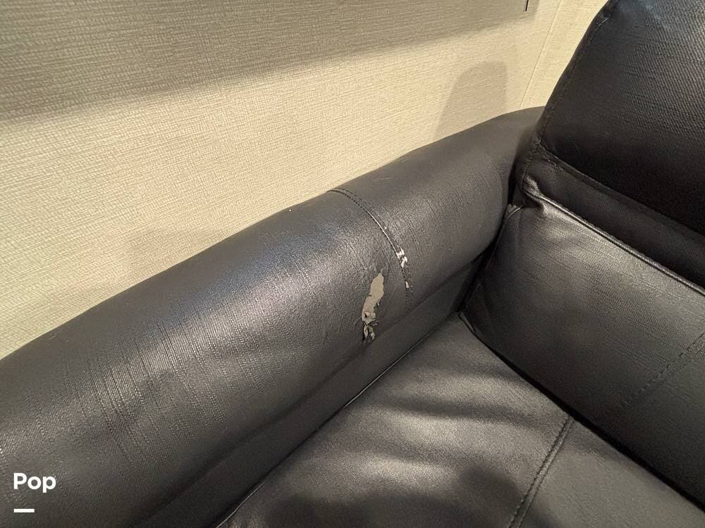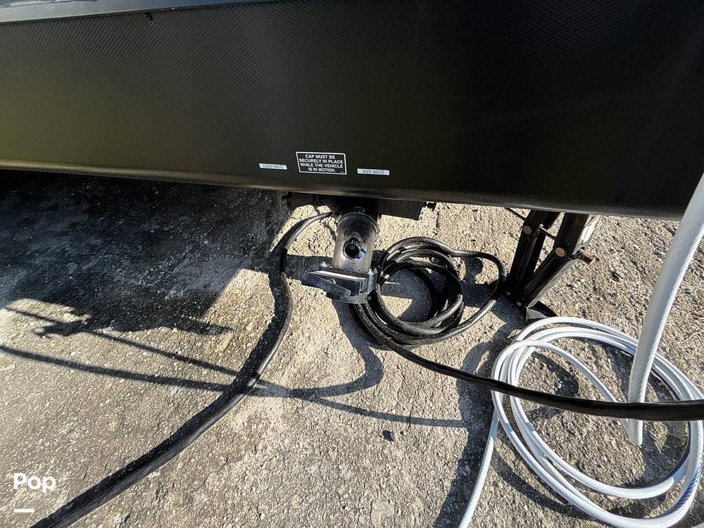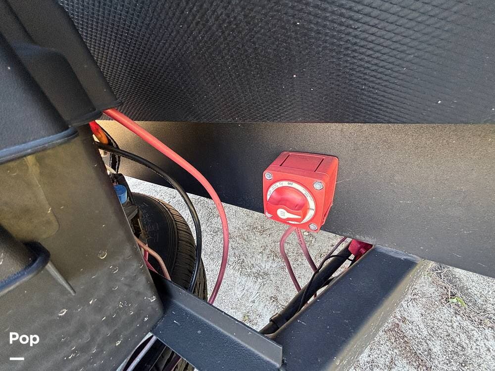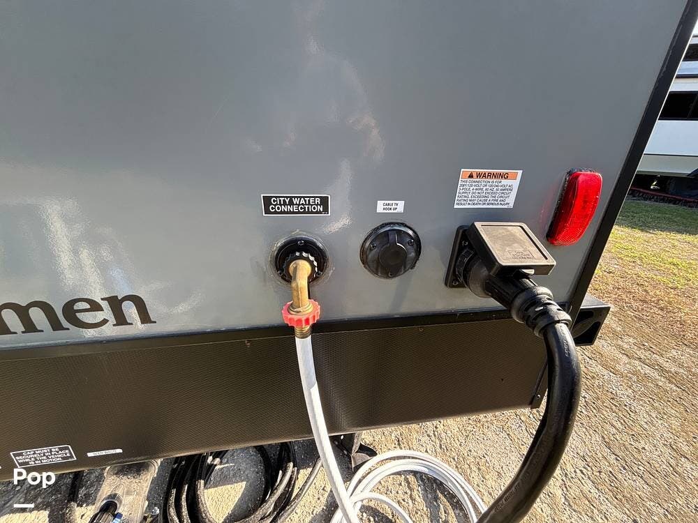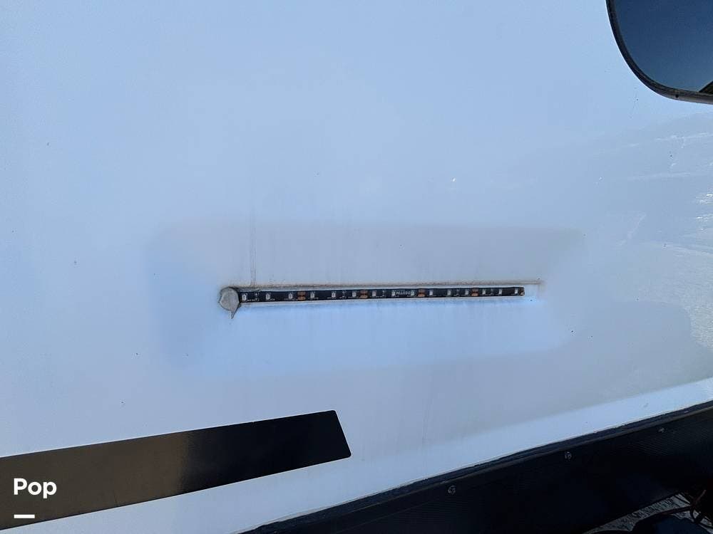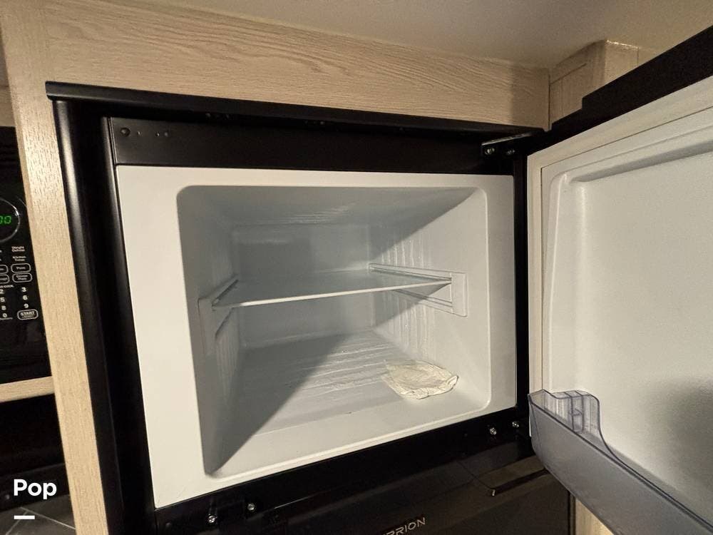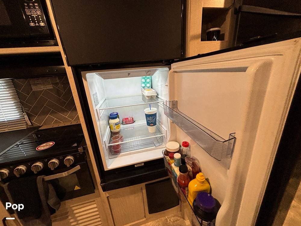 With an open layout, enjoy amenities such as a fireplace with a large television, a stereo with exterior speakers, an outdoor kitchen with a grill and a mini fridge, a solar panel, and pass-through storage.