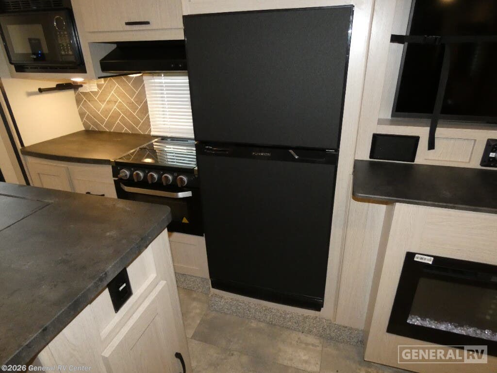 The 2023 Coachmen Apex Ultra-Lite 293RLDS is a marvel of modern RV design, offering a spacious and luxurious retreat on wheels. At 34 feet in length, this travel trailer is designed for comfort and convenience, making it perfect for families or groups of up to six. The centerpiece of this delightful model is its rear living area, where you can unwind on plush theater seating and enjoy the warmth of a cozy fireplace. The dinette offers a perfect spot for meals or game nights, and it easily converts into an additional sleeping area. The heart of this RV is its well-equipped center kitchen, featuring a three-burner cooktop and a mid-size refrigerator to store all your culinary essentials. The layout ensures that everything you need is within arm's reach, making meal preparation a breeze. The front bedroom, with its inviting queen bed, promises restful nights and ample storage with overhead cabinets and wardrobe spaces. The bathroom, conveniently located in the center, includes a shower with a plastic/glass enclosure, providing all the comforts of home. Outside, the 18-foot powered retractable awning creates a perfect shaded area for relaxation or entertaining. Plus, the camp kitchen and outside TV setup are ready to elevate your outdoor living experience. With its thoughtful design and array of features, the Apex Ultra-Lite 293RLDS is your ticket to unforgettable adventures. For more information, visit your nearest General RV dealership.