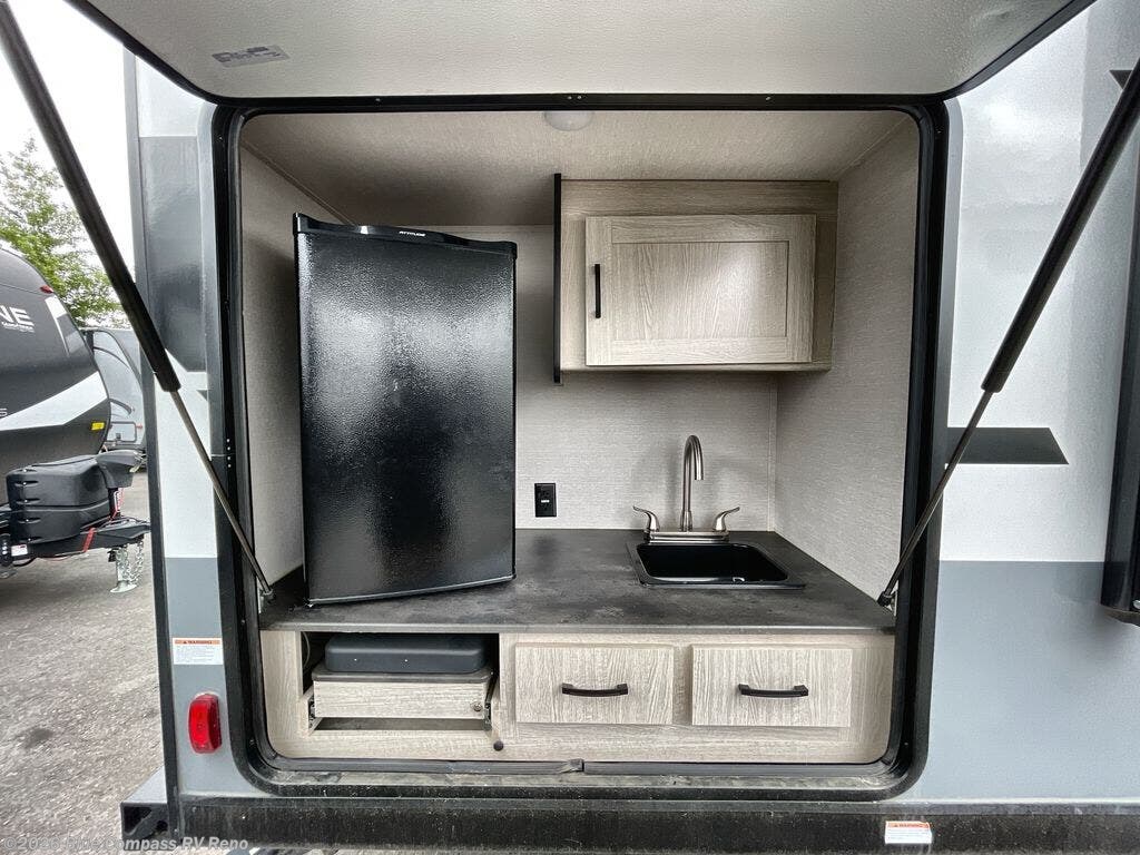 Escape the city life for relaxing weekend in this spacious travel trailer. A large slide out provides plenty of space to relax on the sofa or dine at the booth dinette. There is an entertainment center here with a 32" LED TV if you love to watch movies at night, and the full rear bath will allow you to stay clean throughout your trip. The chef can choose to cook indoors on the three burner cooktop, or head outdoors to cook on the outside kitchen! And when it's time to turn in for the night you'll have your own private bedroom up front with a queen bed and dual wardrobes, and any guests you have can sleep on the sofa and booth dinette!