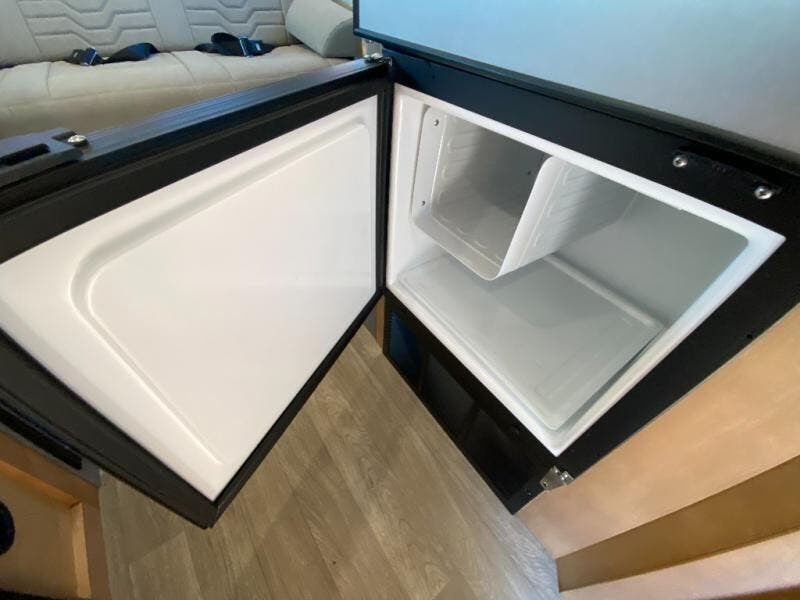 This all-wheel drive coach is perfect for trips near and far. Once you park, you can swivel the captain's seats around to enjoy lunch at the removeable table, and you can freshen up in the convenient wet bath before heading out to stretch your legs. There is an induction cooktop, a round sink, plus a Nova Kool compressor refrigerator for your perishables. The two jump seats and rear power sofa will convert to a comfortable bed at night, and the lagun table in between will allow you to play a game of cards before bed. And don't worry about storage space since this model includes overhead compartments and a wardrobe to keep your clothes wrinkle-free!