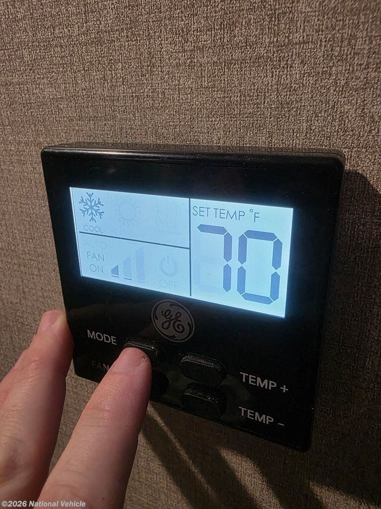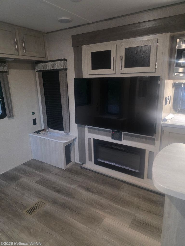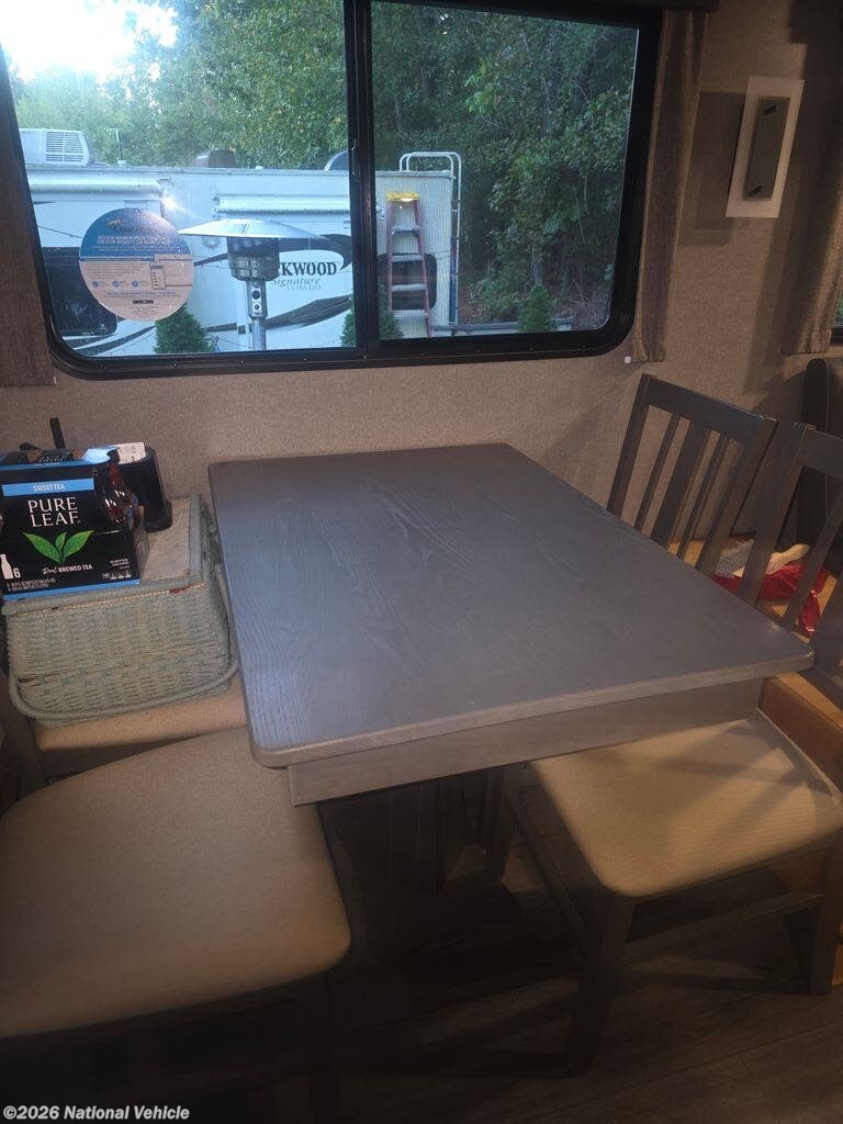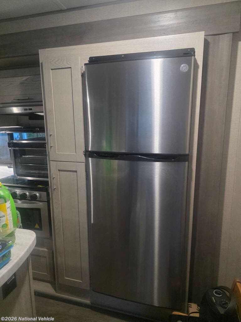 The well-equipped kitchen offers solid surface countertops, a large refrigerator, microwave, oven, stove, and ample cabinetry, making it easy to prepare meals on the go. A free-standing dinette adds a dedicated space for dining, games, or working remotely while traveling.