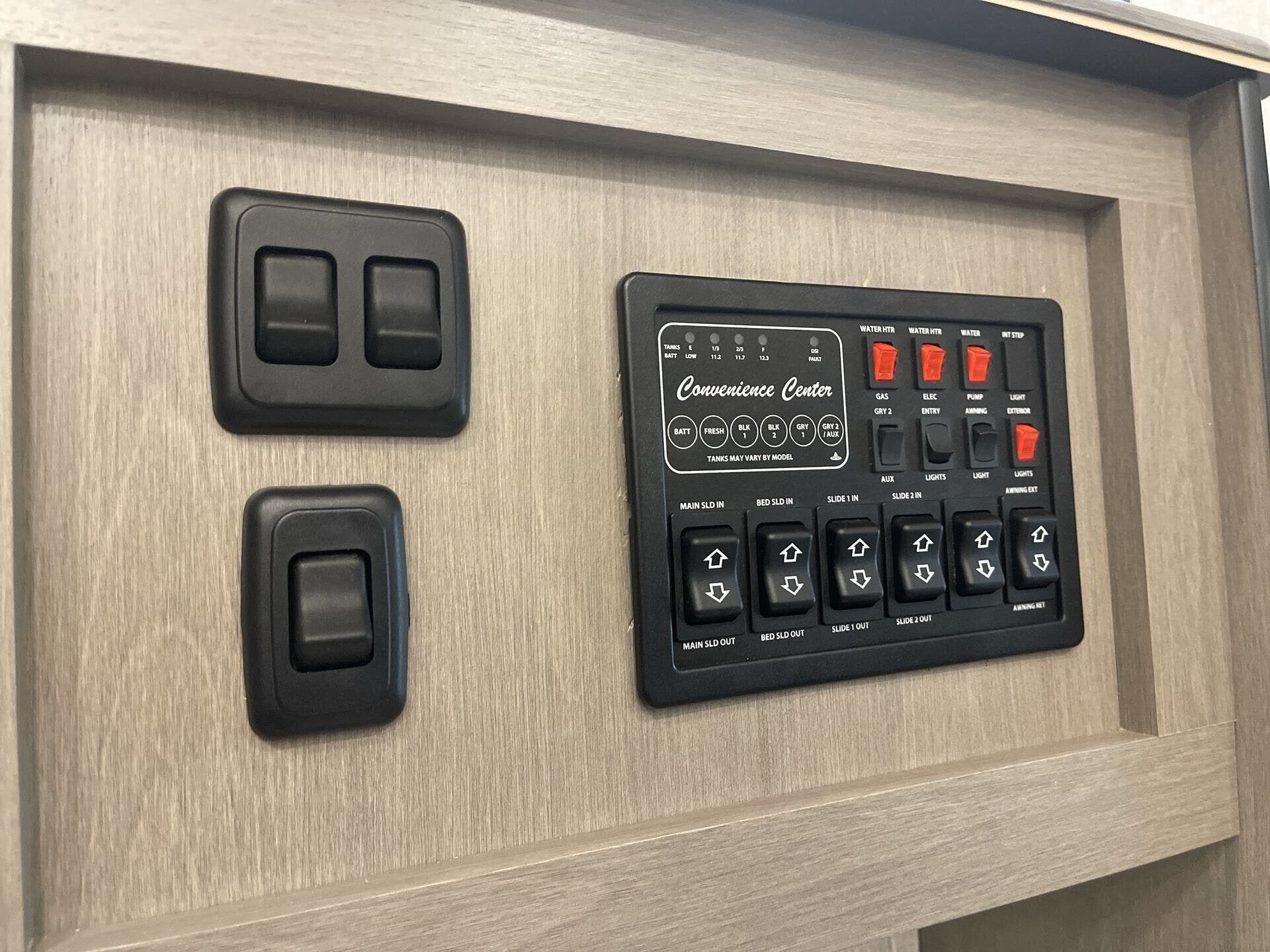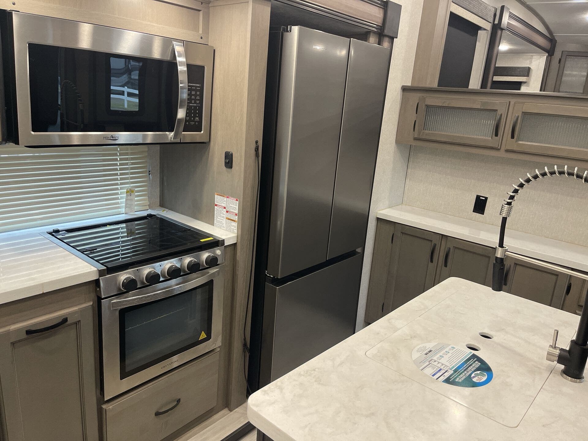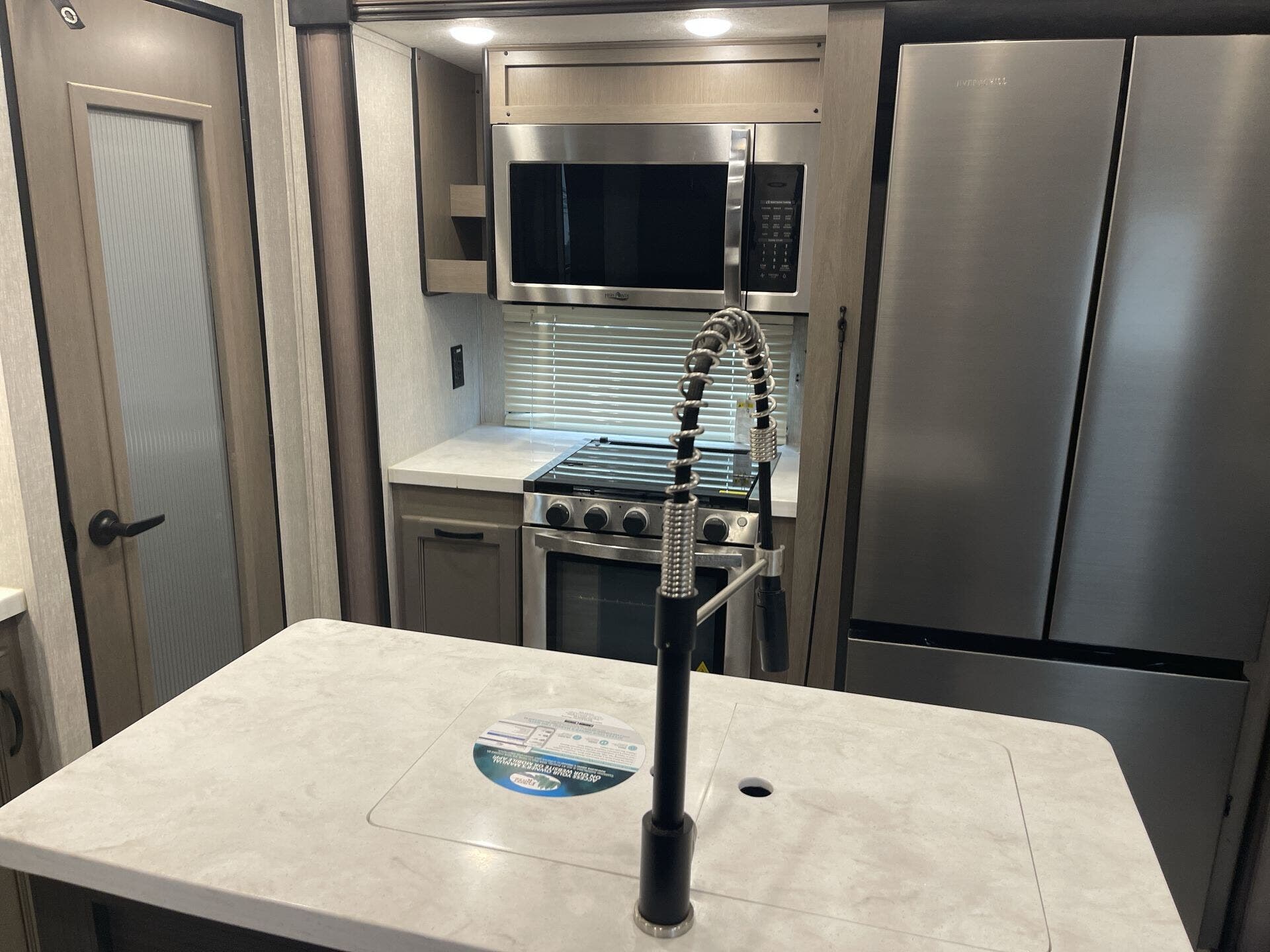 The 334FL floorplan blends a Mid Kitchen with a Front Living Area, arranged around a Central aisle that opens into a Rear Bath and Rear Bedroom. This layout offers dedicated zones for cooking, entertaining, and relaxing, while maintaining privacy and comfort at night. The five slide-outs dramatically enhance living space, creating a welcoming, airy environment whether you’re parked at a campsite or traveling between destinations. The floorplan types include Front Entertainment, Front Living Area, Mid Kitchen, Rear Bath, and Rear Bedroom, giving you flexible options for how you spend time indoors after a day of exploration.