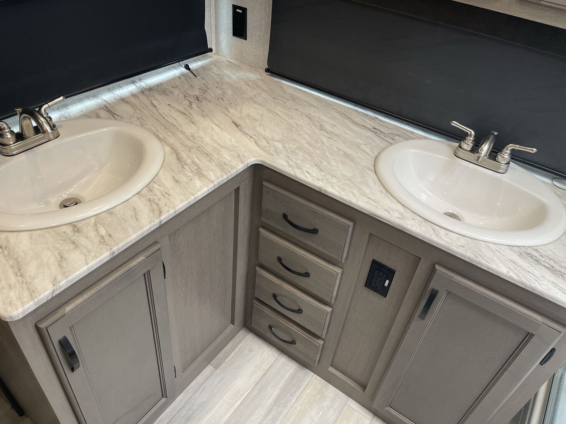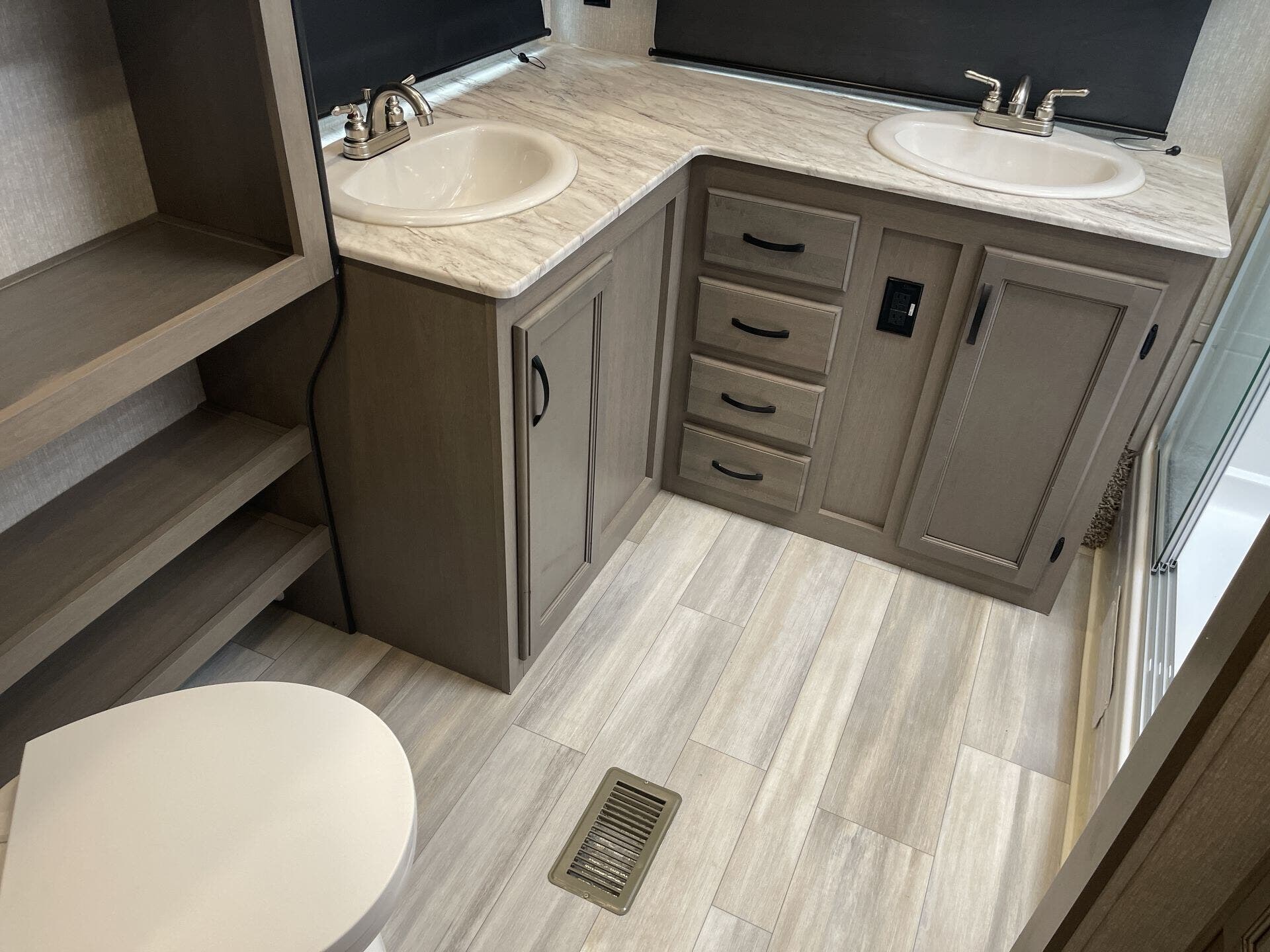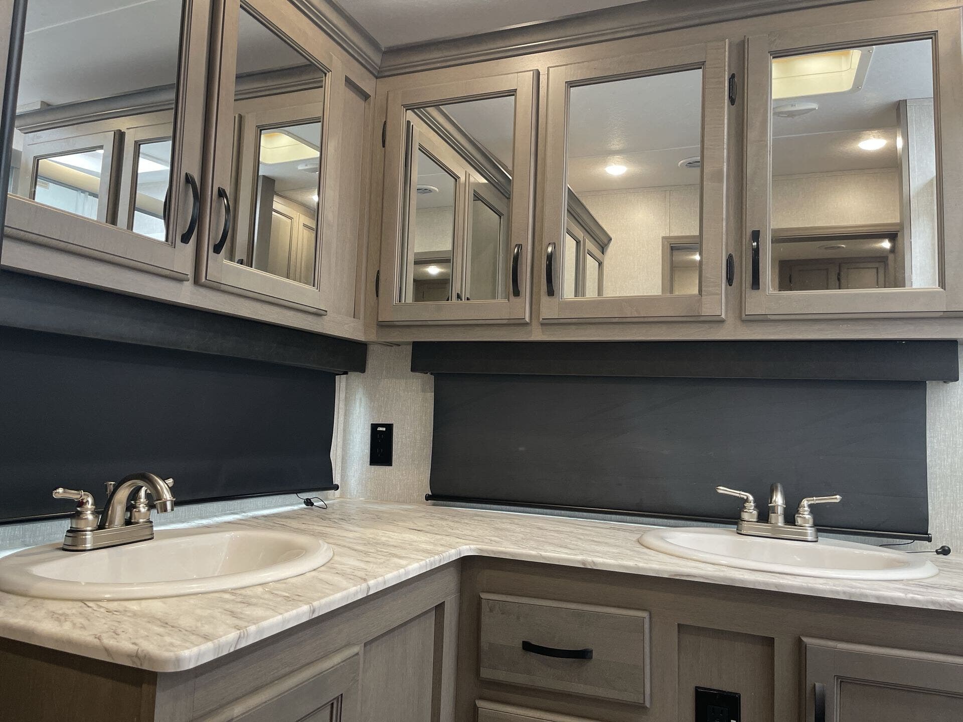 The 334FL floorplan blends a Mid Kitchen with a Front Living Area, arranged around a Central aisle that opens into a Rear Bath and Rear Bedroom. This layout offers dedicated zones for cooking, entertaining, and relaxing, while maintaining privacy and comfort at night. The five slide-outs dramatically enhance living space, creating a welcoming, airy environment whether you’re parked at a campsite or traveling between destinations. The floorplan types include Front Entertainment, Front Living Area, Mid Kitchen, Rear Bath, and Rear Bedroom, giving you flexible options for how you spend time indoors after a day of exploration.