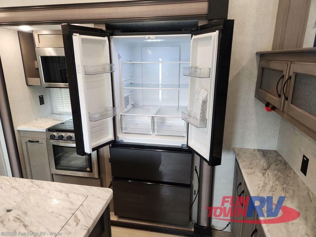 Camping or full-timing in this spacious fifth wheel will make the whole family happy. Your crew will love to visit in the front living area that included two tri-fold hide-a-bed sofas, theatre seating with a side table, plus an entertainment center for an optional 50" LED TV. The kitchen is any chef's dream with its kitchen island, residential pantry, plus a second pantry, and stainless steel appliances. And the free-standing table will allow you to dine just like you do at home. Head to the master suite to find a queen bed slide out with a king bed option, two dressers, plus a full rear bath with dual bath sinks!