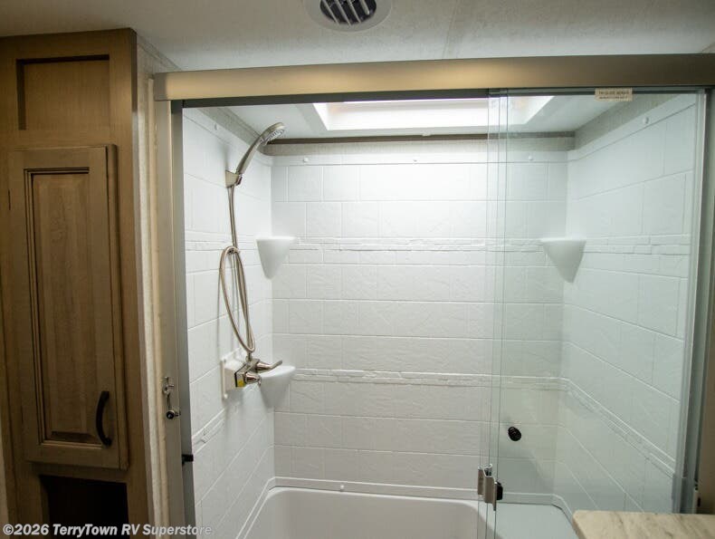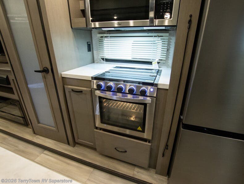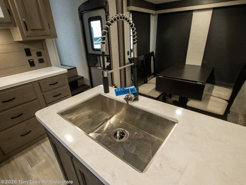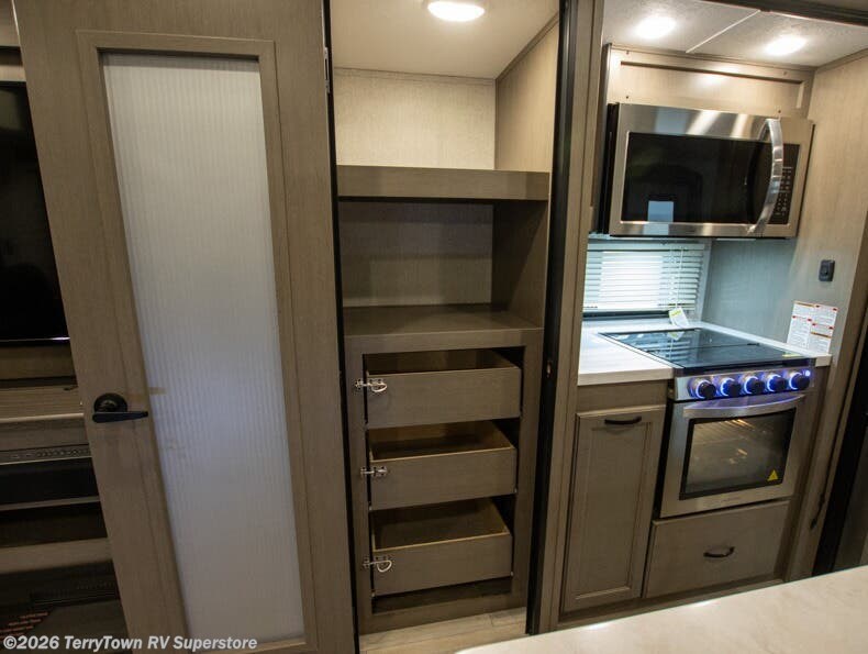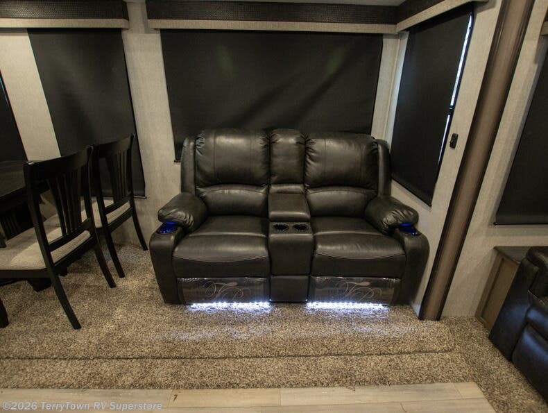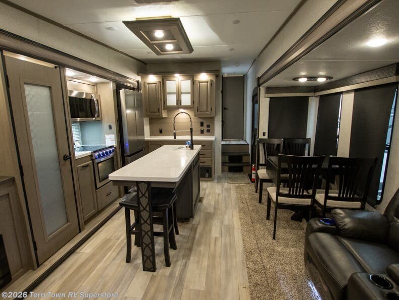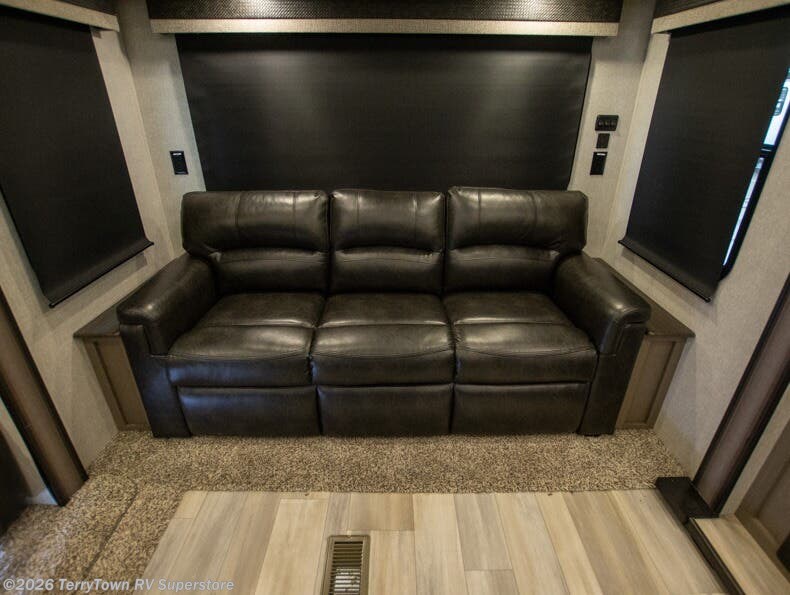 Are you wanting to trade out your busy work weeks for relaxing vacations? This fifth wheel can give you just that! Once you arrive at your destination, set up the 16' power awning with LED lights and enjoy some fresh air before you unpack your bags. The chef can start lunch on the three burner residential cooktop, and there is an island with two barstools if the little ones want to color while they wait on their food. This model also includes a residential pantry, a second pantry, plus a hutch with upper and lower cabinets. Everyone can take turns cleaning up in the full bath that includes a spacious 30" x 50" shower with a seat, a large privacy dome skylight, plus LED motion sensor lighting for nighttime use. When it's time to call it a night, you'll enjoy the queen bed slide out in the front bedroom, while your guests take the rear tri-fold hide-a-bed sofa!