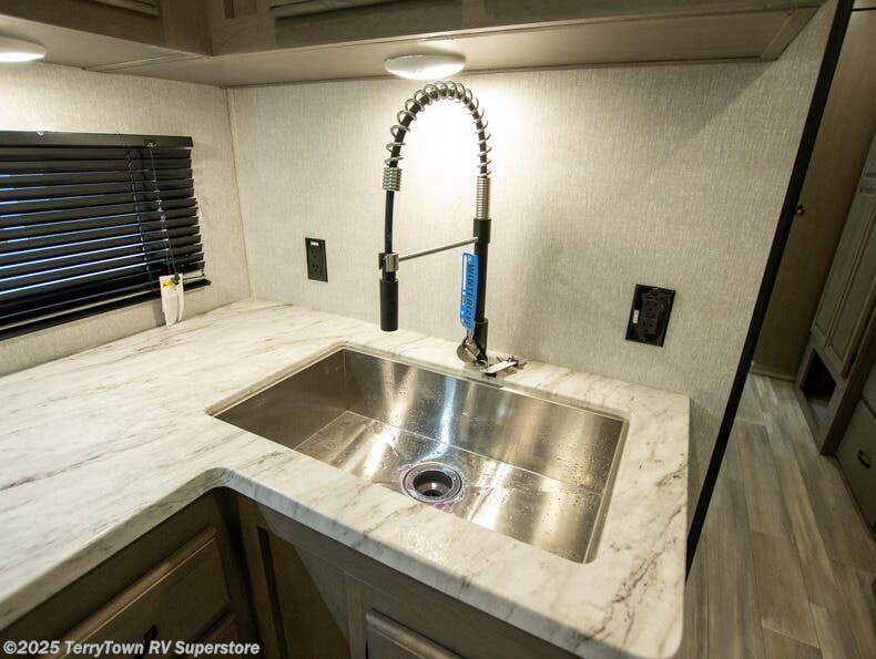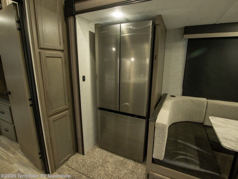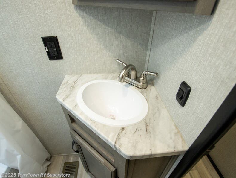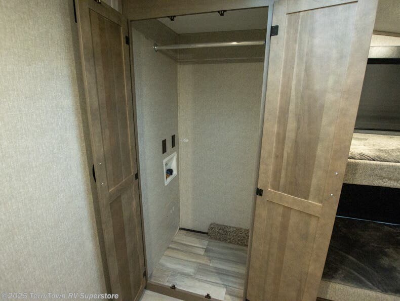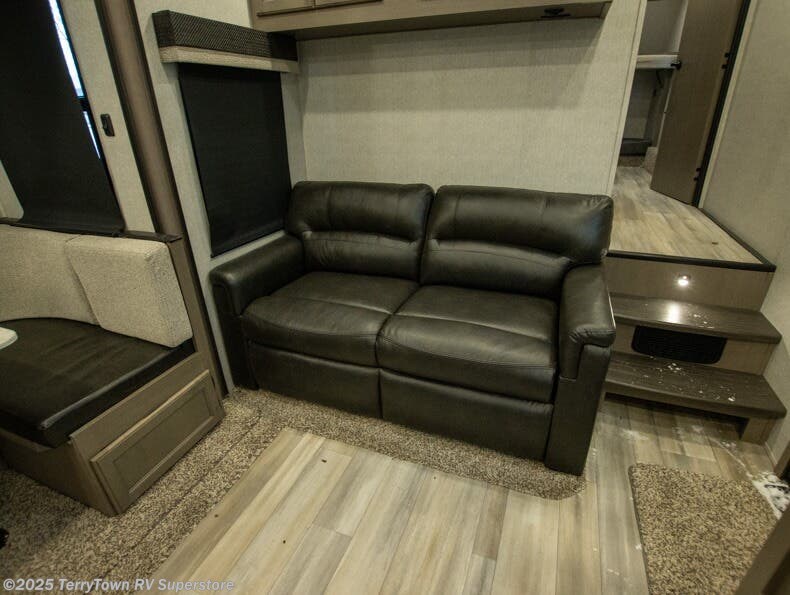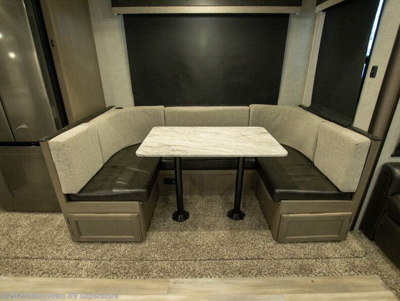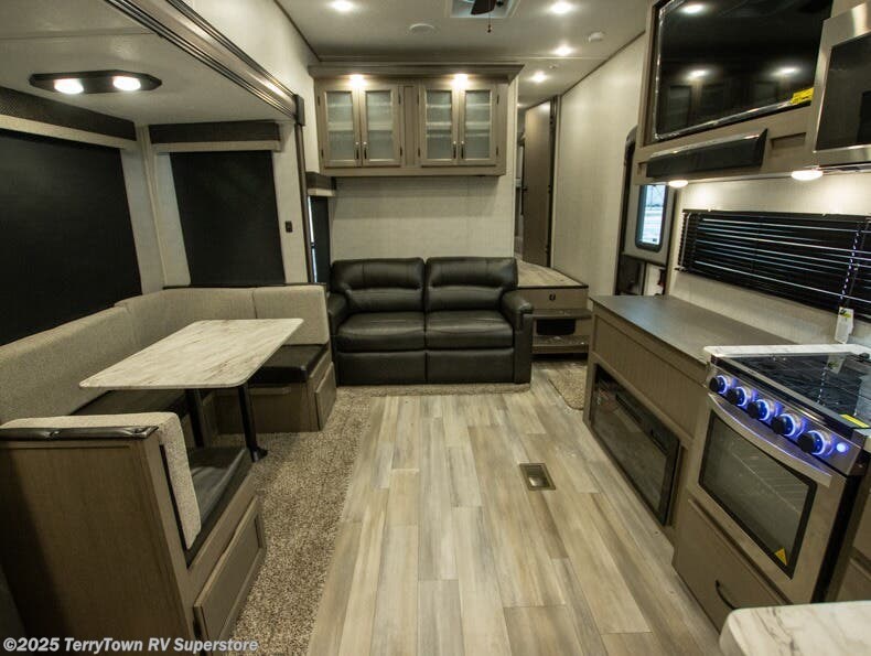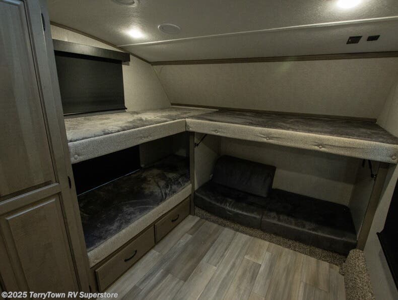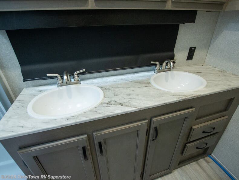Two full baths, double slides, and sleeping space for ten make this the perfect fifth wheel for families or larger groups. The front bunkhouse includes triple bunks, a hide-a-bed cube sofa, plus a wardrobe for clothes. You will love having the master suite all to yourselves with a queen bed slide out, a wardrobe, plus dual bath sinks in the rear bath. Everyone can meet in the main living area in the evening to dine around the U-shaped dinette or relax on the tri-fold hide-a-bed sofa. You can add an optional 50" TV to the entertainment center if you enjoy movies while you camp. Some of your favorite features in the kitchen will be the extra deep farm style single basin sink, the stainless steel appliances, and the large transom window at the cooktop for a great view outdoors!